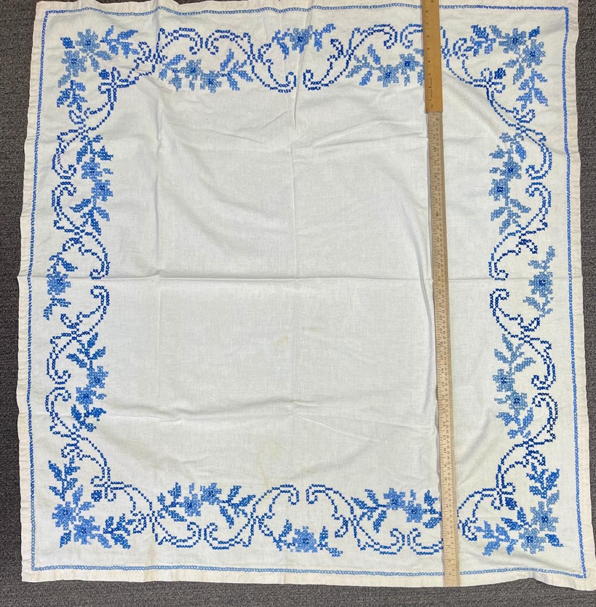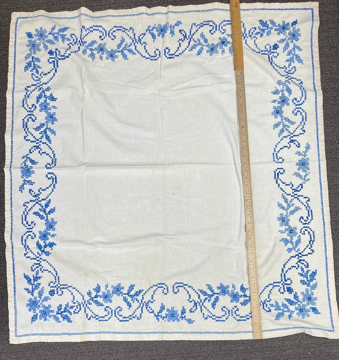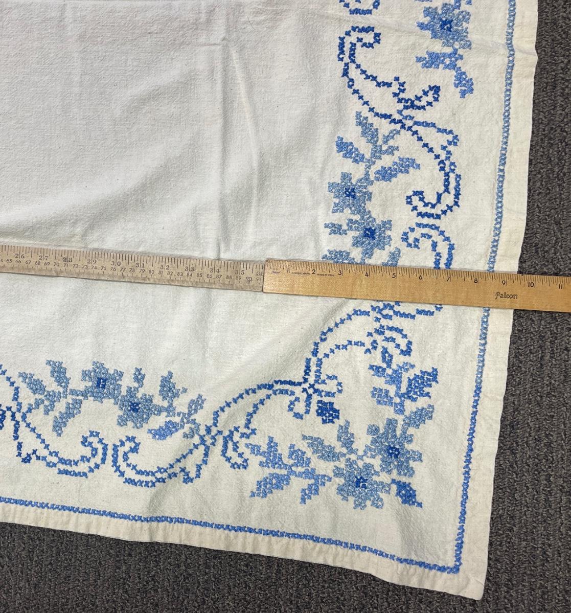 Vintage Cotton Tablecloth, square embroidered flower pattern border, blue & white