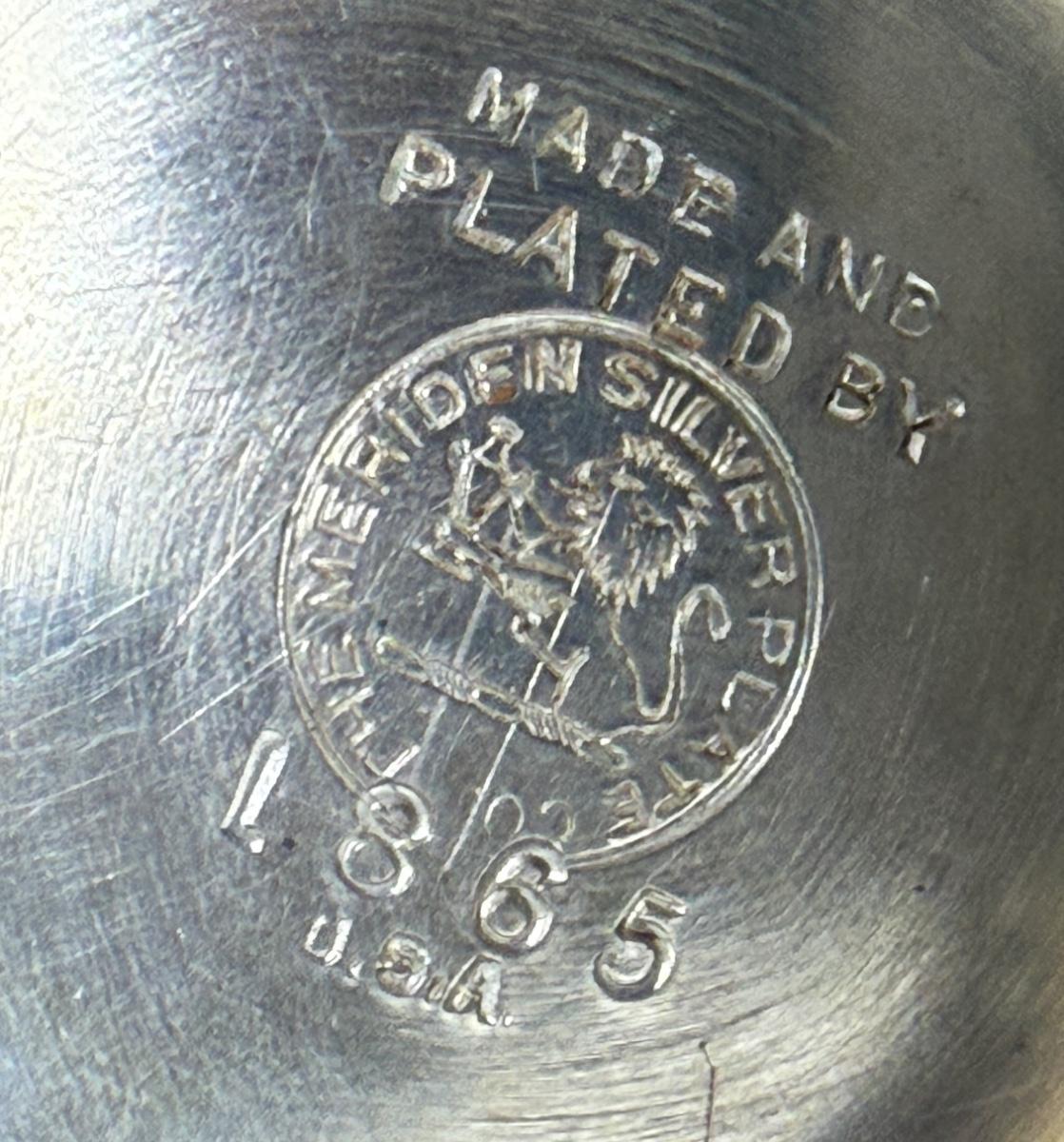 Meridian Silver Plate Company. Based on marks, this item was produced in 1865. Lid has a slot for a spoon, but note that a spoon is not included. Nice patina. Good condition. Approx. 14.5" long and 7.5" tall.