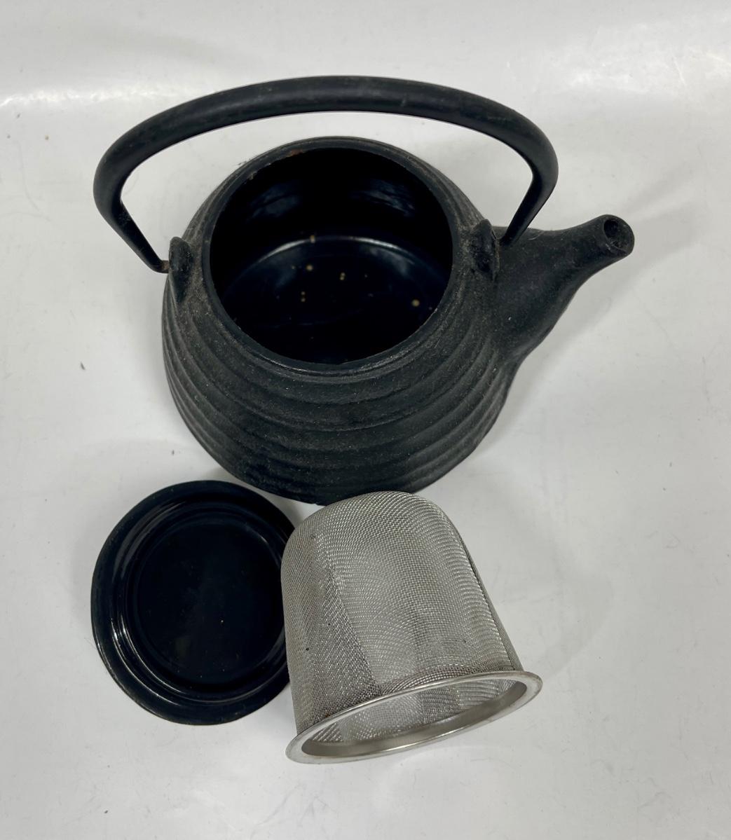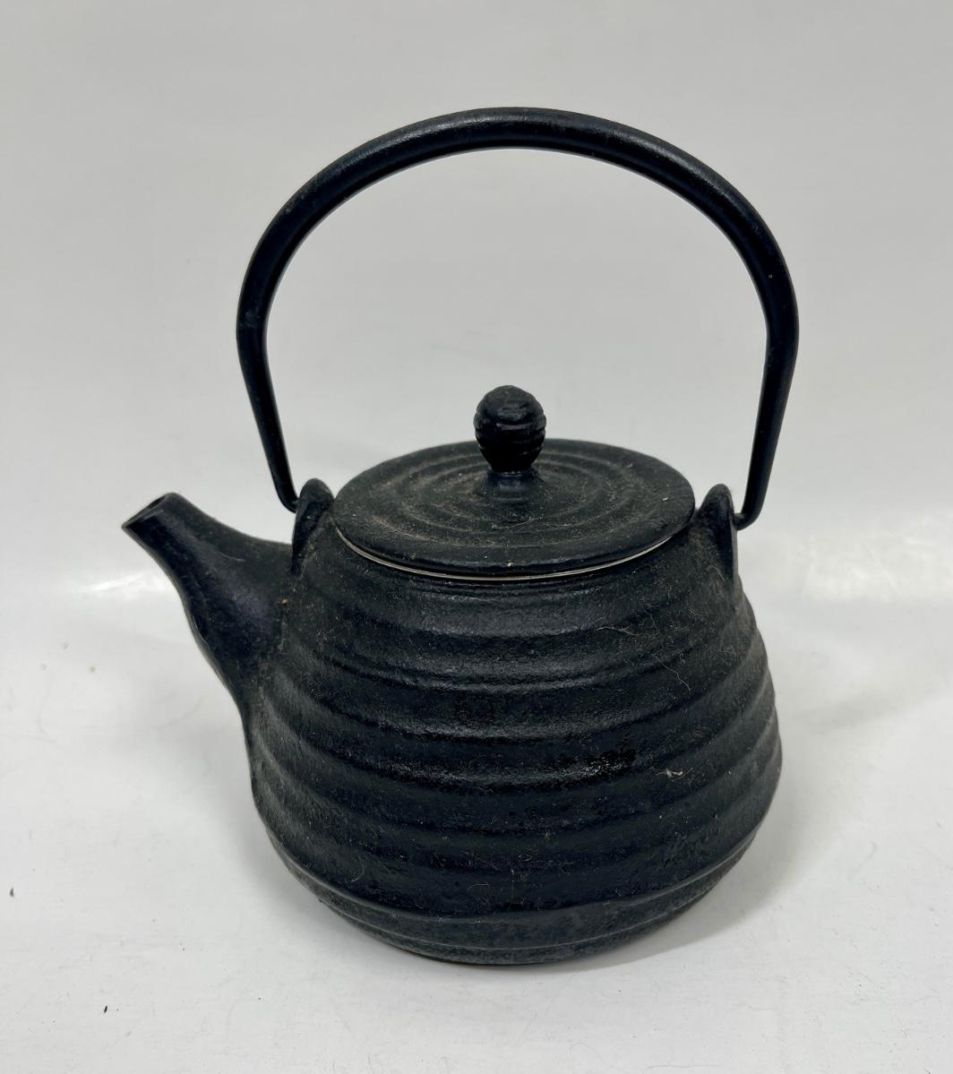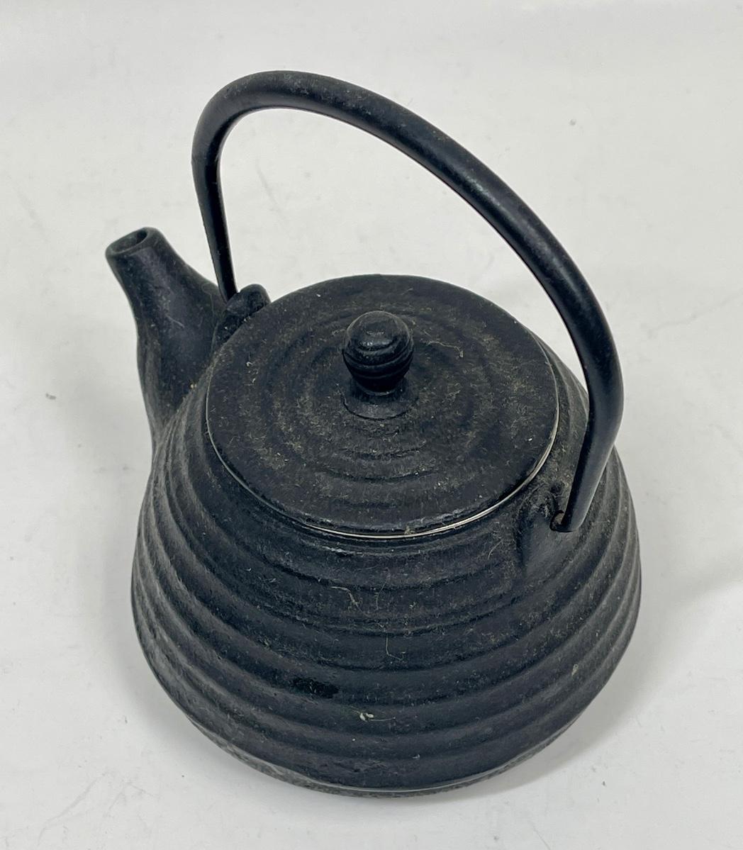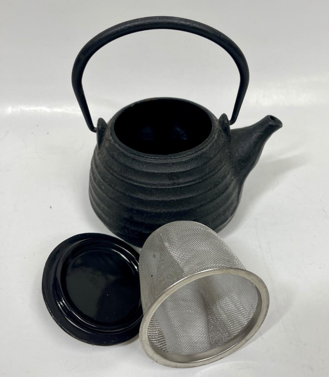 Classic teapot in cast iron with a tea strainer and enameled interior. Suitable for all types of stoves. Pot is 3" tall, measures 6" at the handle.
