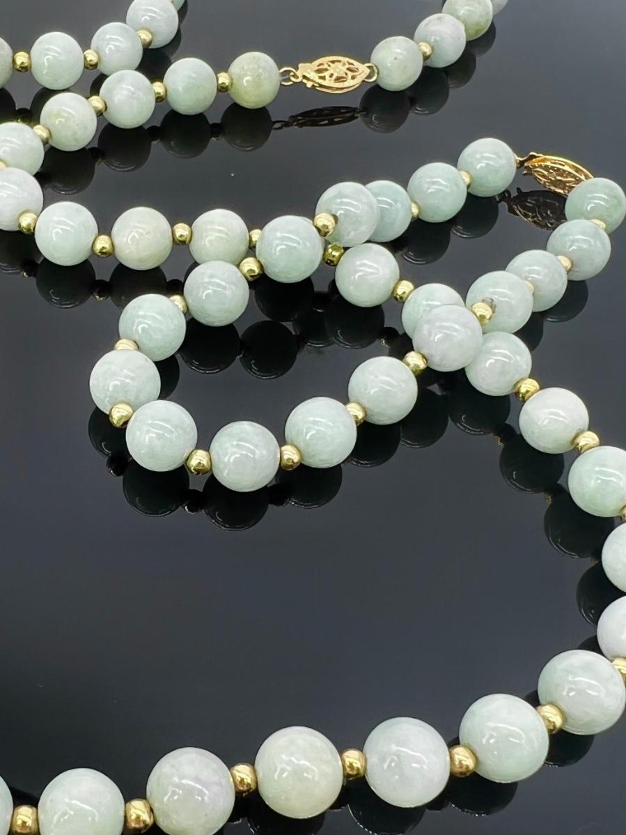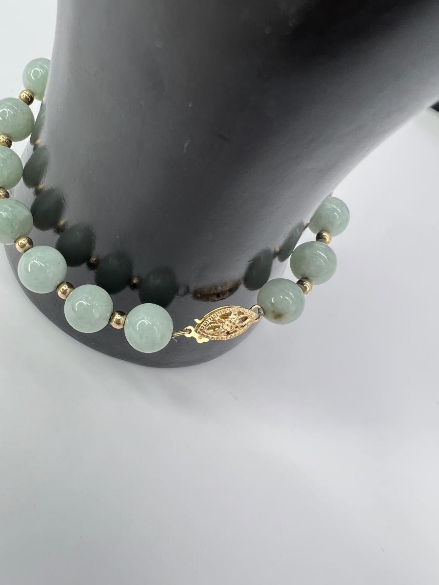 14K yellow gold clasps ~ Necklace has 62 Jade beads & measures 25” ~ Bracelet has 17 jade beads & measures 7” ~ Stamped 14k on necklace & bracelet clasps ~ Necklace = 57grams ~ Bracelet = 16grams ~ 73 grams total