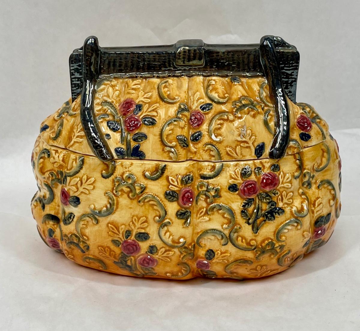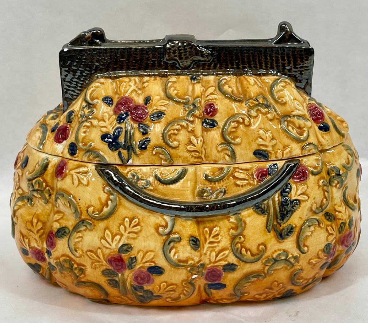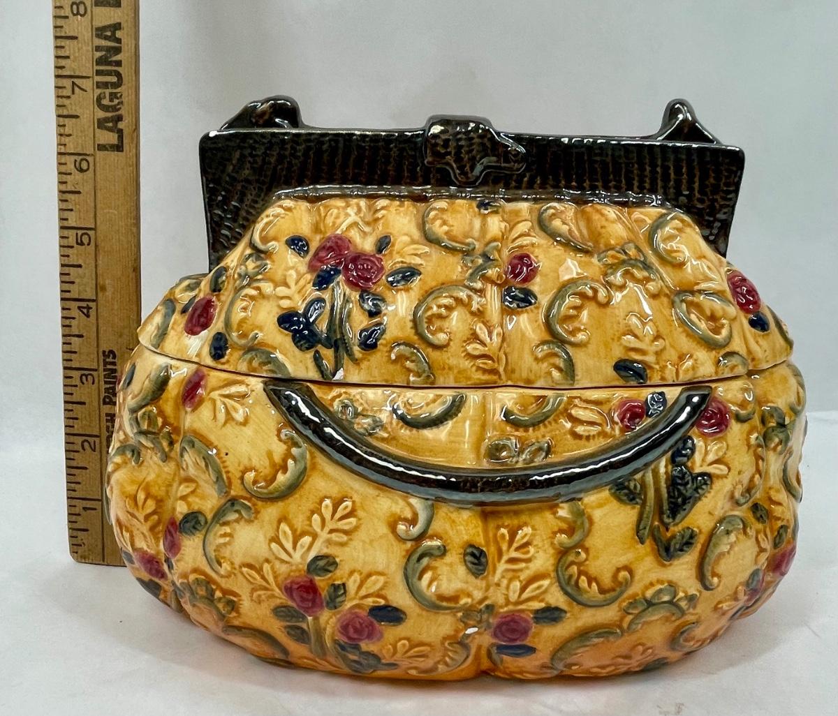 Vintage Rose Covered Yellow Clutch Purse Ceramic Cookie Jar