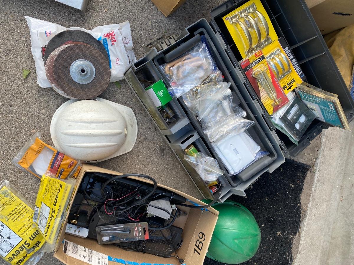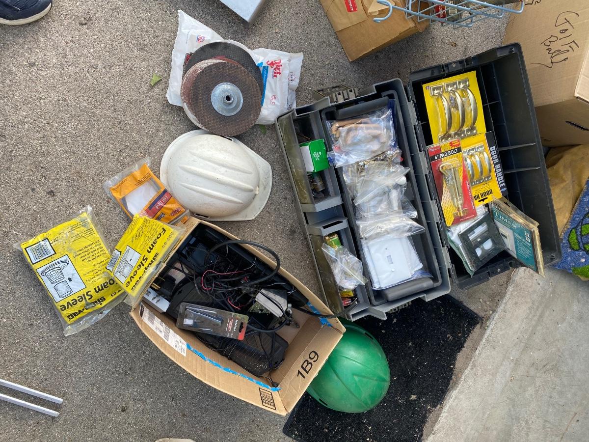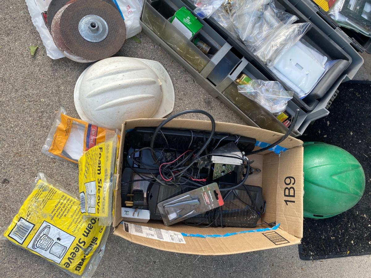 SH78 Toolbox full of miscellaneous hardware, hard hats, box with solar charging components