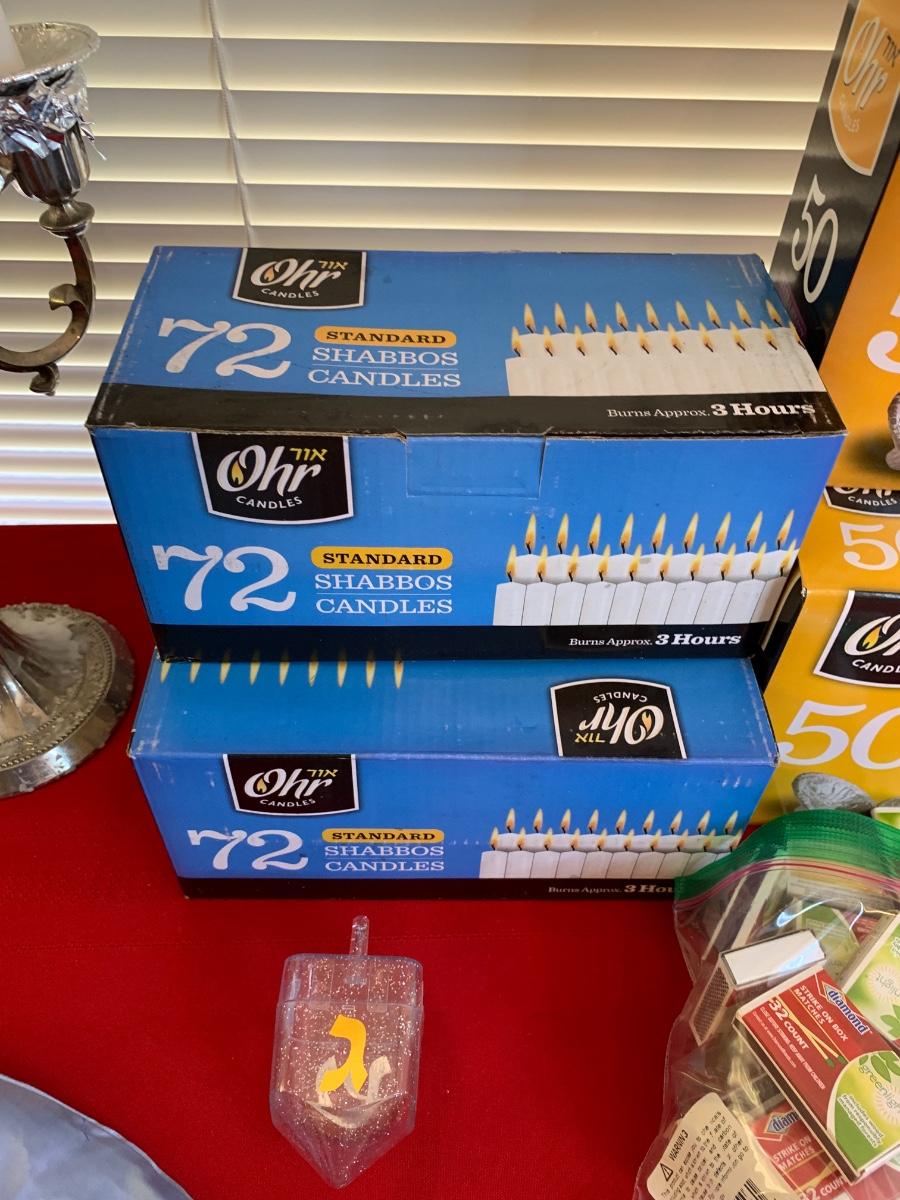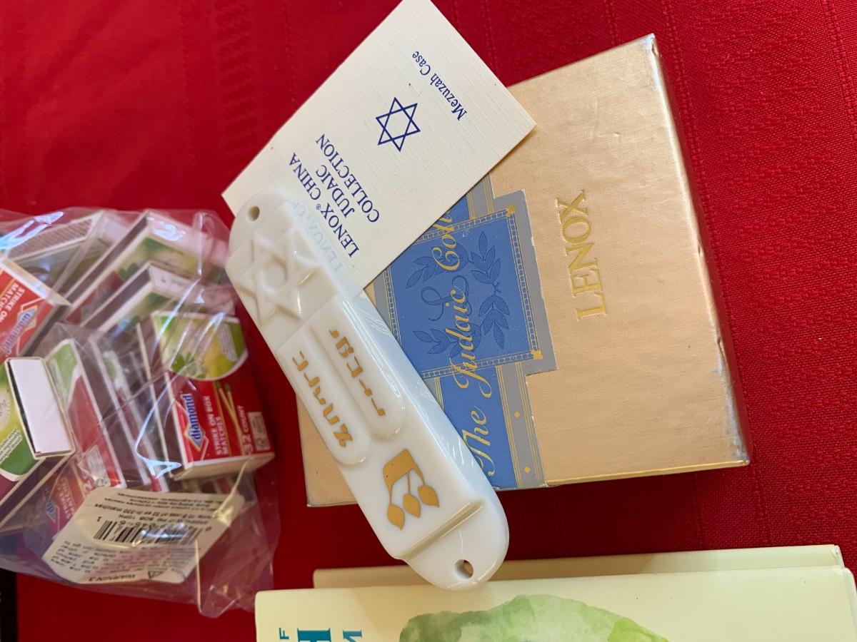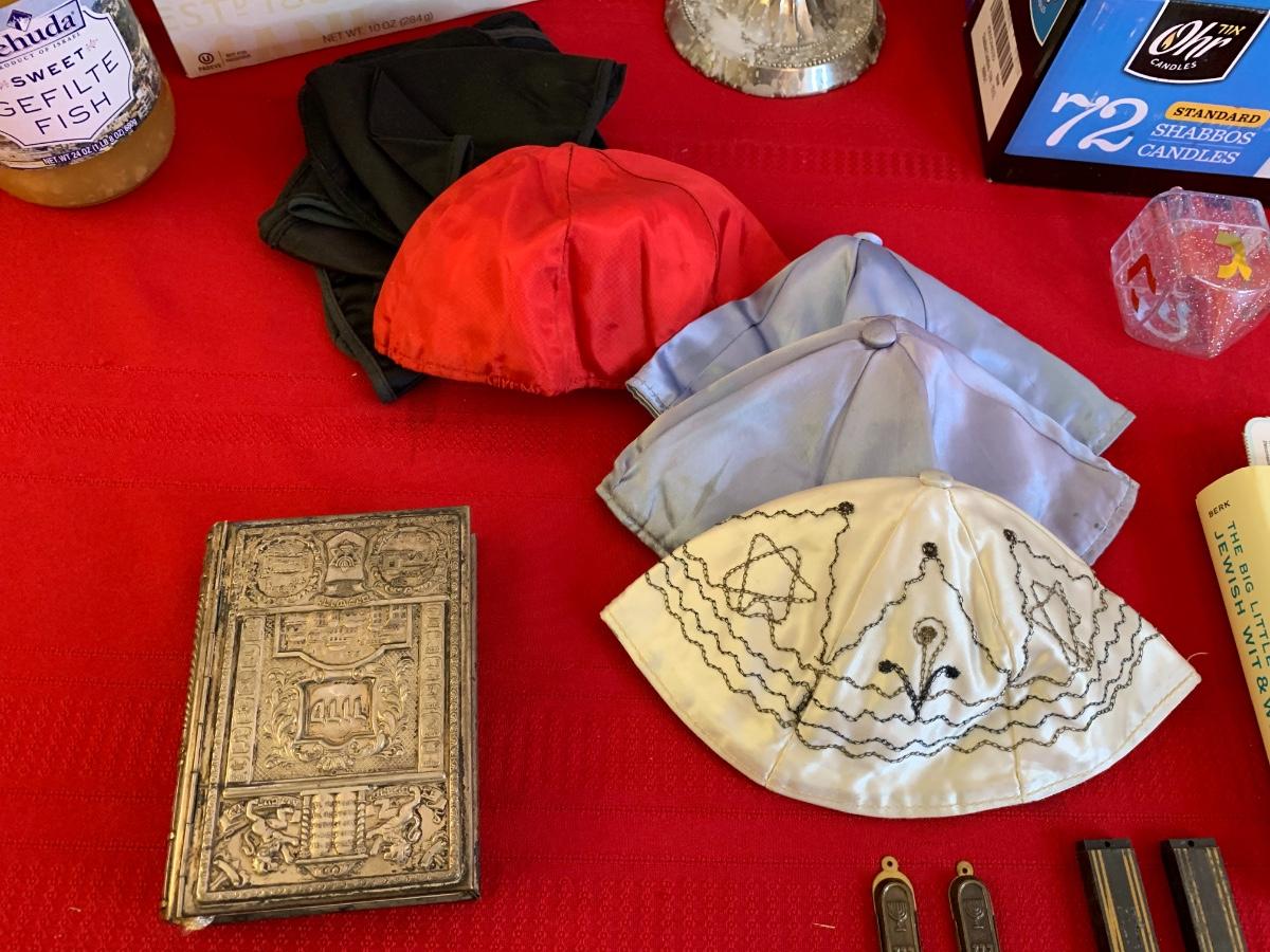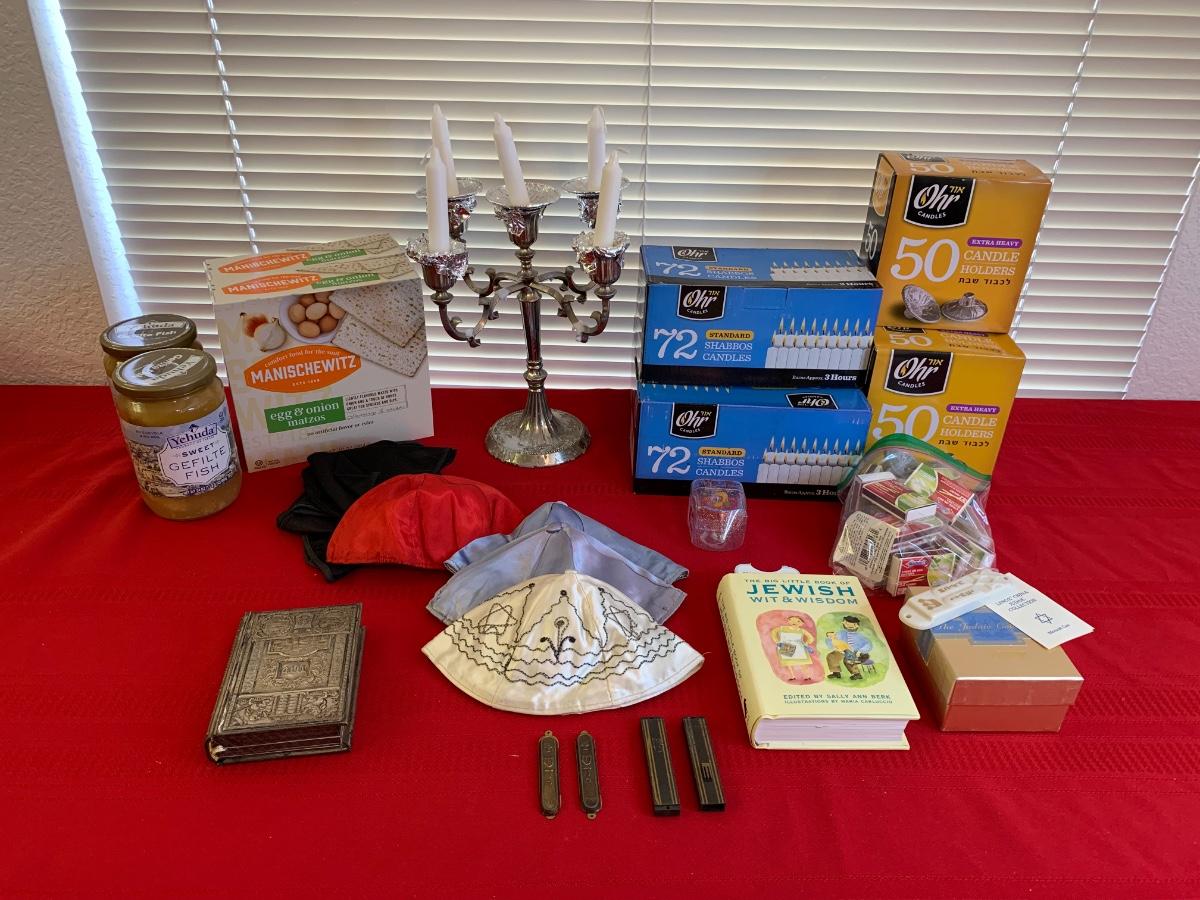 Includes Standard Shabos candles and holders, a Metal cased Torah, Jewish wit and wisdom book, a collection of Yarmulke, a plastic dreidel, Kosher food items (unopened, in date) & two small prayer books.