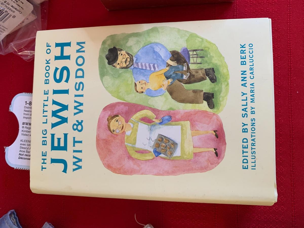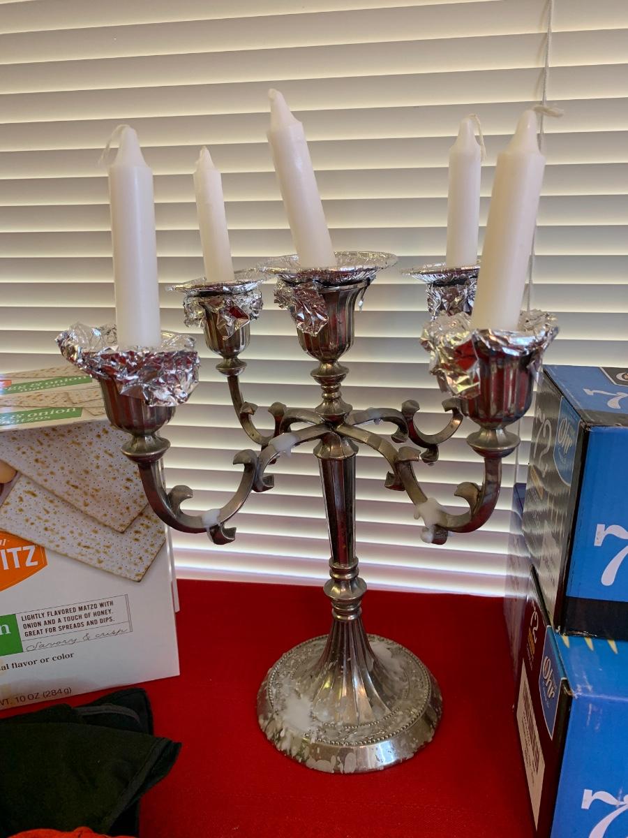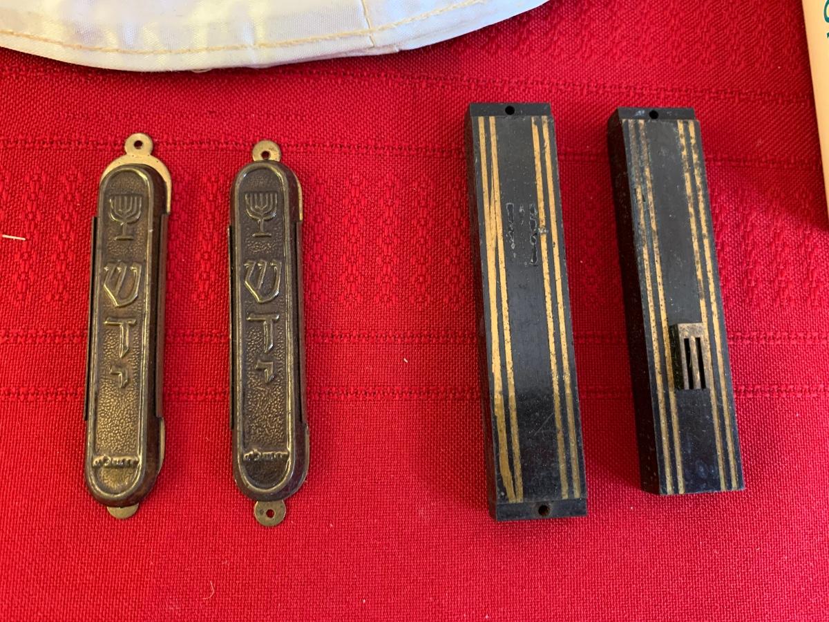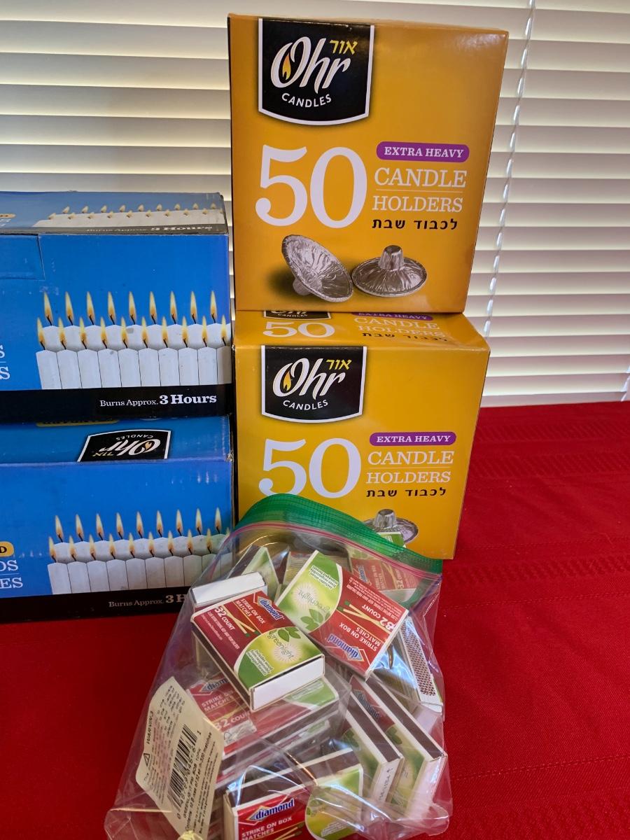 Includes Standard Shabos candles and holders, a Metal cased Torah, Jewish wit and wisdom book, a collection of Yarmulke, a plastic dreidel, Kosher food items (unopened, in date) & two small prayer books.