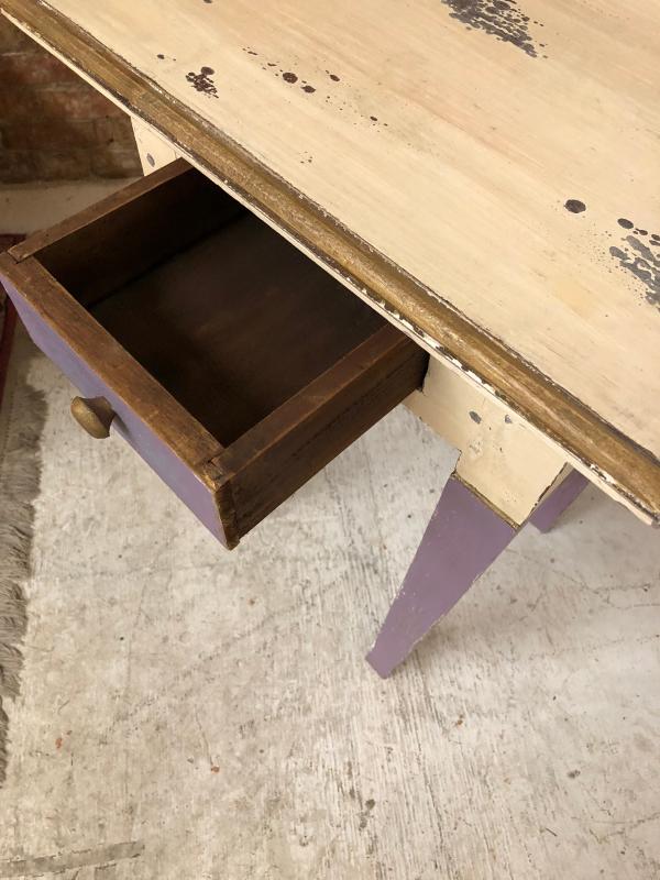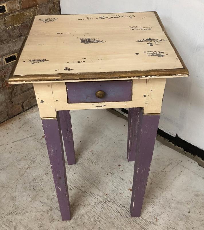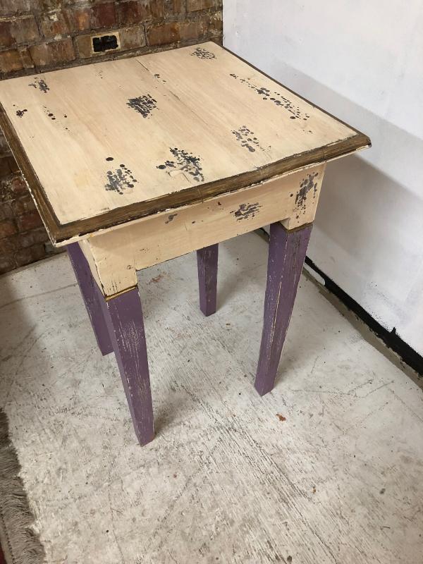Table with painted finish, chippy paint measures 20" square, 30" tall.