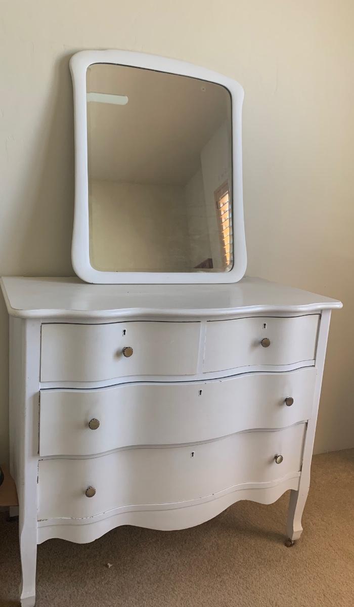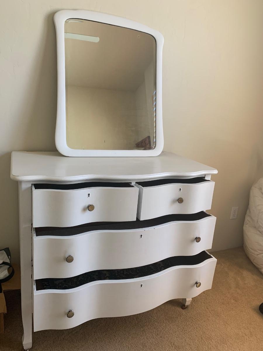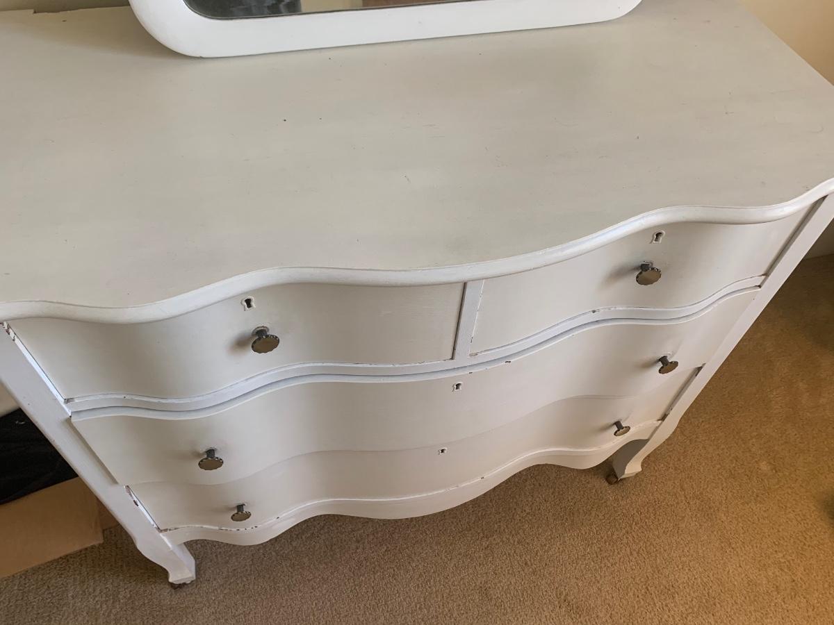 White shabby chic dresser in good condition with normal obvious wear. No issues with drawers. On wheels. (dresser=40inX20inX35in) (mirror not attached= 31inX25in)