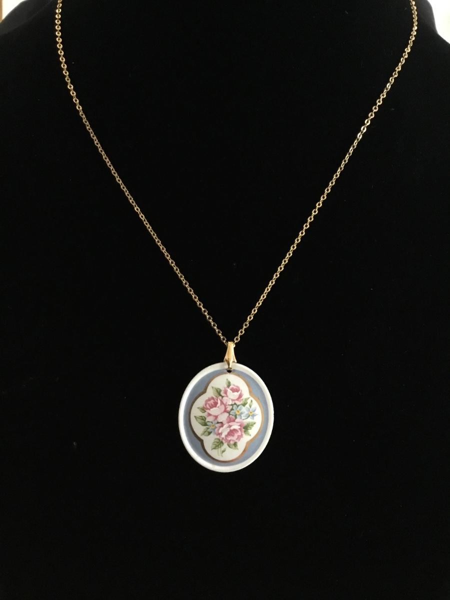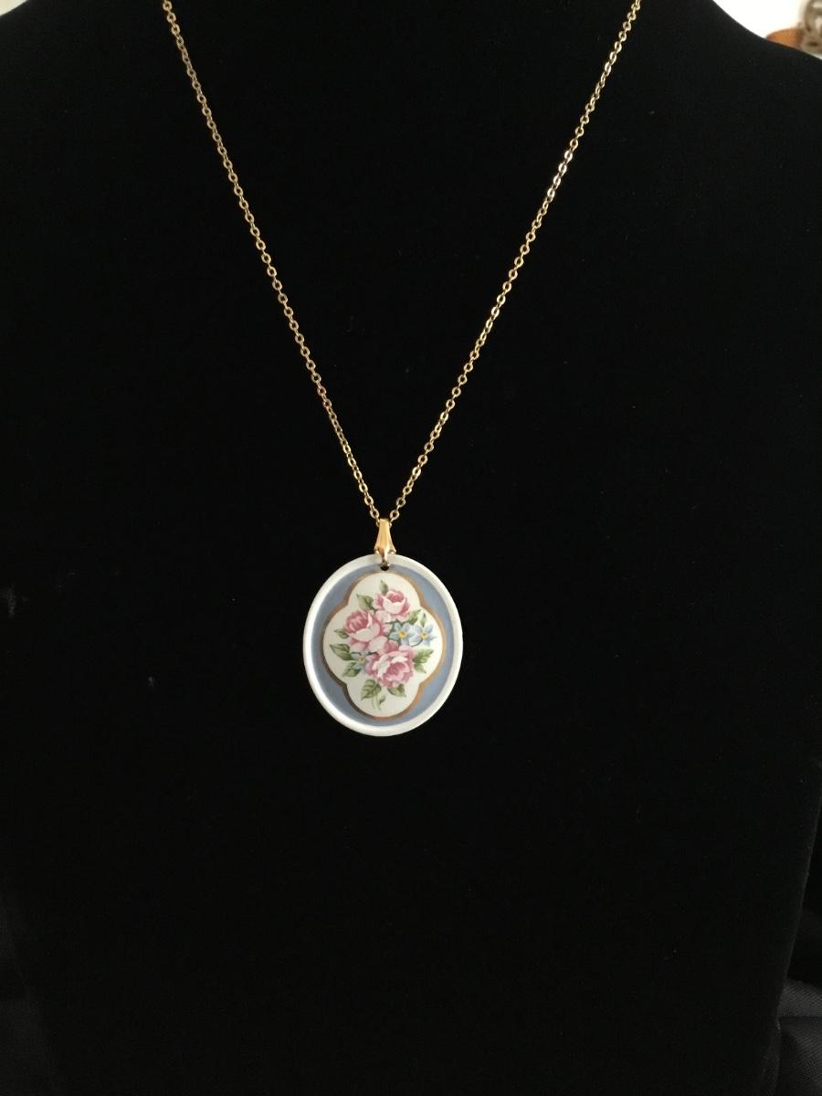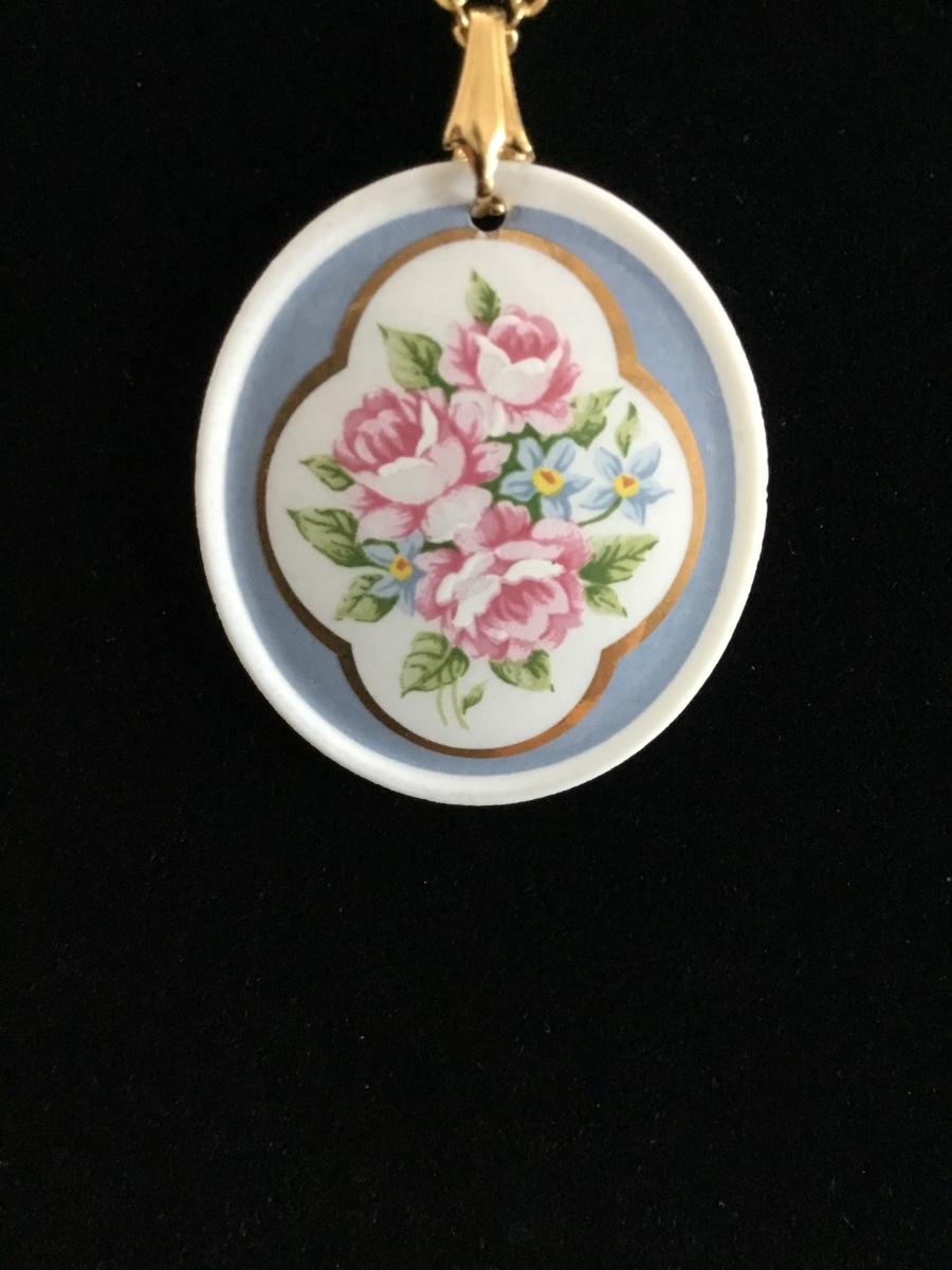 Shabby chic, floral porcelain pendant With gold toned chain necklace