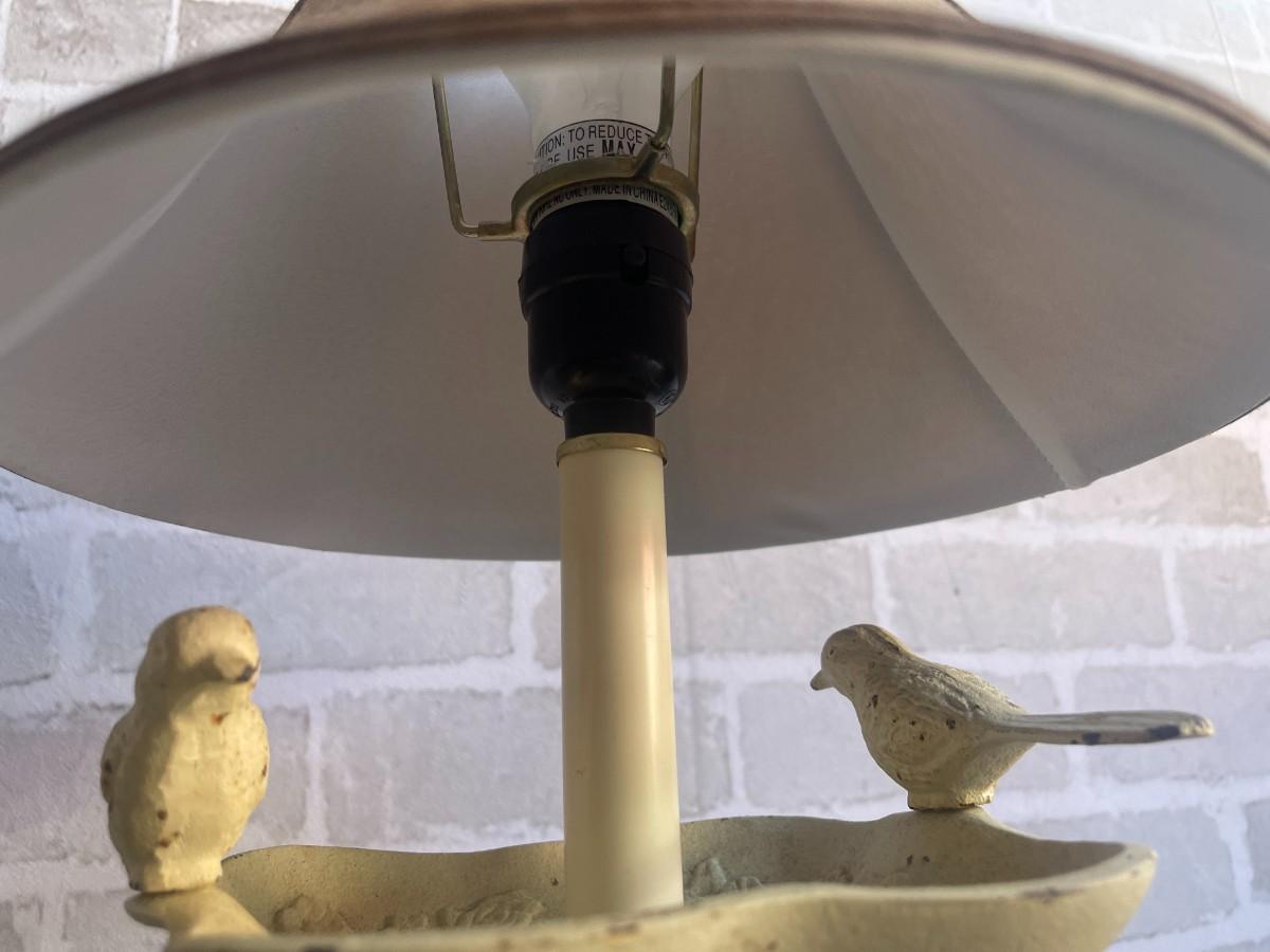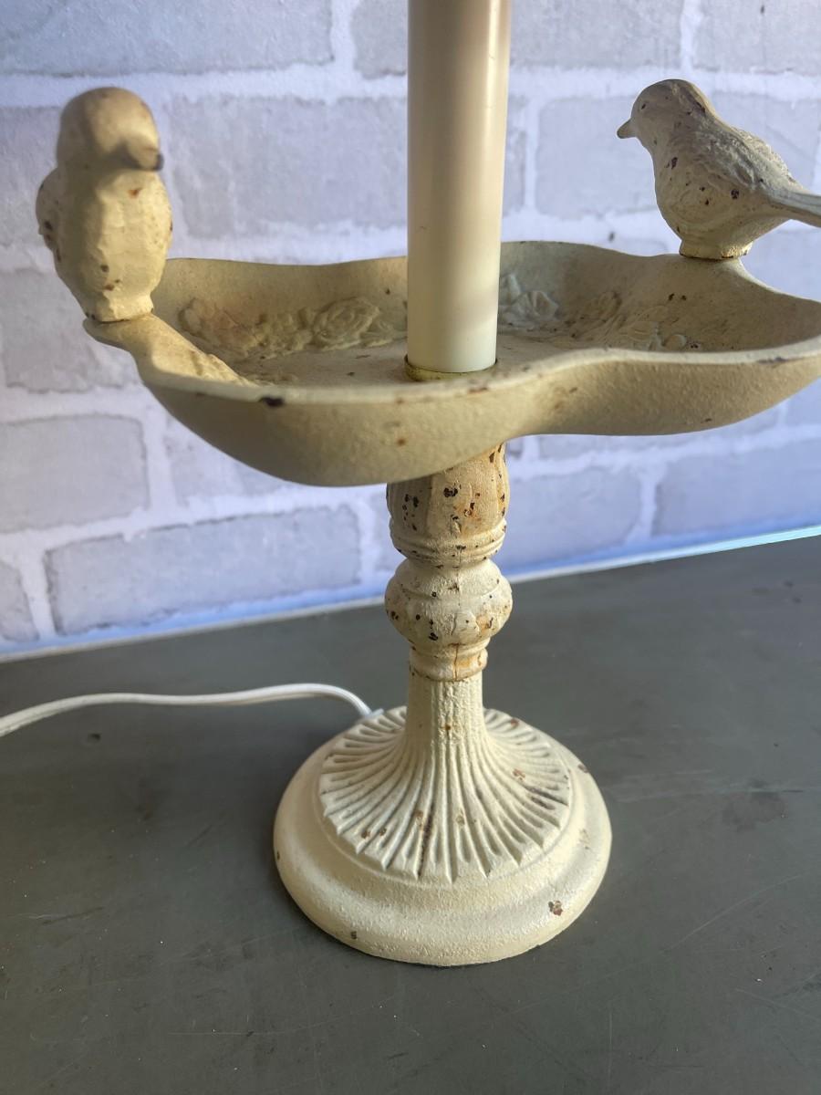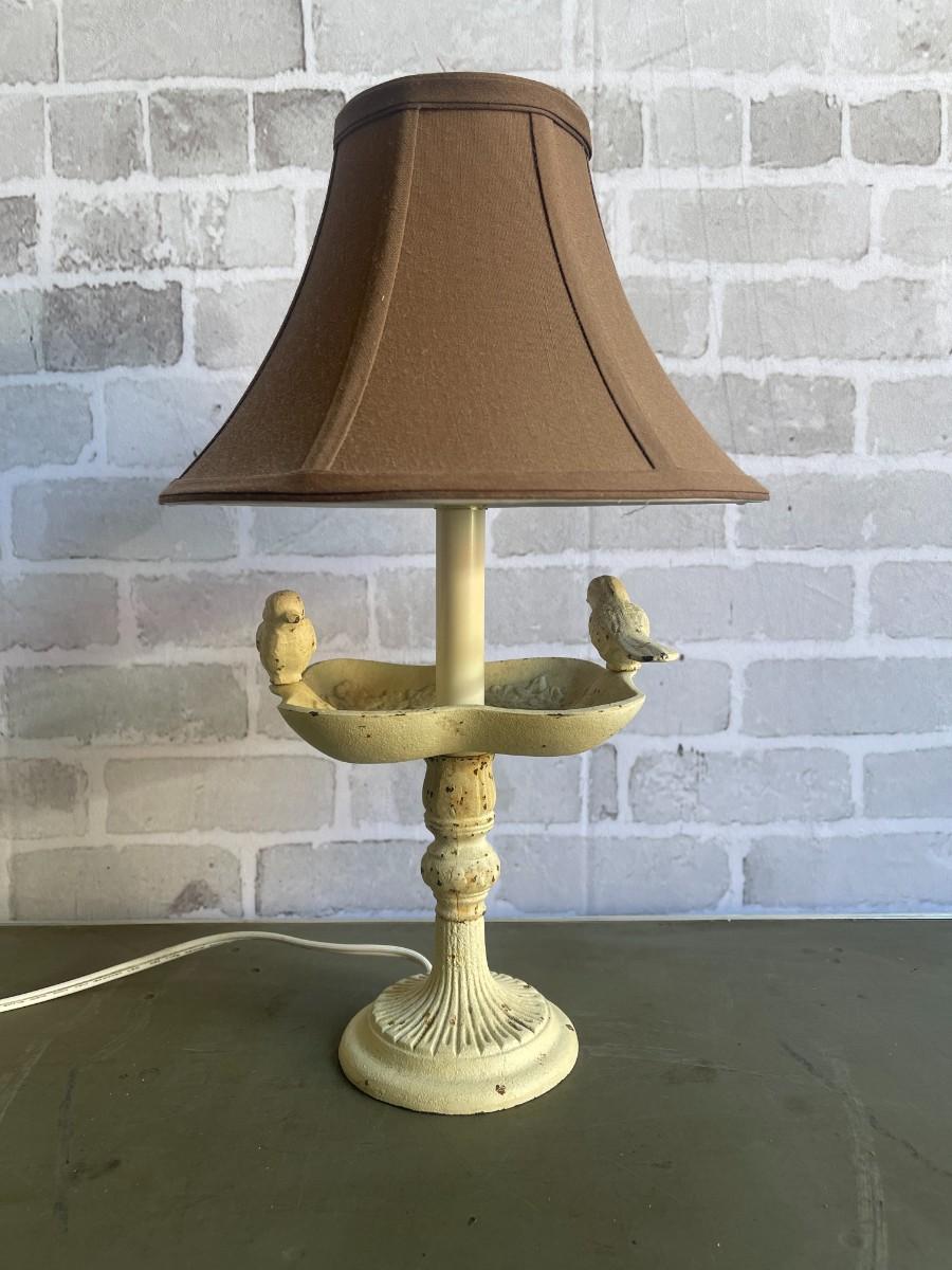 Charing shabby chic painted metal lamp with bird accents and brown fabric shade. 16 1/2" to the top of the shade, approximately 7 1/2" wide.