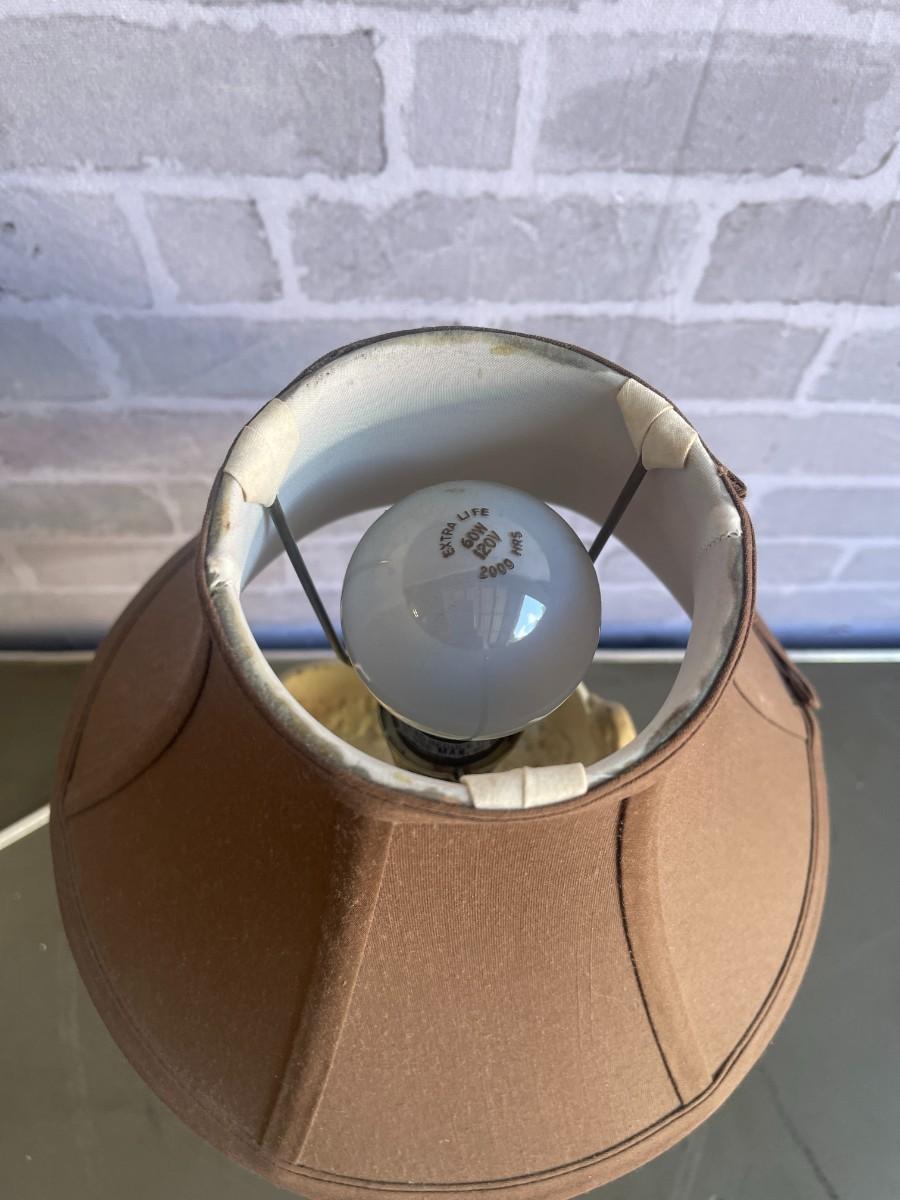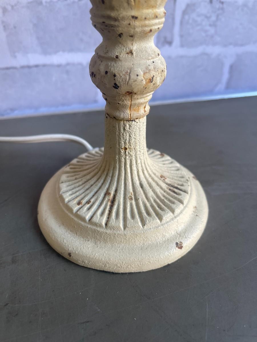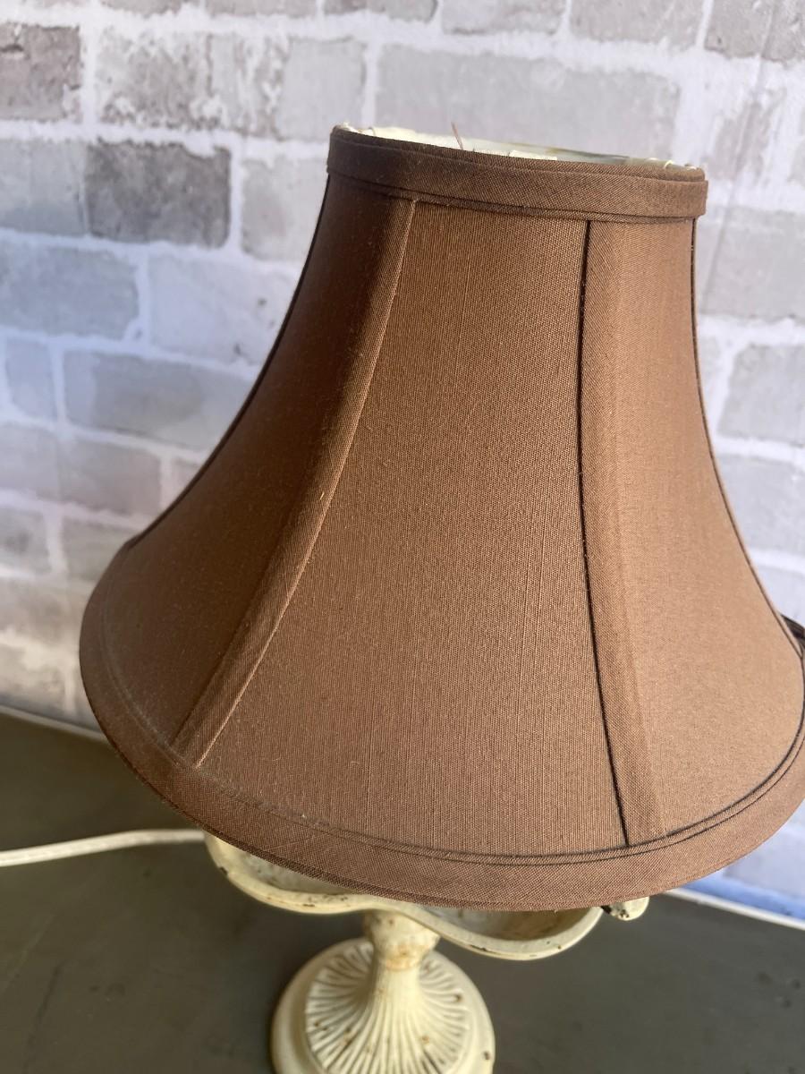 Charing shabby chic painted metal lamp with bird accents and brown fabric shade. 16 1/2" to the top of the shade, approximately 7 1/2" wide.
