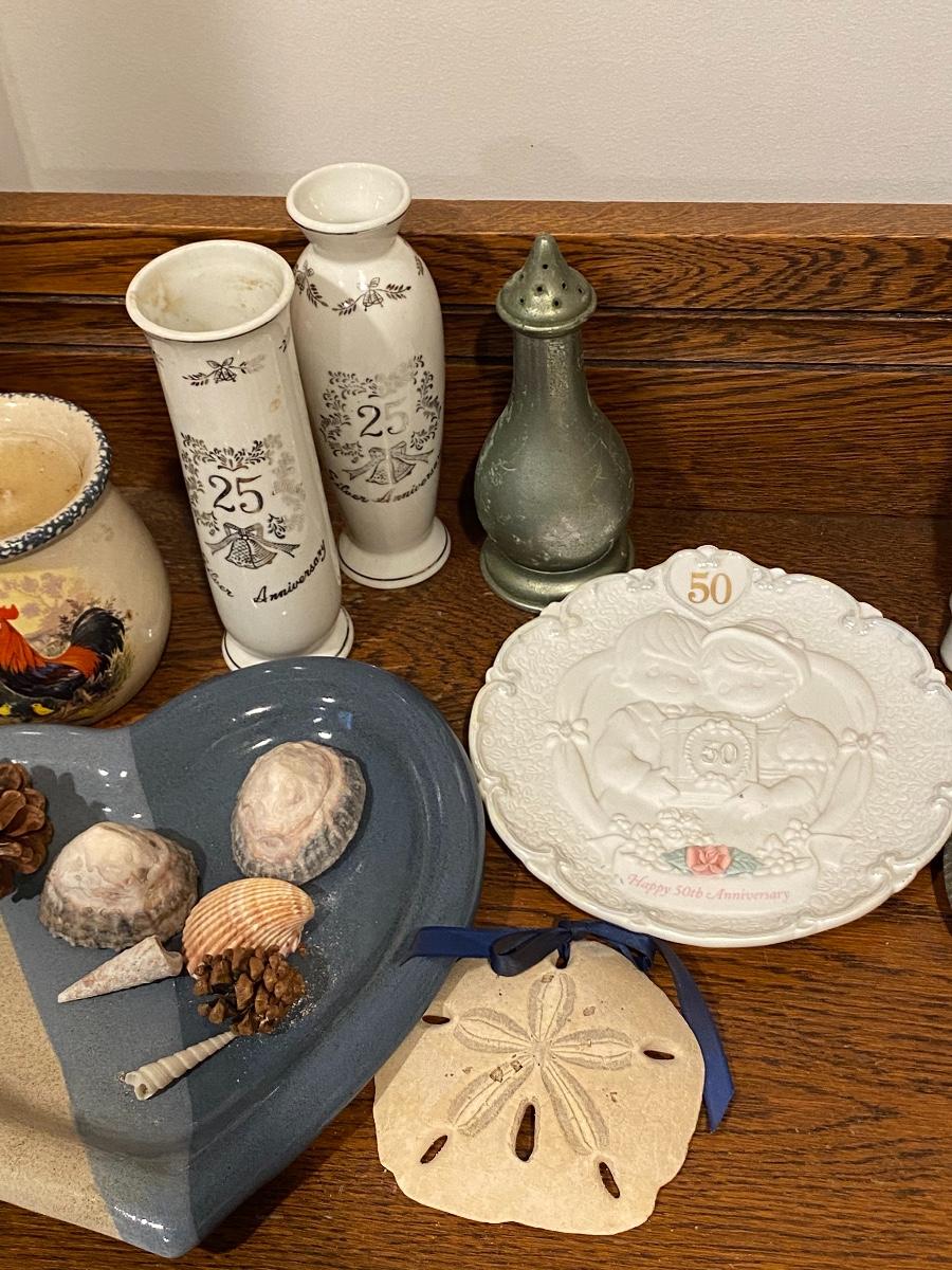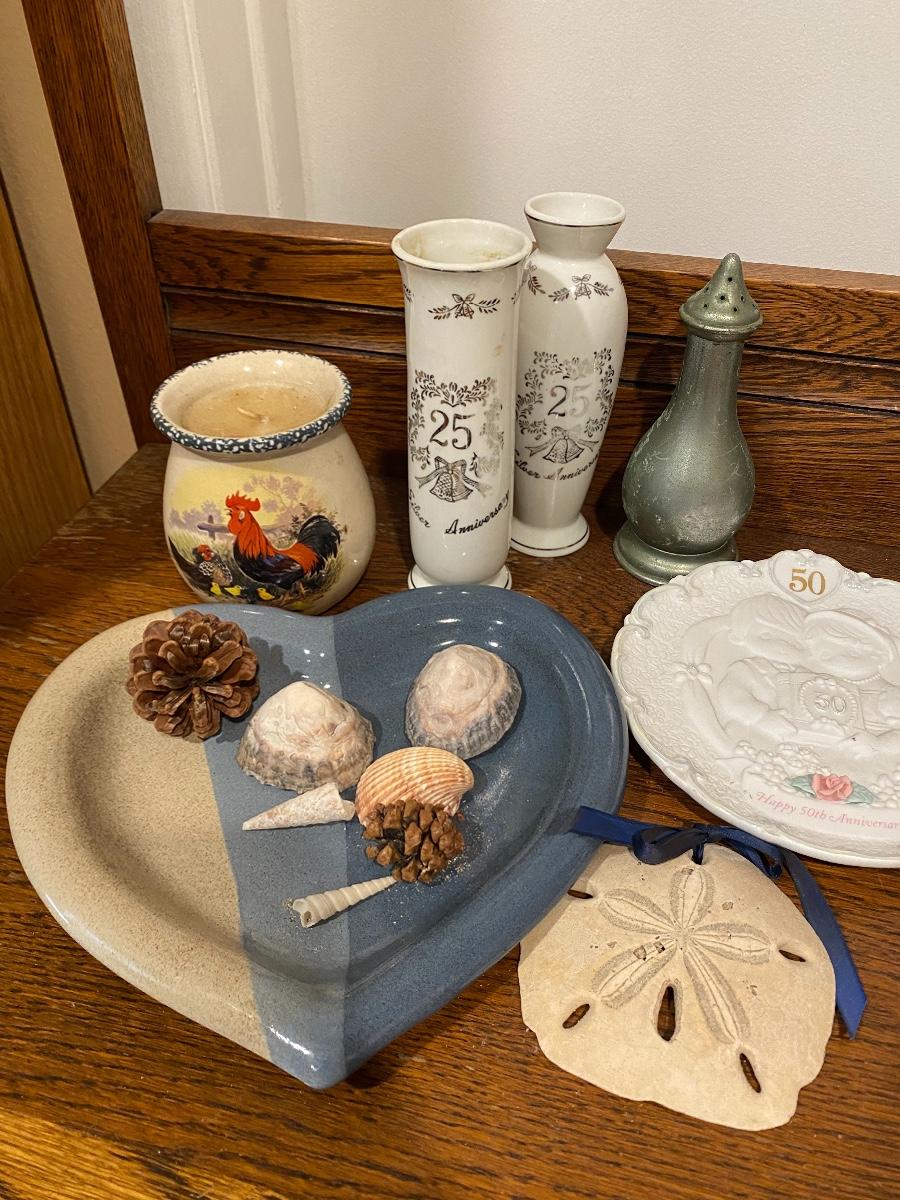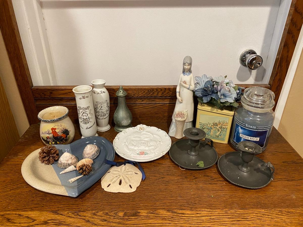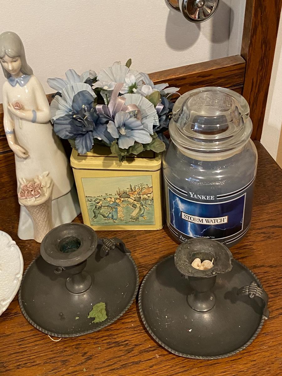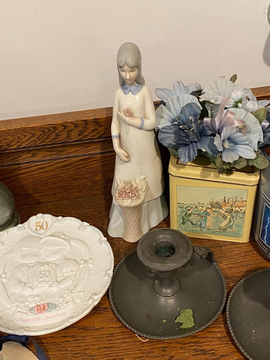Shades of blue anniversary collectible and decor lot. Figurine is not Lladro.