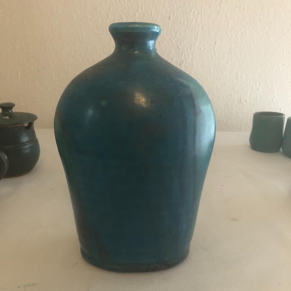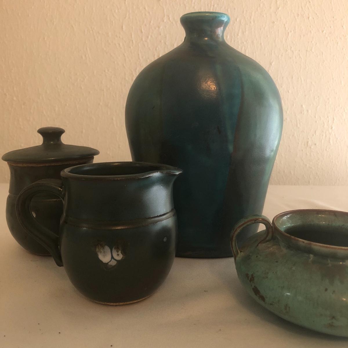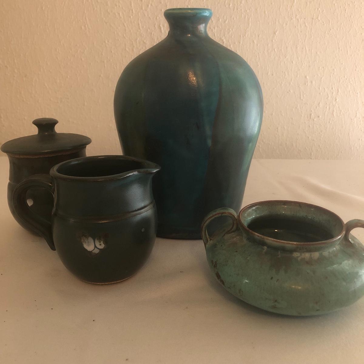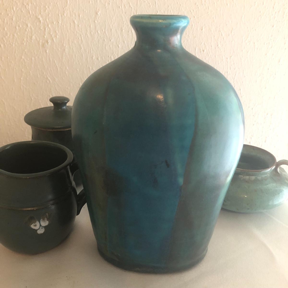 The exquisite blue ceramic vase in this lot is from Jan Lee and measures 3” x 4” on the base and it’s 11” tall. Also included is a matching creamer and sugar bowl and a small bowl, all in pretty handmade pottery in shades of blue.