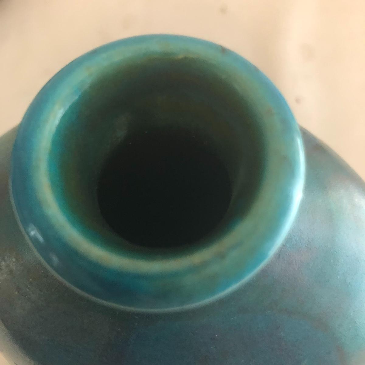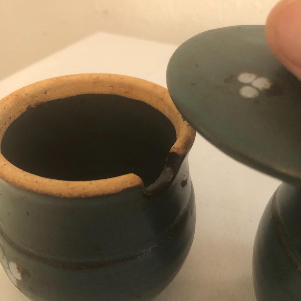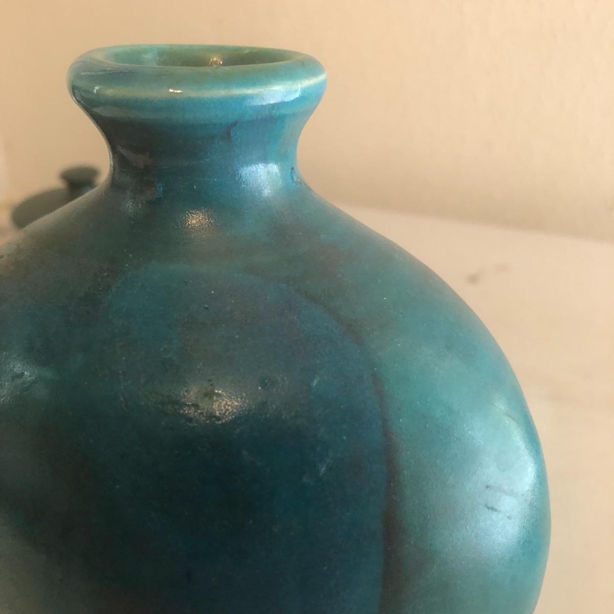 The exquisite blue ceramic vase in this lot is from Jan Lee and measures 3” x 4” on the base and it’s 11” tall. Also included is a matching creamer and sugar bowl and a small bowl, all in pretty handmade pottery in shades of blue.