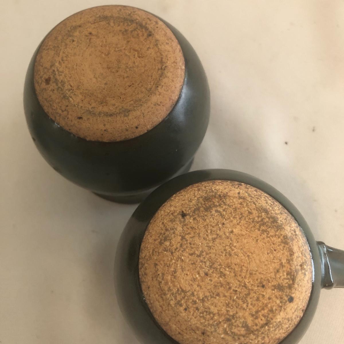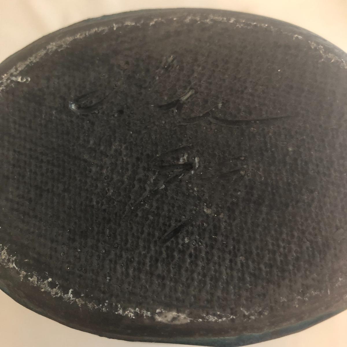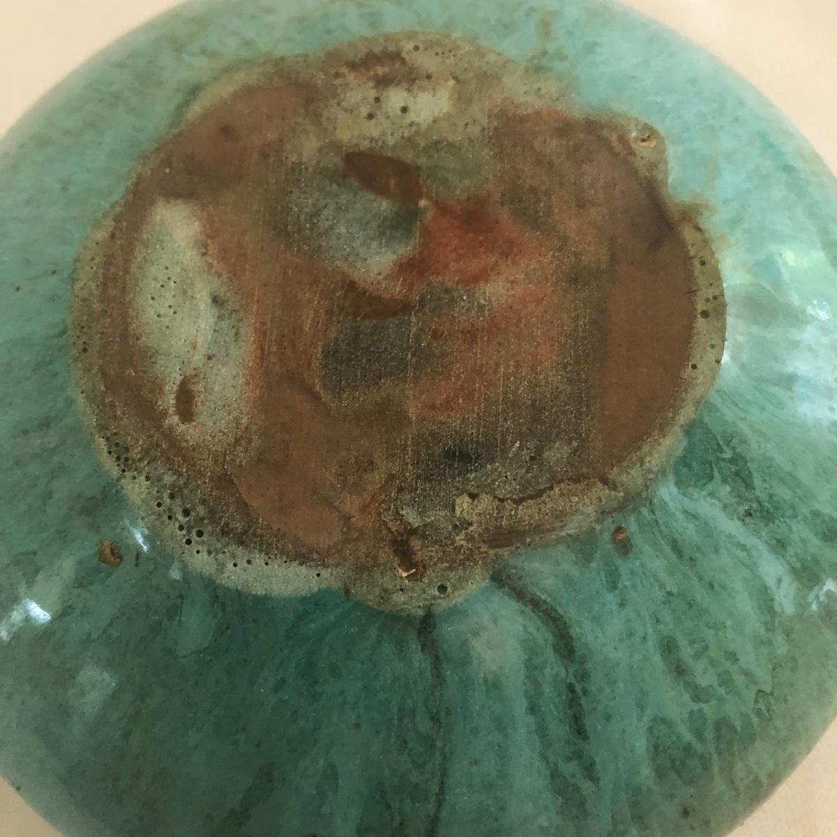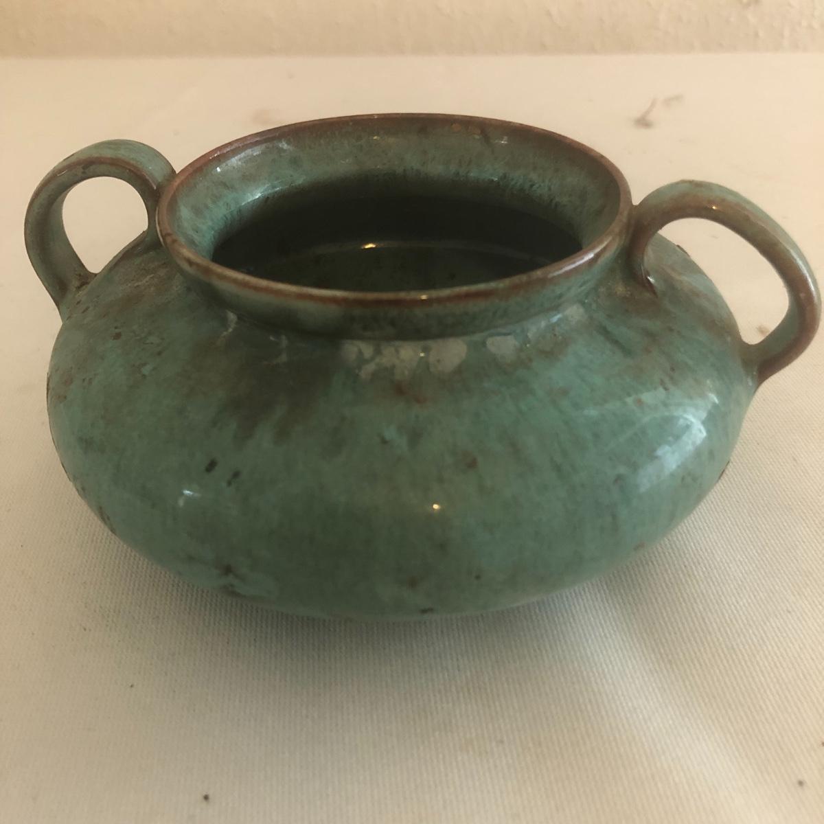 The exquisite blue ceramic vase in this lot is from Jan Lee and measures 3” x 4” on the base and it’s 11” tall. Also included is a matching creamer and sugar bowl and a small bowl, all in pretty handmade pottery in shades of blue.