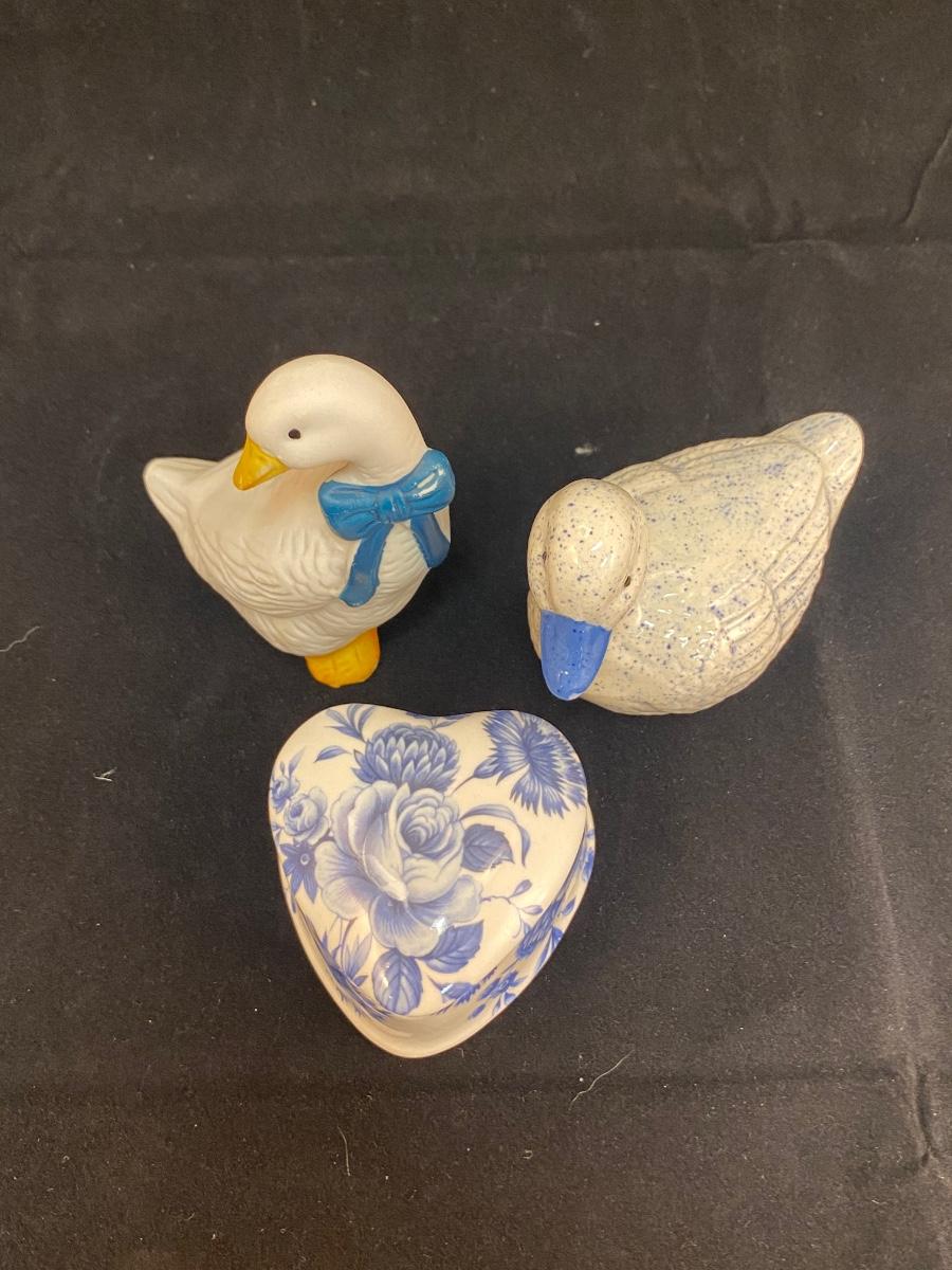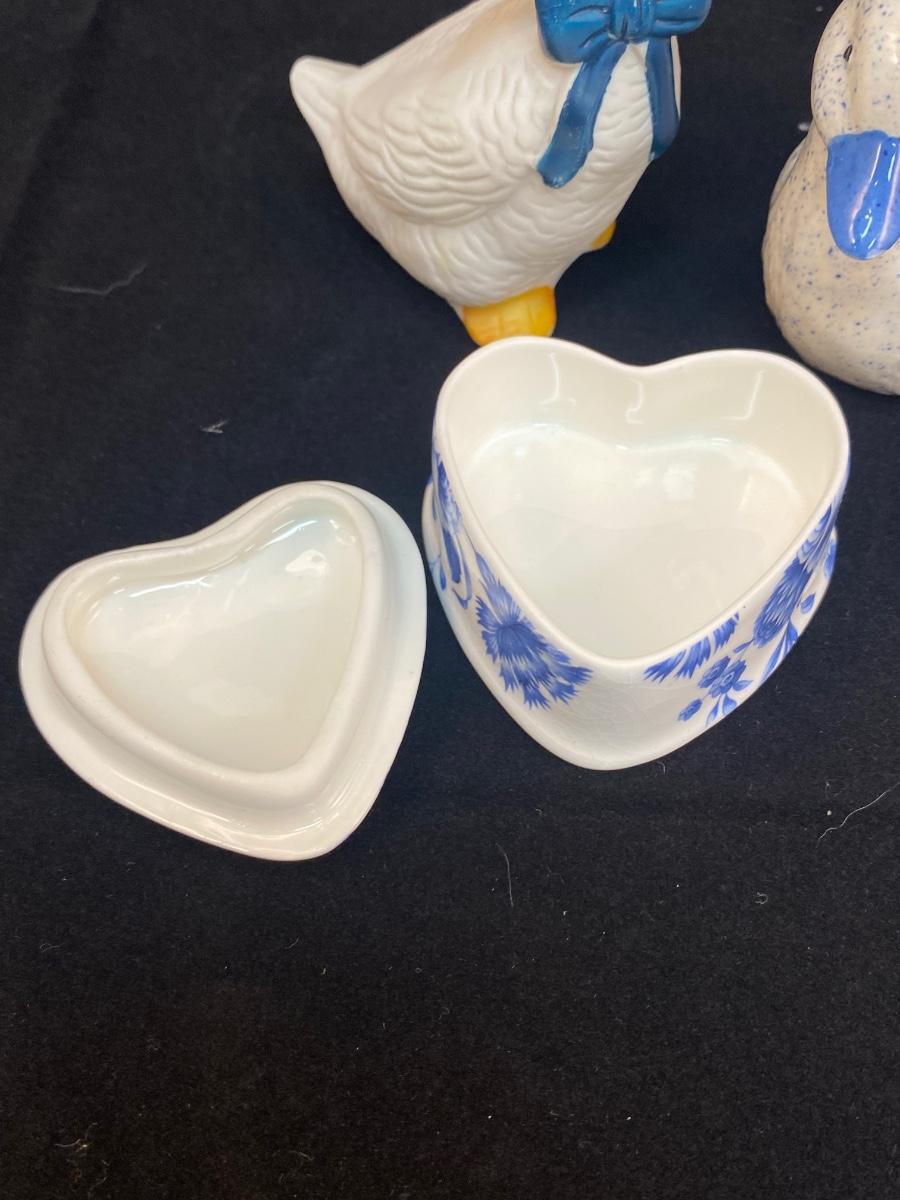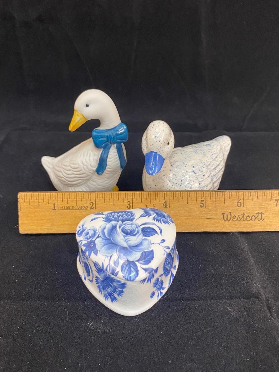 Shades of Blue Pair of Duck Goose Figurines & Heart Shaped Trinket Box. All are in good condition. About 3" size and smaller.