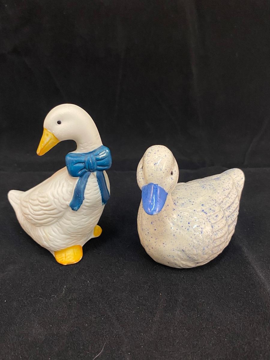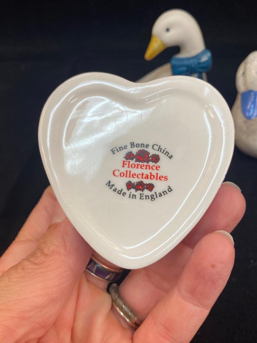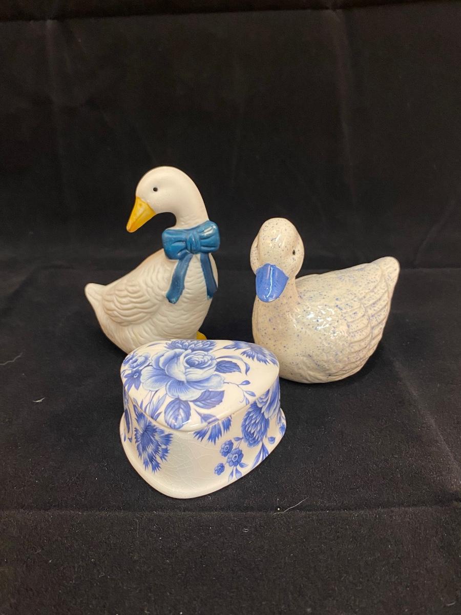 Shades of Blue Pair of Duck Goose Figurines & Heart Shaped Trinket Box. All are in good condition. About 3" size and smaller.