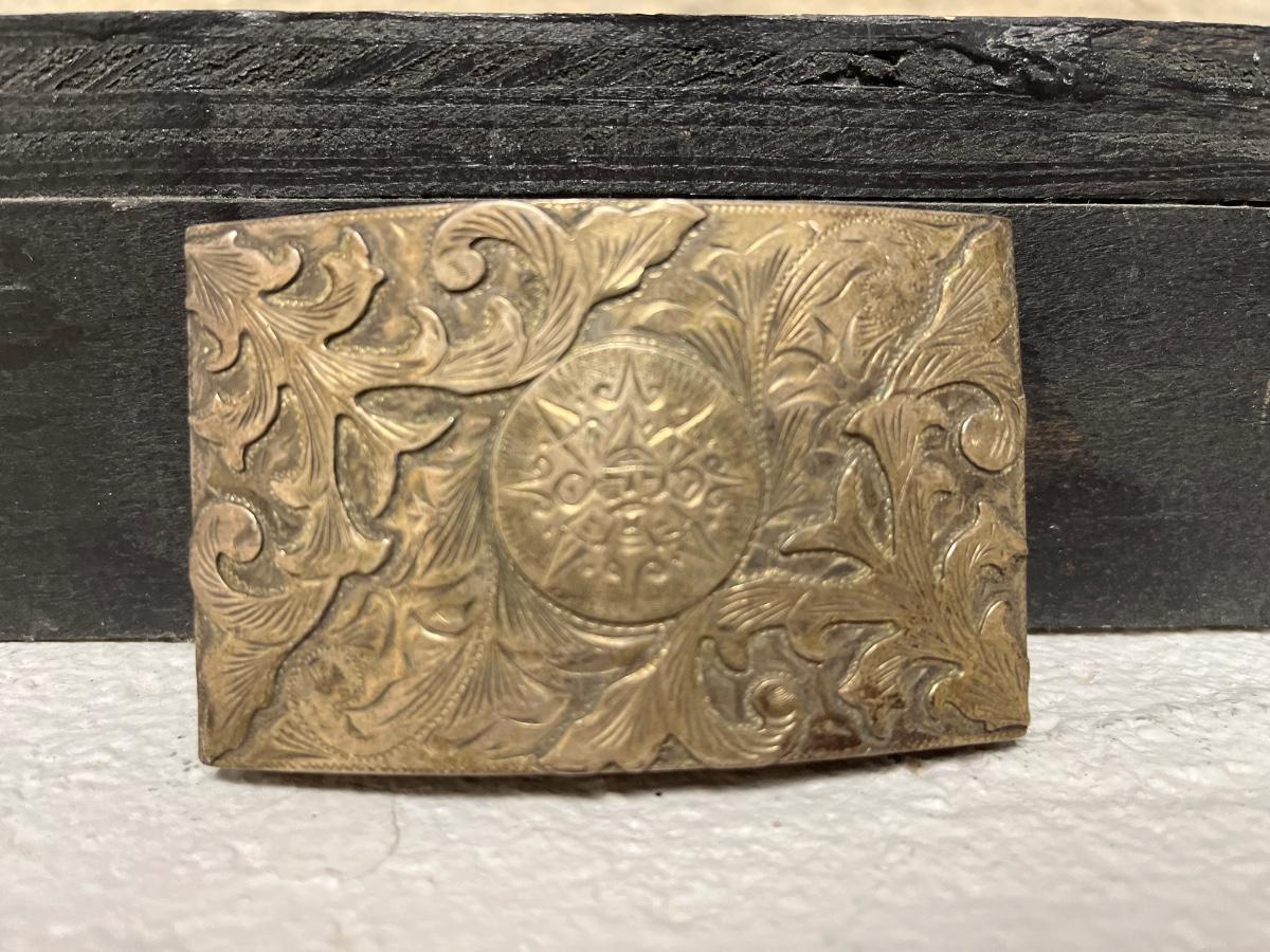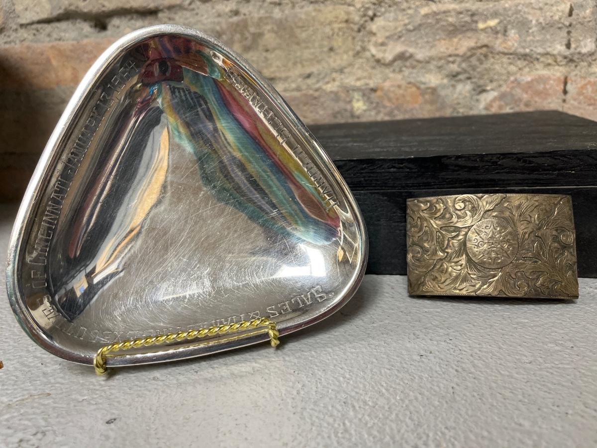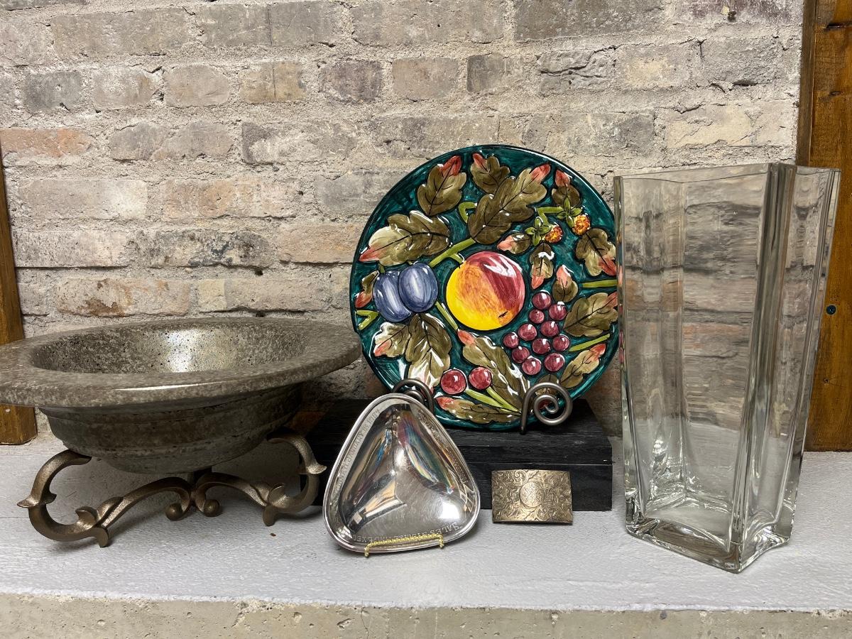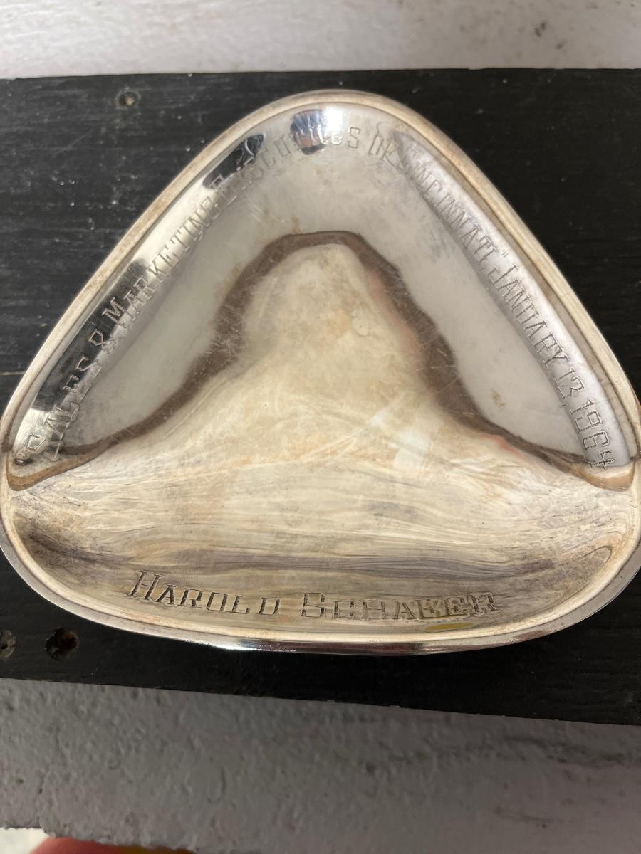 Sterling belt buckle, Ice bowl with stand (fill with water and chill), Huge heavy crystal vase and a really neat piece of history from Harold Schaefer.