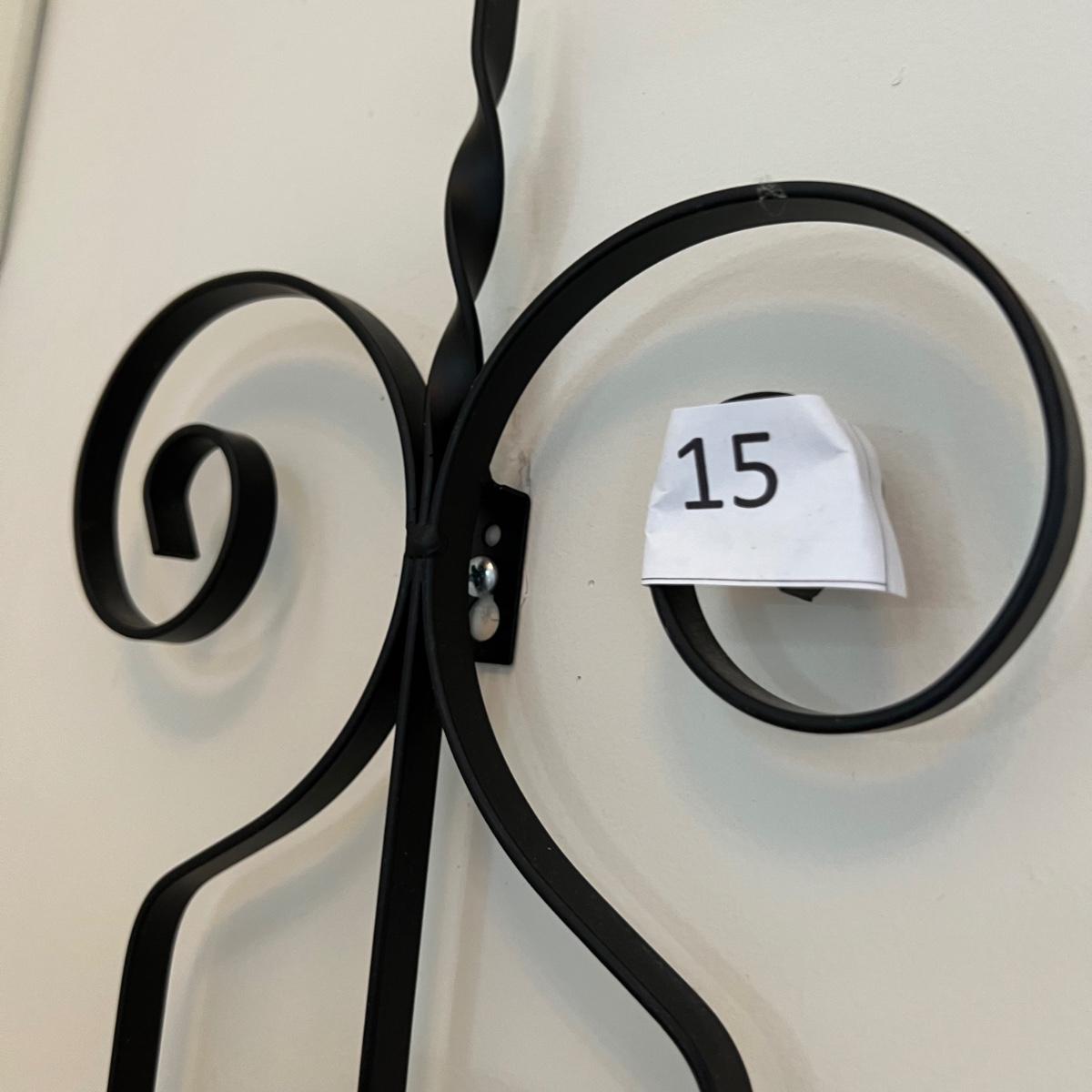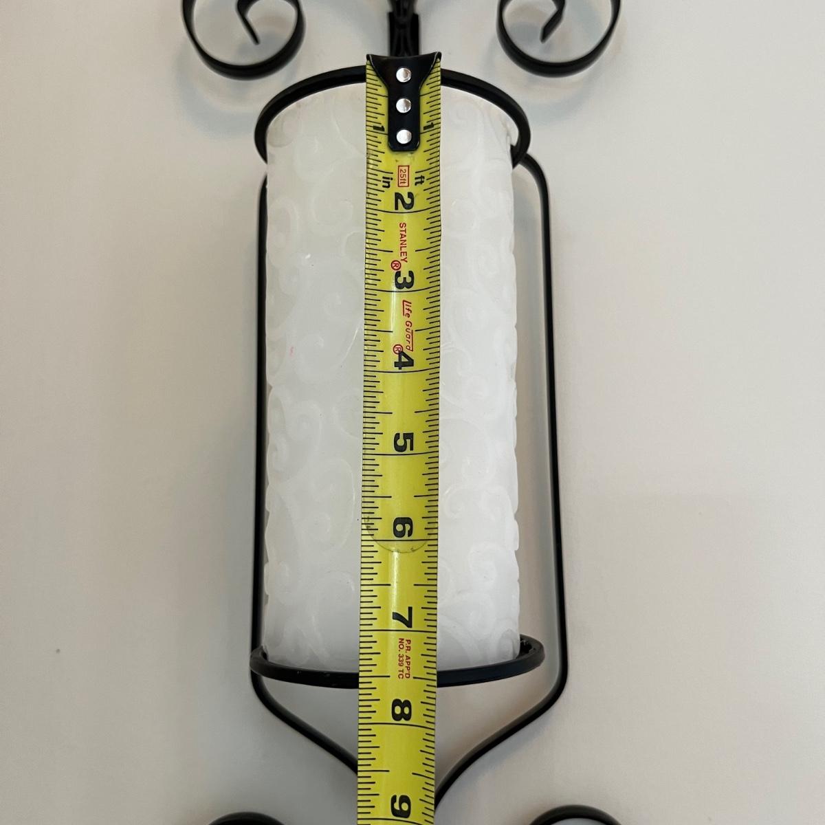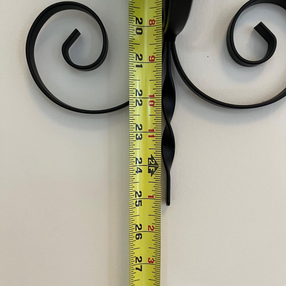 2 black iron wall sconces. See pics for measurements.