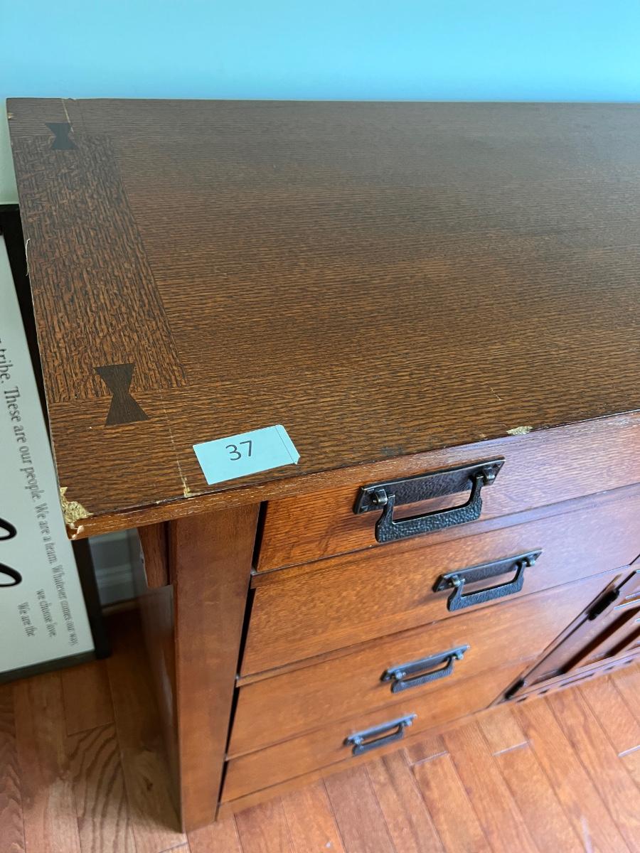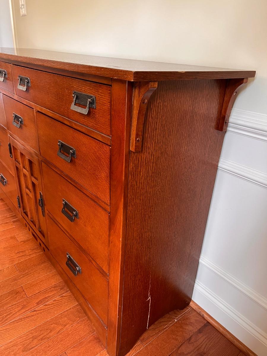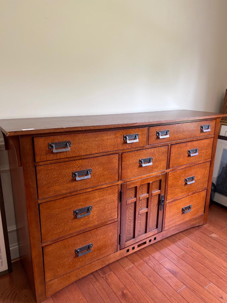 Use as dresser or buffet. 9 drawers and one cabinet. Has a crack on the right hand base and the top edges have chips as shown in pictures.
