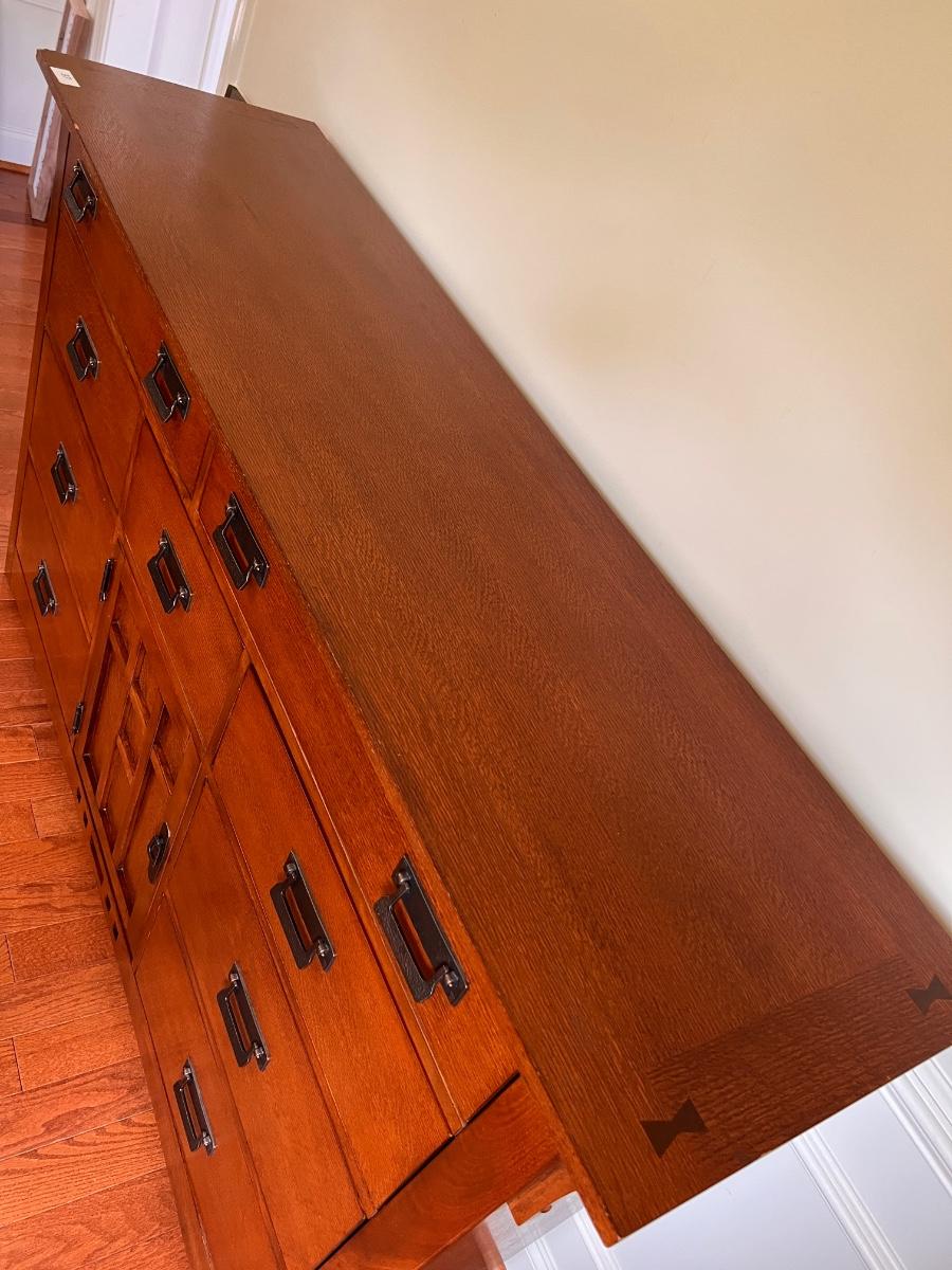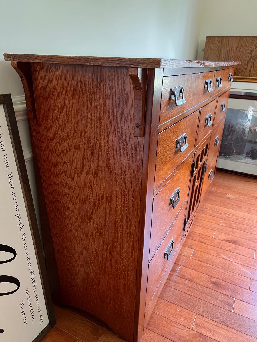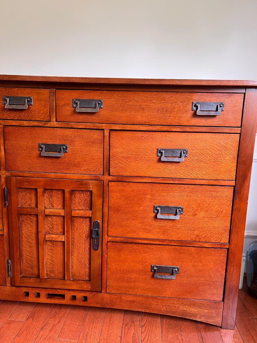 Use as dresser or buffet. 9 drawers and one cabinet. Has a crack on the right hand base and the top edges have chips as shown in pictures.