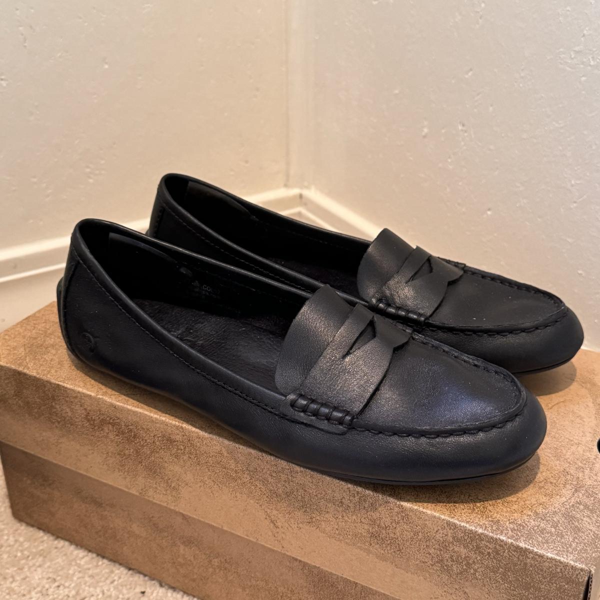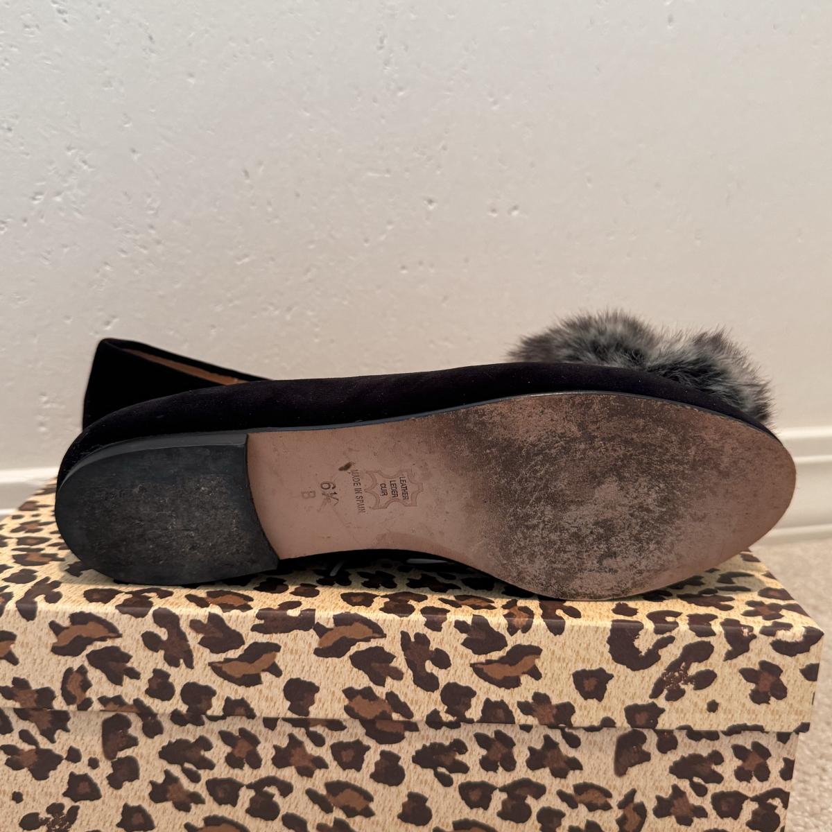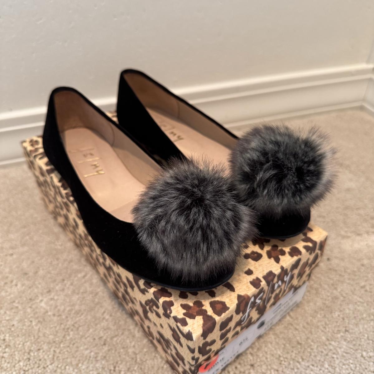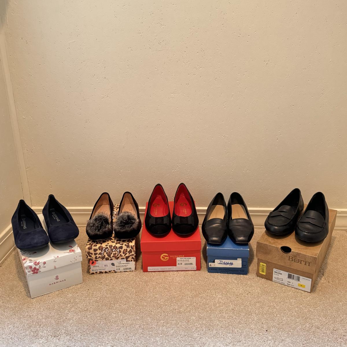 This lot includes one pair of Born handcrafted loafers in a size 6, one pair of unlabeled leather loafers in a size 6.5, one pair of Shaina Gold velvet flats with a bow on the toe in a size 6.5, one pair of leather FS/NY flats with a pom on each toe in a size 6.5, and one pair of Sabrinas navy suede flats in a size 7. All shoes are gently worn and come in their original box. Shipping available.
