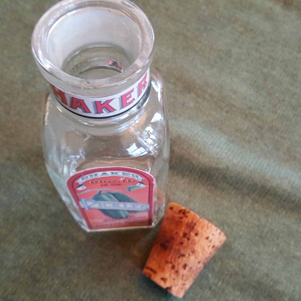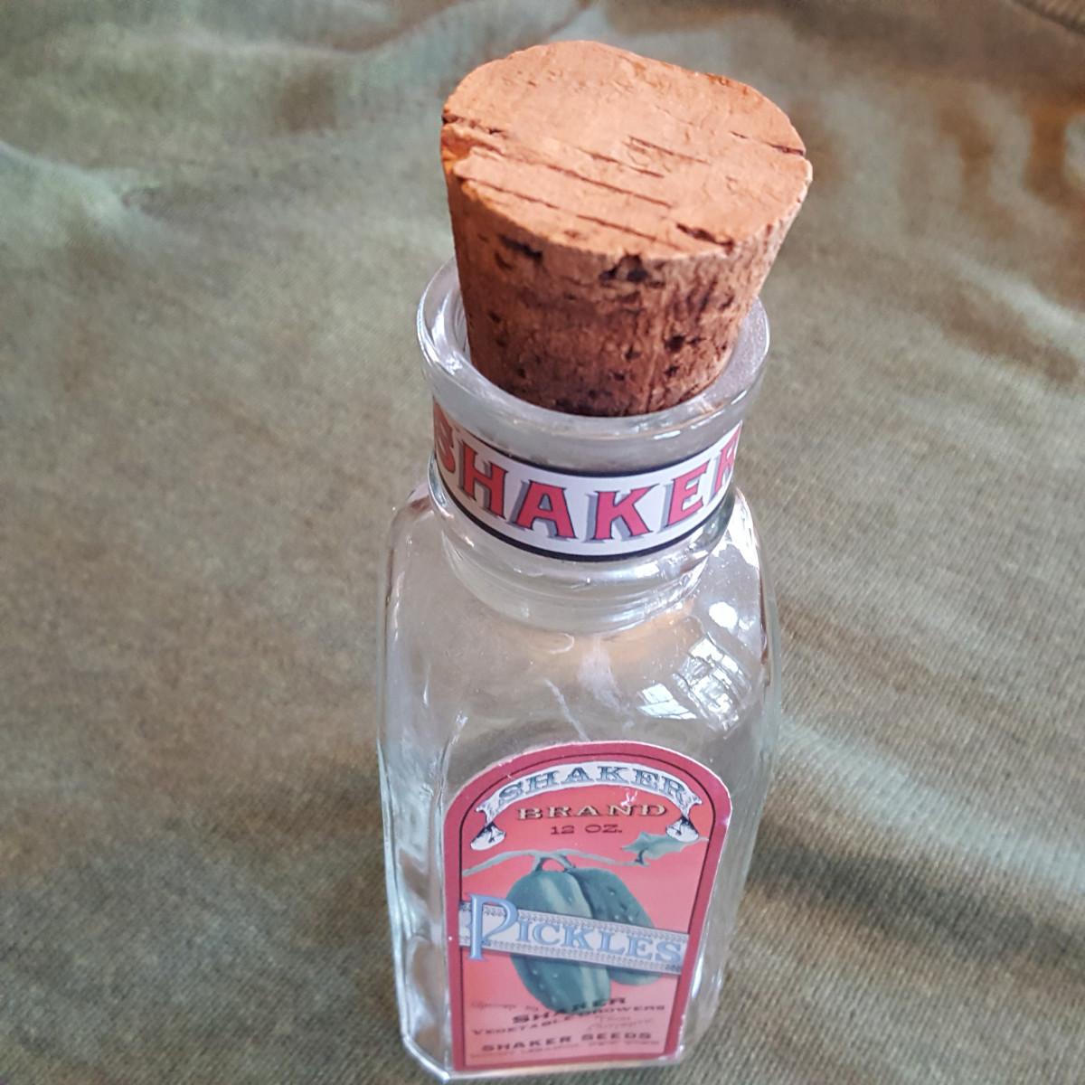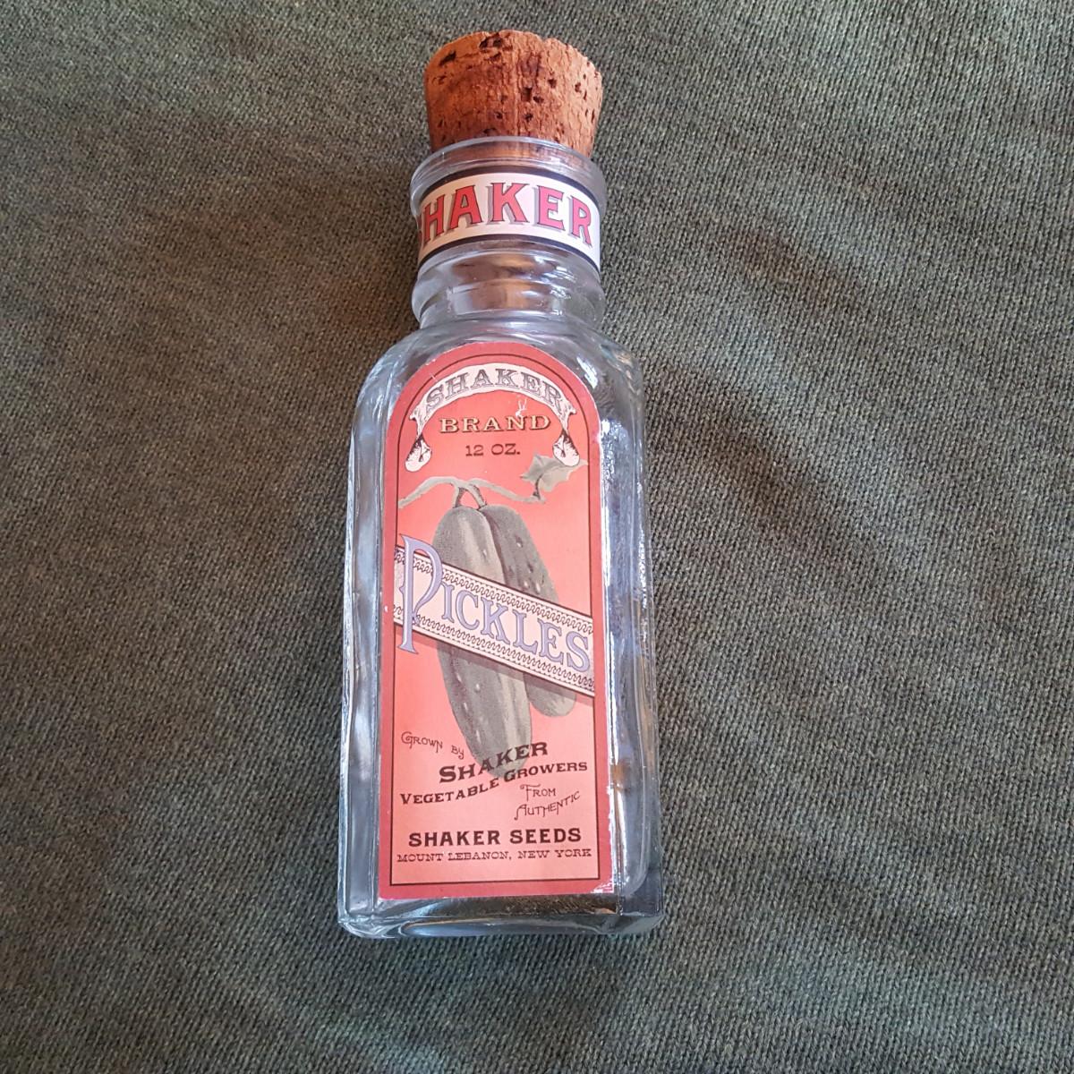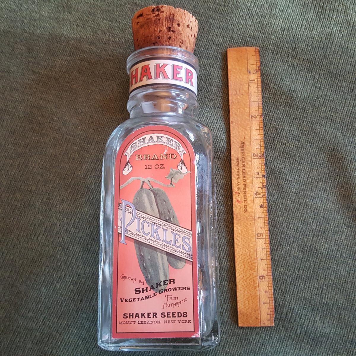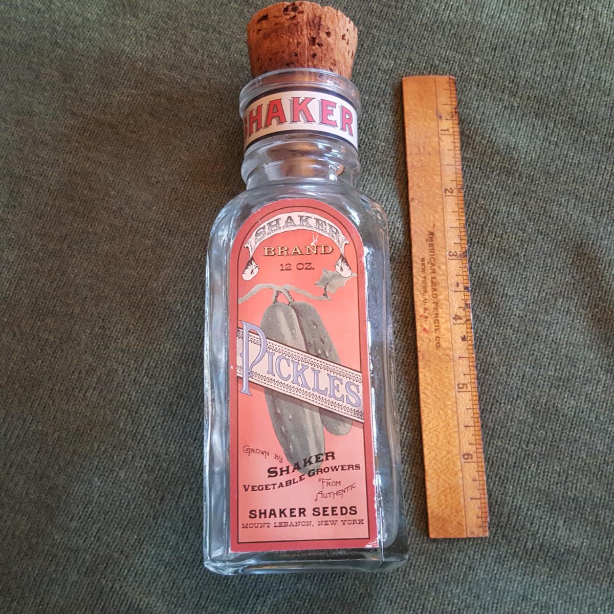 This auction lot is for a Shaker Pickle Jar. This jar is a reproduction made for display purposes. The jar stands about 7.5-inches tall from base to top of cork. The Shaker's were known for their early entry into the "canned goods" business. The bottle is in nice condition and apparently rare as we could find no others like it in our research. Authentic bottles and jars can sell for amazingly large sums.