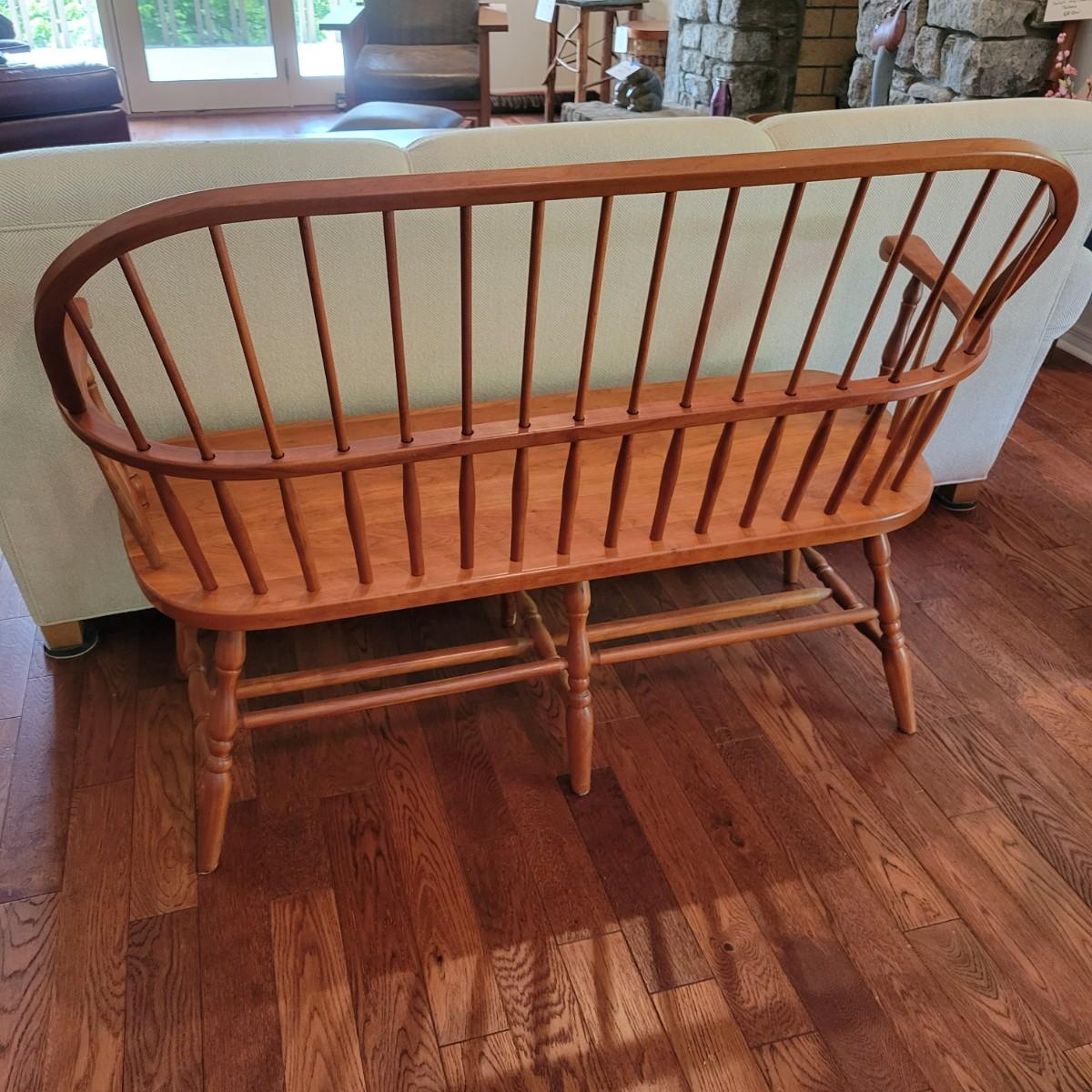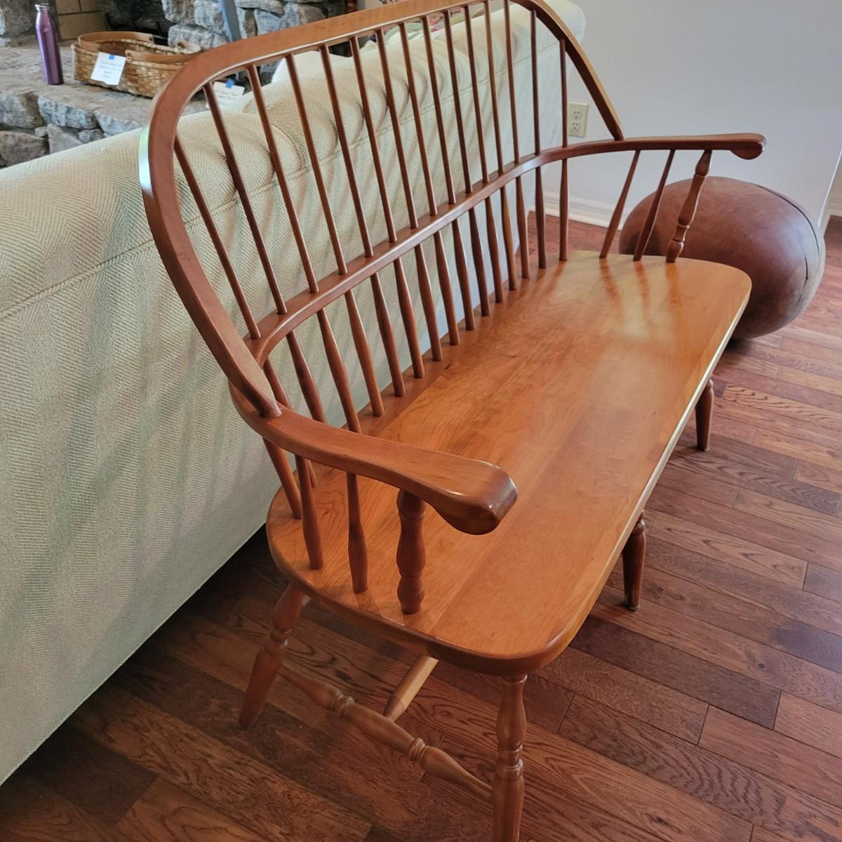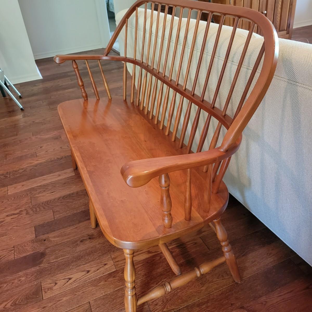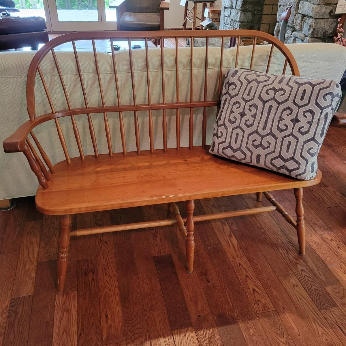 A Tom Seely shaker style wooden bench. This bench features a beautiful, rich medium finish with delicate spindles and arms. It measures approximately 52" x 21" x 37.5" with a seat height of 18". Also included is an accent pillow with a light and dark grey design. The bench does have some minor scratches and blemishes. Local pickup only