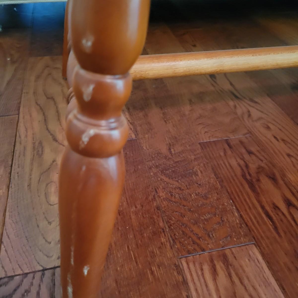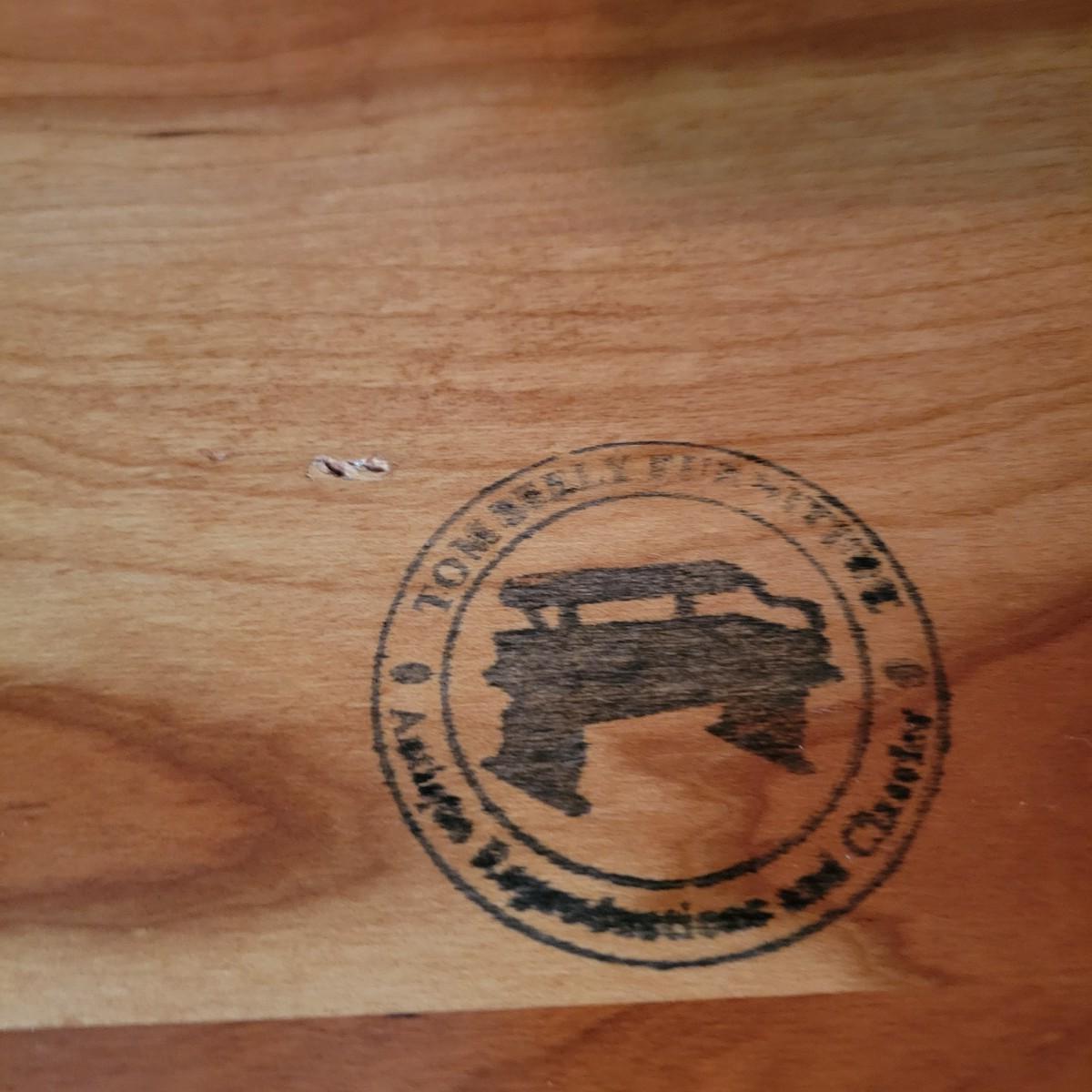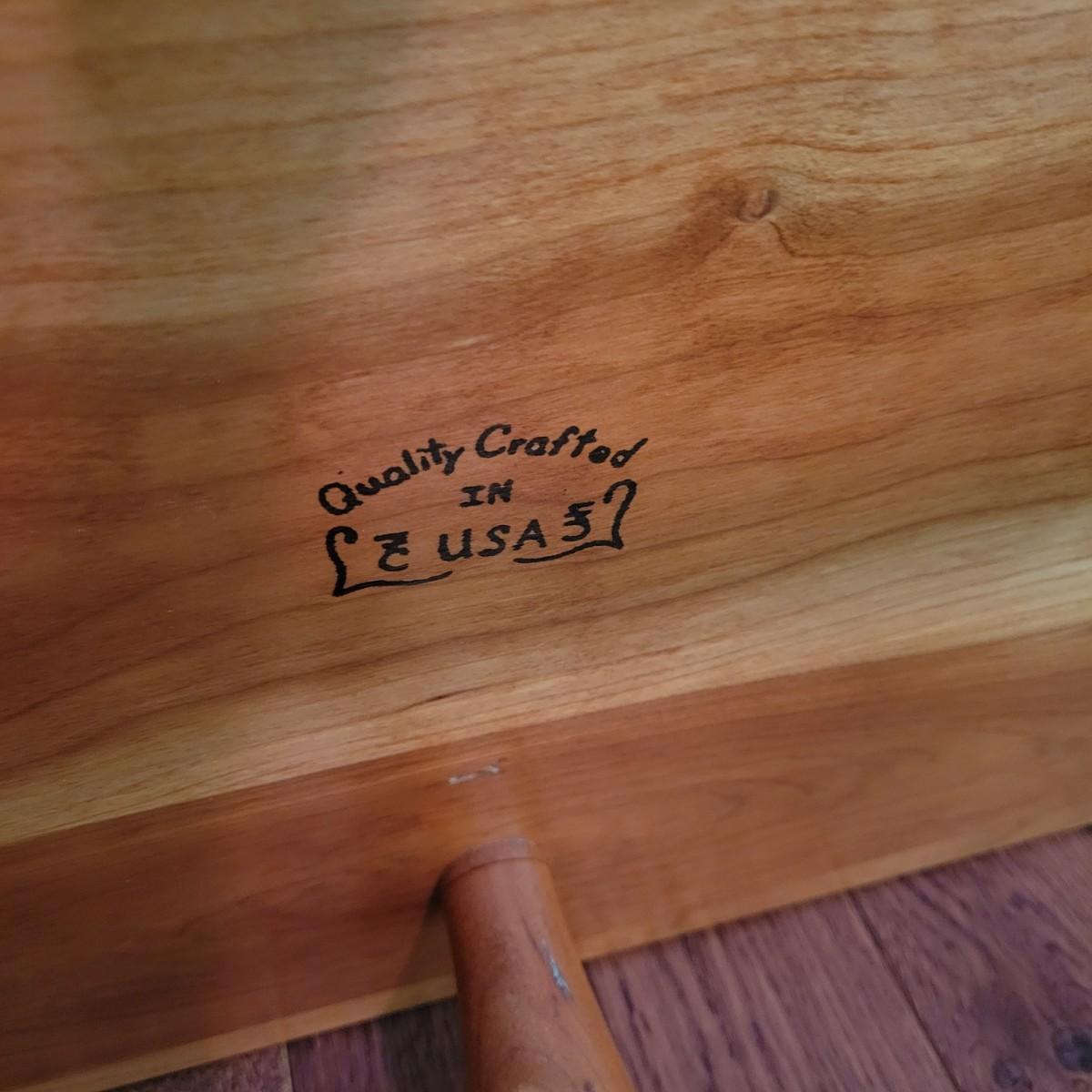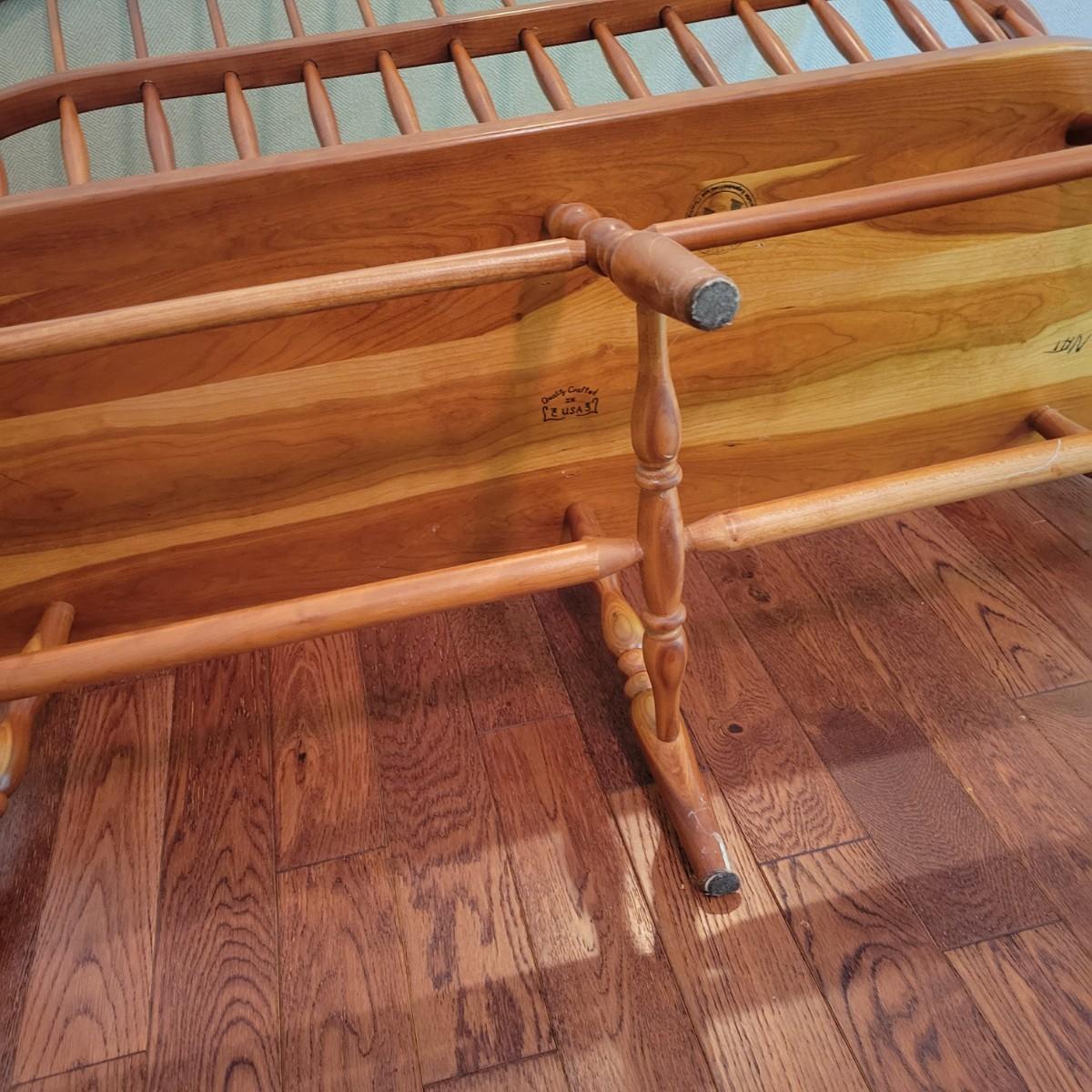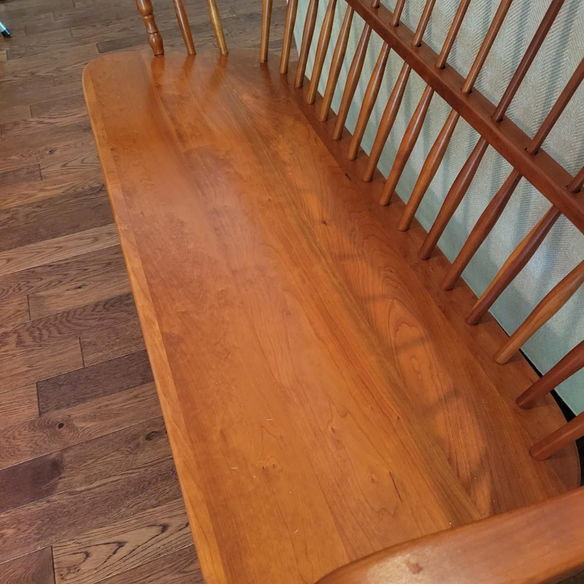 A Tom Seely shaker style wooden bench. This bench features a beautiful, rich medium finish with delicate spindles and arms. It measures approximately 52" x 21" x 37.5" with a seat height of 18". Also included is an accent pillow with a light and dark grey design. The bench does have some minor scratches and blemishes. Local pickup only