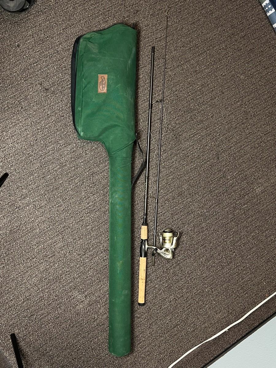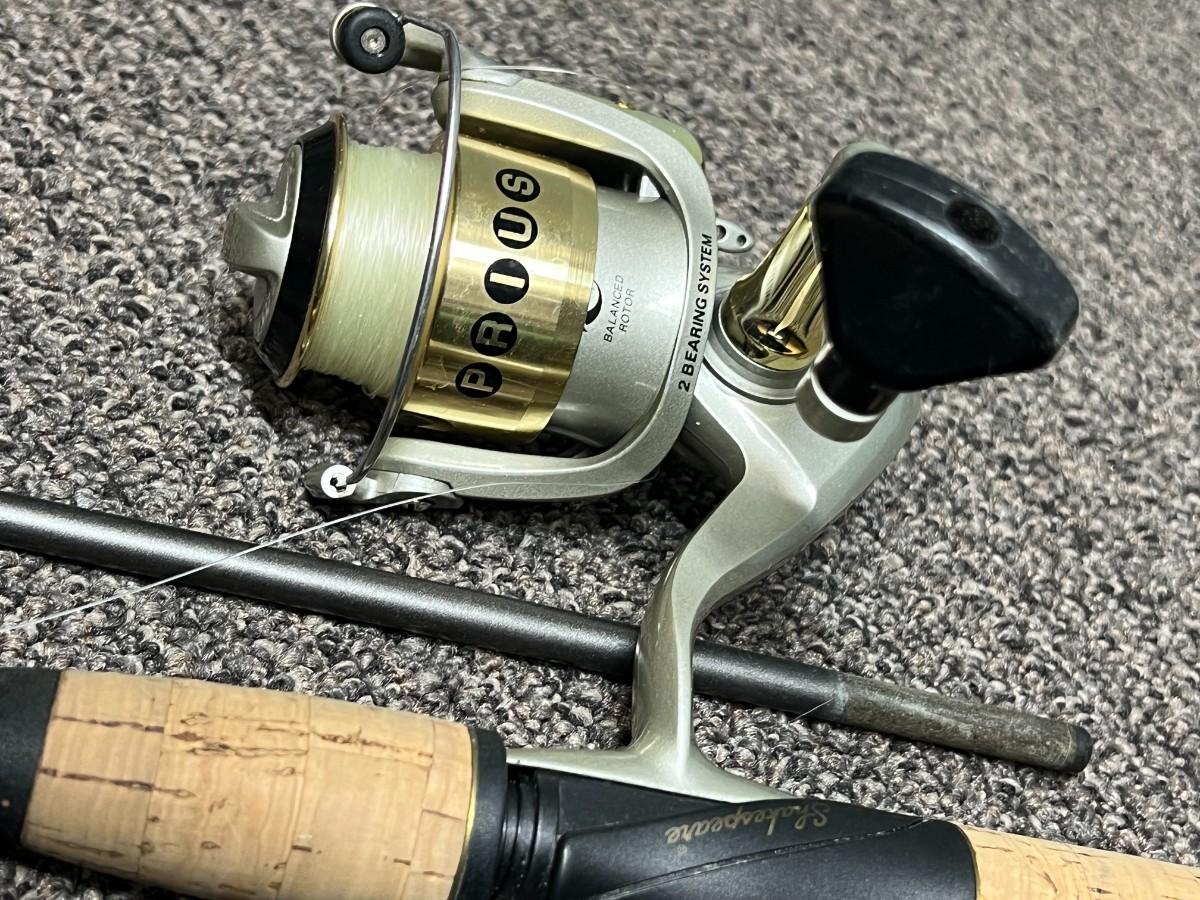 Shakespeare Prius Fishing Pole with Reel and Carry Bag. Looks to be in good condition, may need the line replaced due to age. About a 6' pole.
