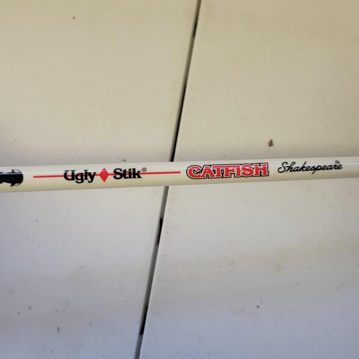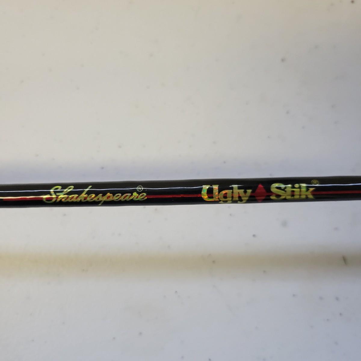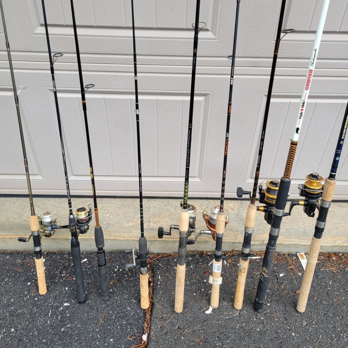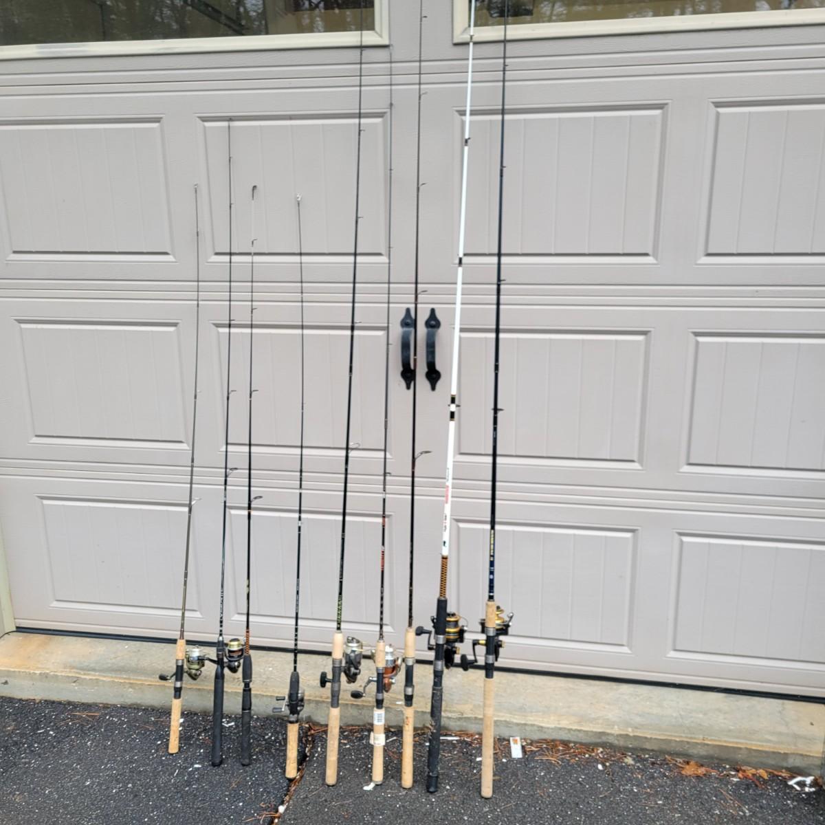 An assortment of ten rods and nine reels in good condition with no notable damage. The rods have no broken tips or missing guides. All reels have a smooth action and function as they should. The smallest rod is Shakespeare Ugly Stick at 5' and the largest rod is a Shakespeare Ugly Stick that is 7'. A variety of weights and actions ranging from ultra light to medium heavy. Lot also includes an extra samurai reel and a six slot, wall mounted rod holder. Local pickup only