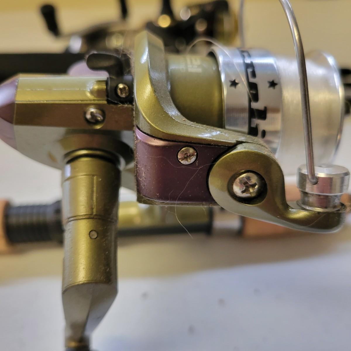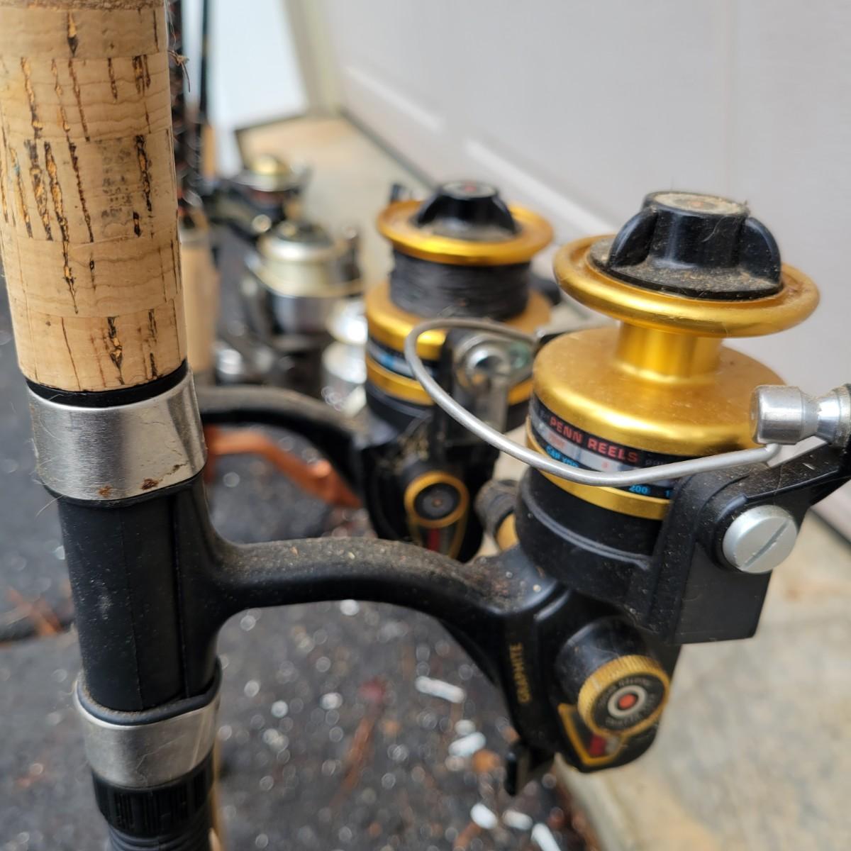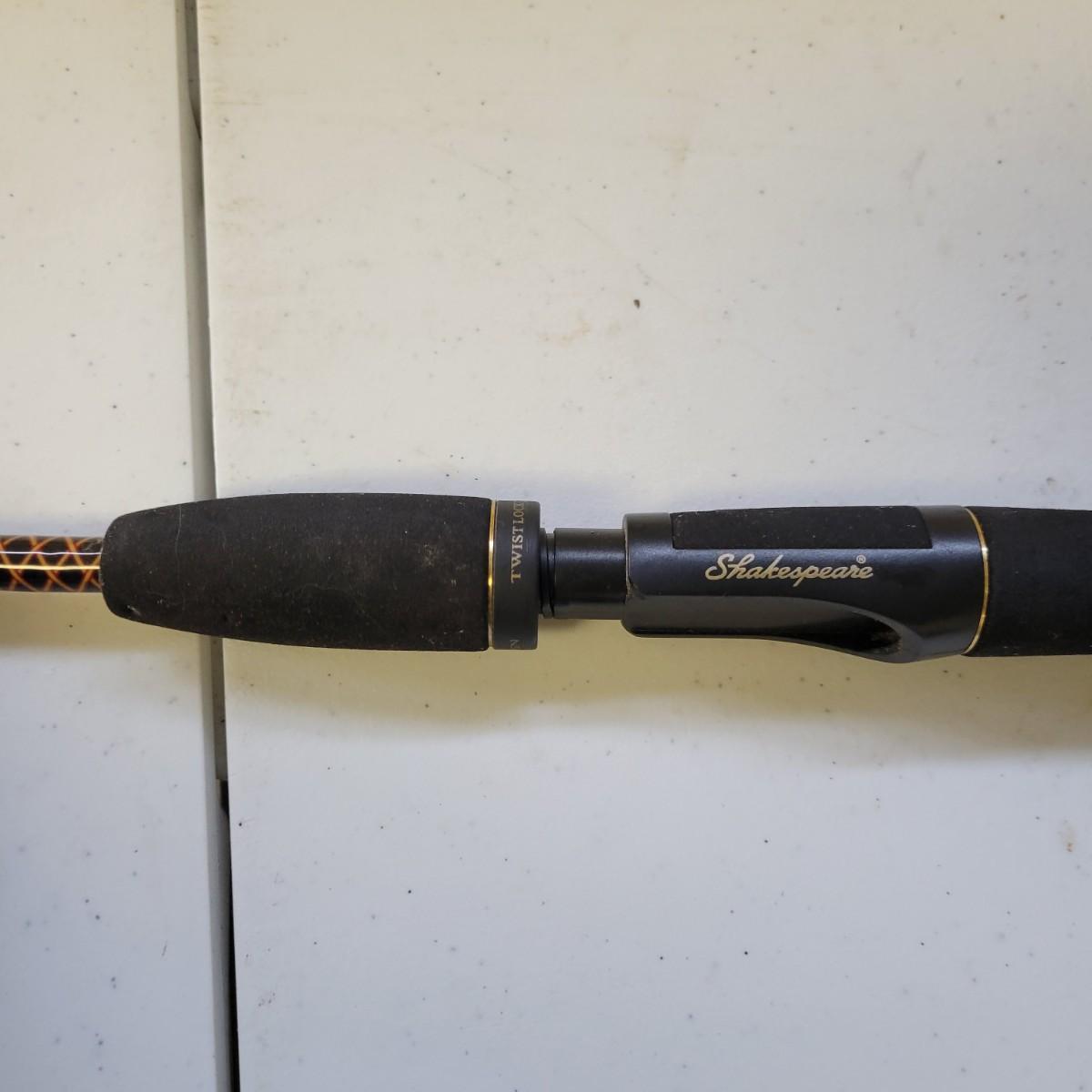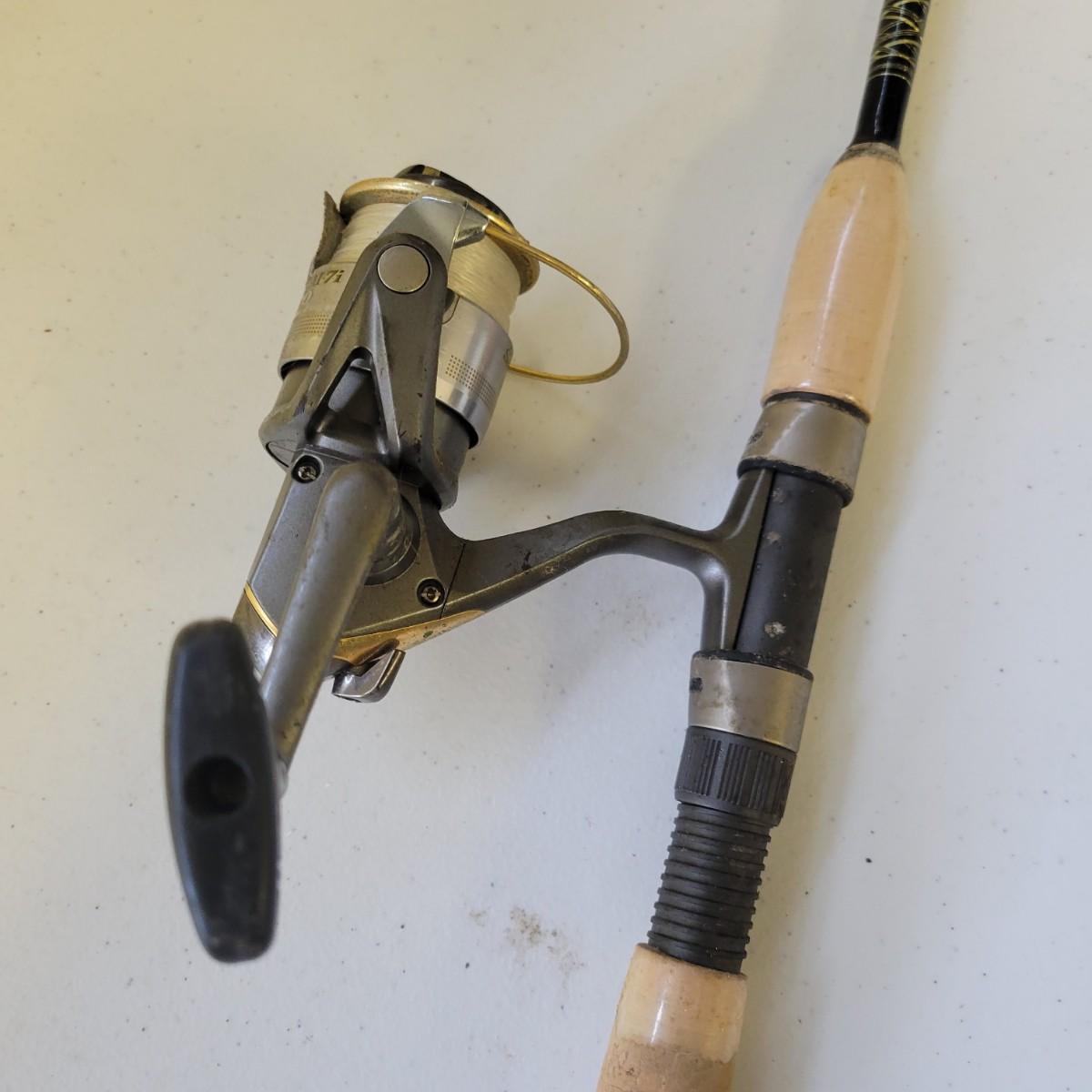 An assortment of ten rods and nine reels in good condition with no notable damage. The rods have no broken tips or missing guides. All reels have a smooth action and function as they should. The smallest rod is Shakespeare Ugly Stick at 5' and the largest rod is a Shakespeare Ugly Stick that is 7'. A variety of weights and actions ranging from ultra light to medium heavy. Lot also includes an extra samurai reel and a six slot, wall mounted rod holder. Local pickup only