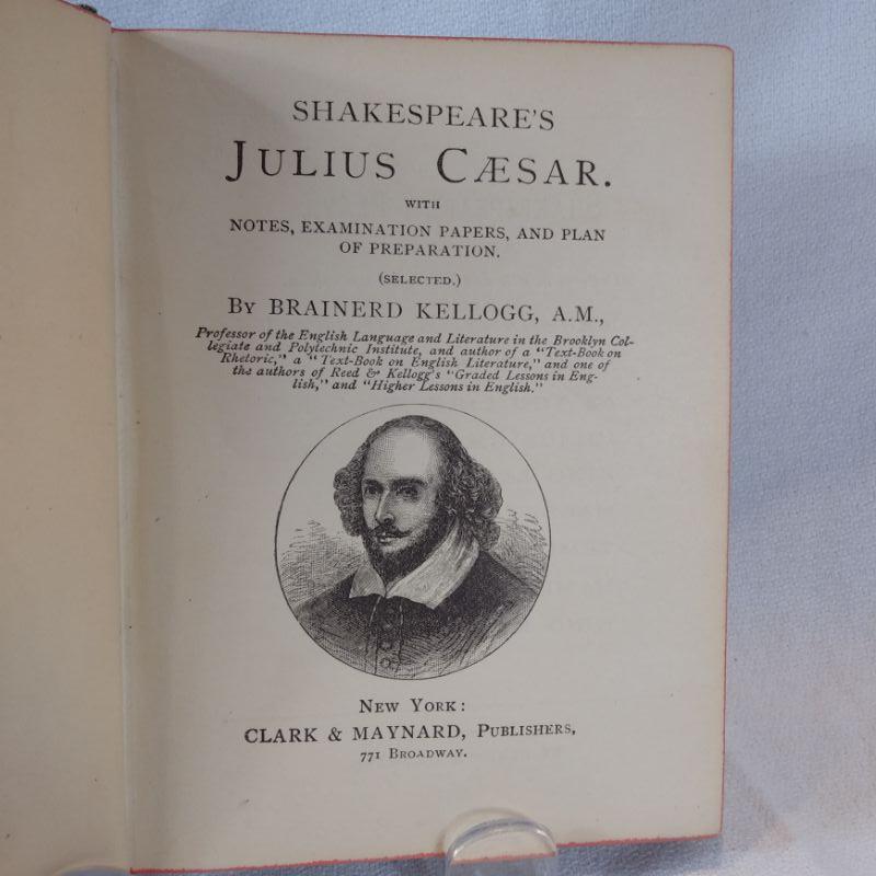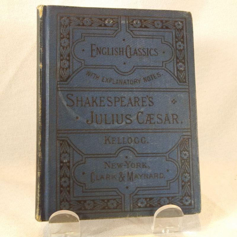 This is a tiny book of English Classics - With Explanatory Notes "Julius Caesar", selected by Brainerd Kellogg, A.M. Clark & Maynard Publishers, New York 1882. Cover has a drink set ring and spine shows wear, pages have yellowed some. It has 164 pages. On first blank page is the original owners name and address in her own beautiful penmanship in pencil Outside shows more wear than the inside. Still pretty good for 137 year old book.
