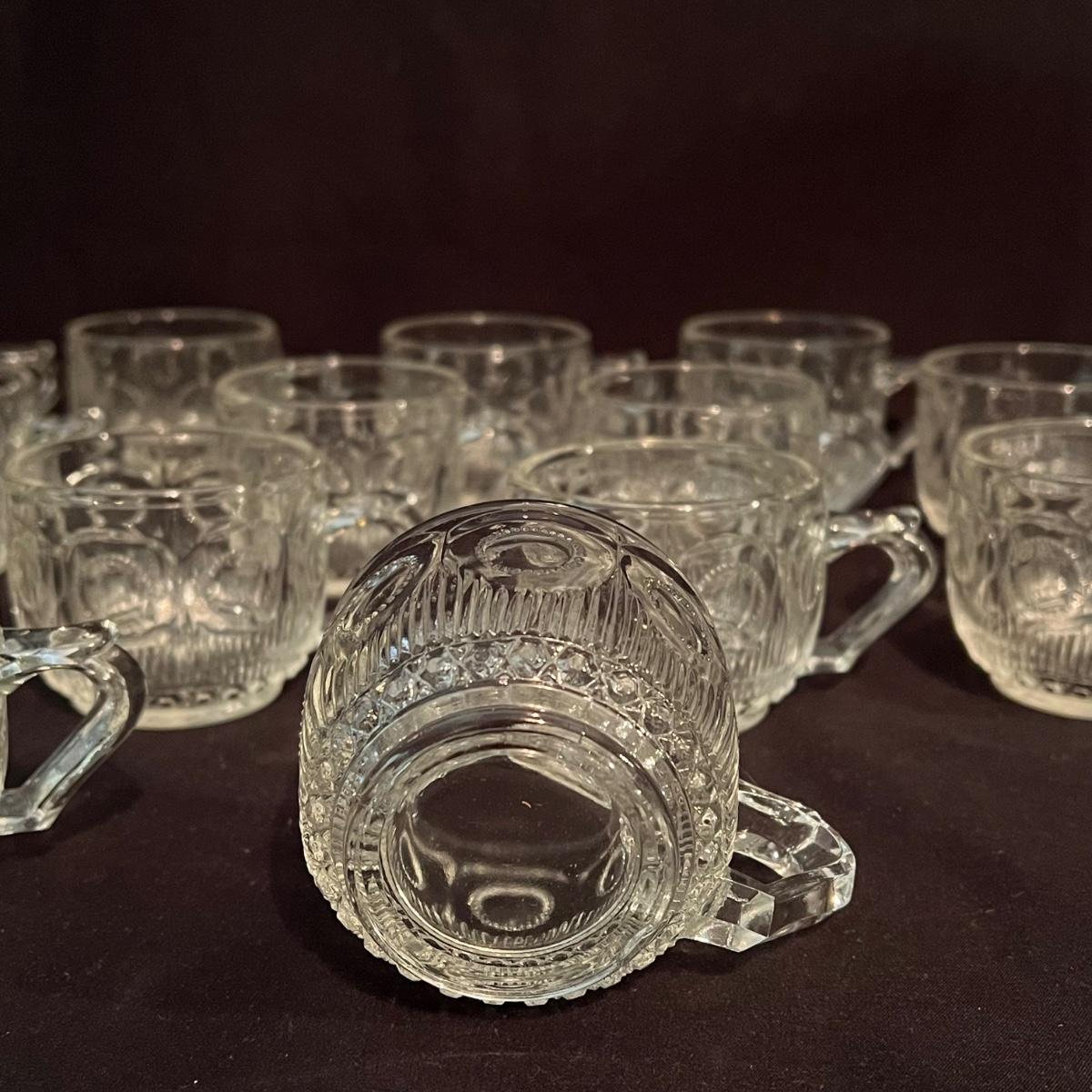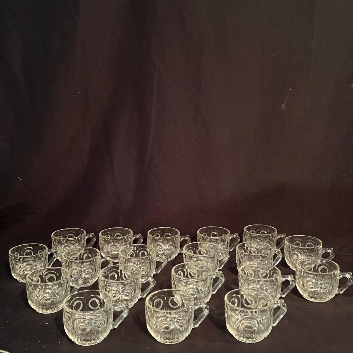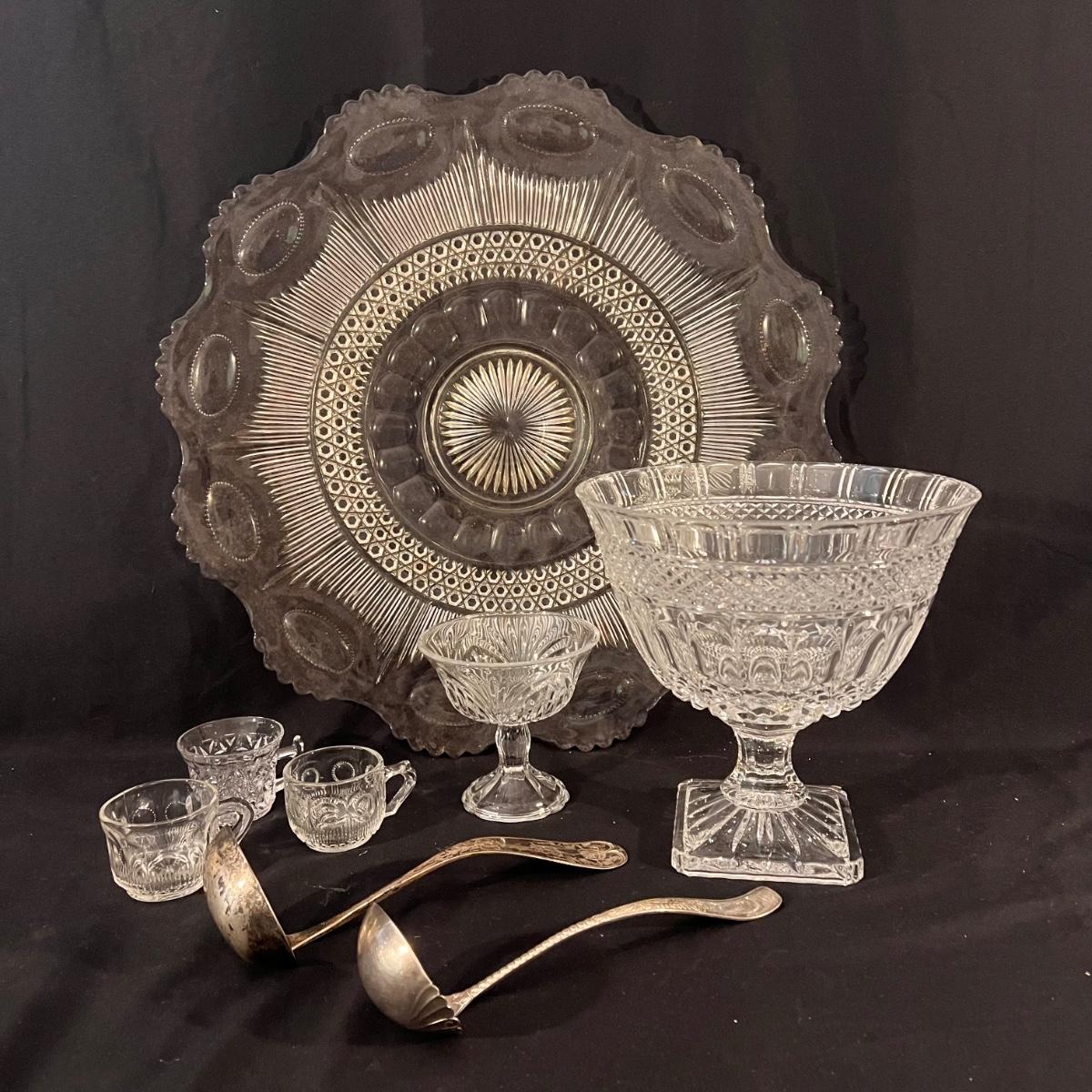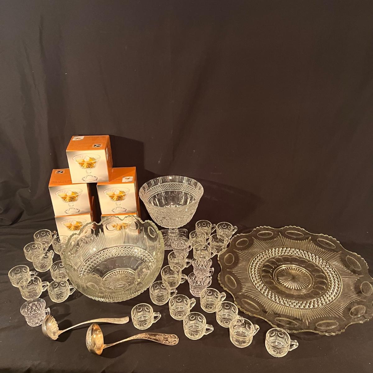 There are 29 glass teacups, one large serving platter, one large bowl, five Topaz footed dessert bowls, two silver serving spoons, and one Shannon Crystal by Godinger Brandon Bowl. The largest item is the circular serving platter that measures 23”D x 2”H. The smallest items are the glass teacups that measure 3.5”D x 2.75”H. Local pickup only.