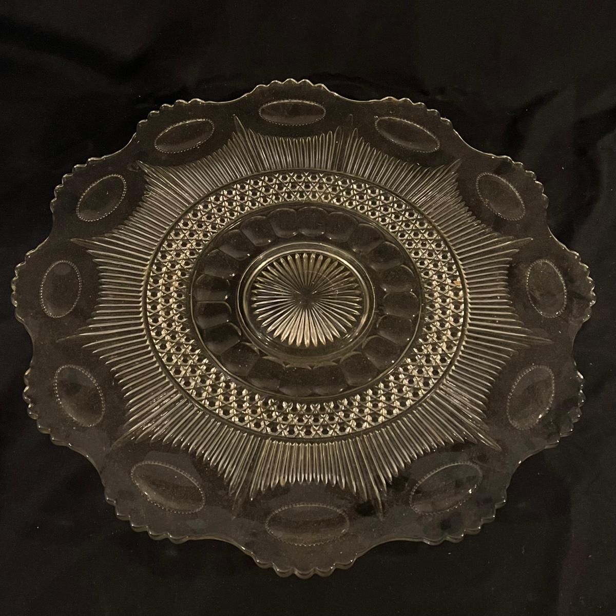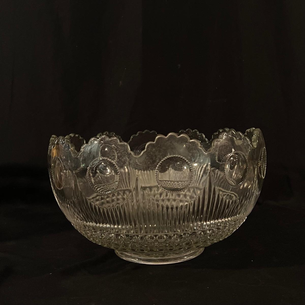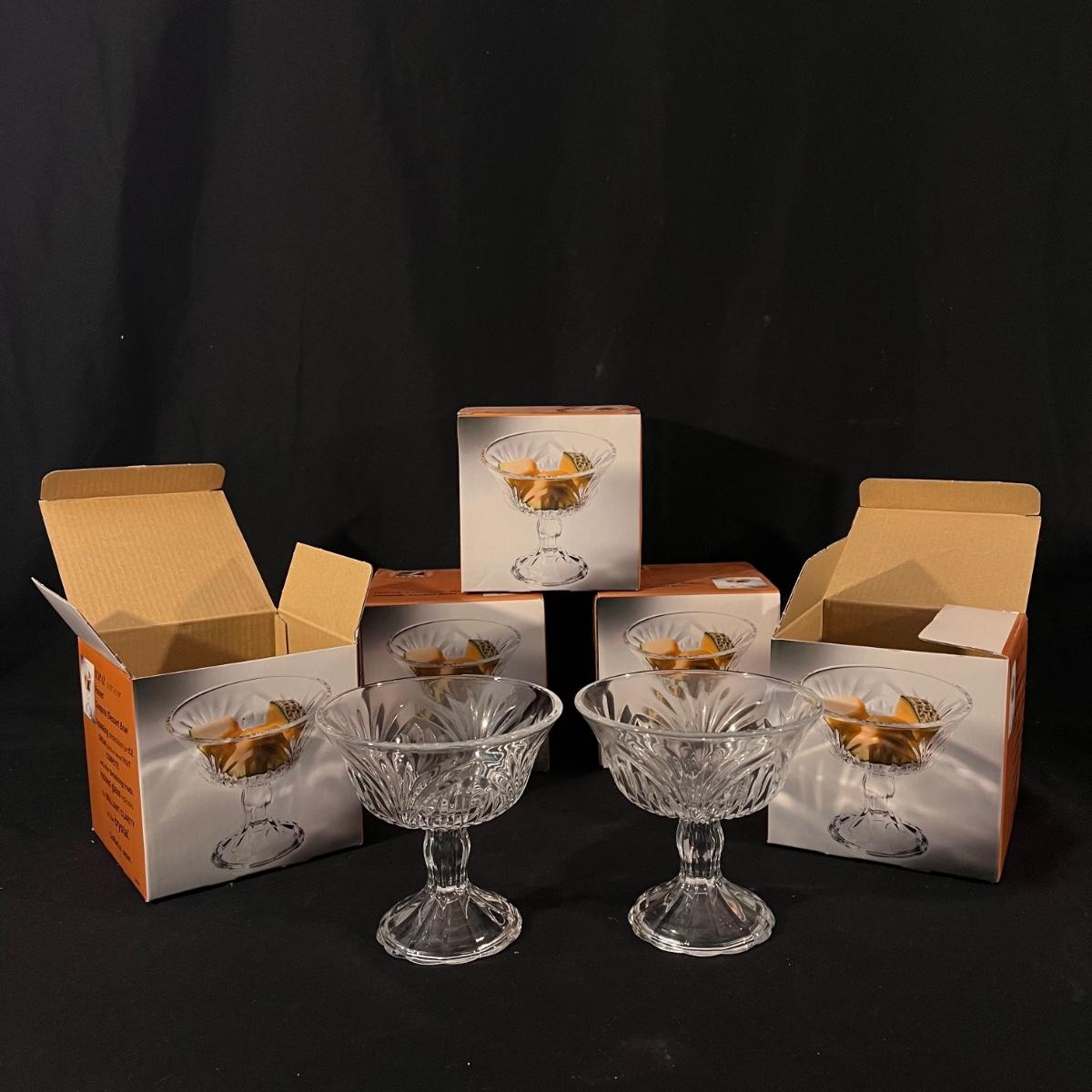 There are 29 glass teacups, one large serving platter, one large bowl, five Topaz footed dessert bowls, two silver serving spoons, and one Shannon Crystal by Godinger Brandon Bowl. The largest item is the circular serving platter that measures 23”D x 2”H. The smallest items are the glass teacups that measure 3.5”D x 2.75”H. Local pickup only.