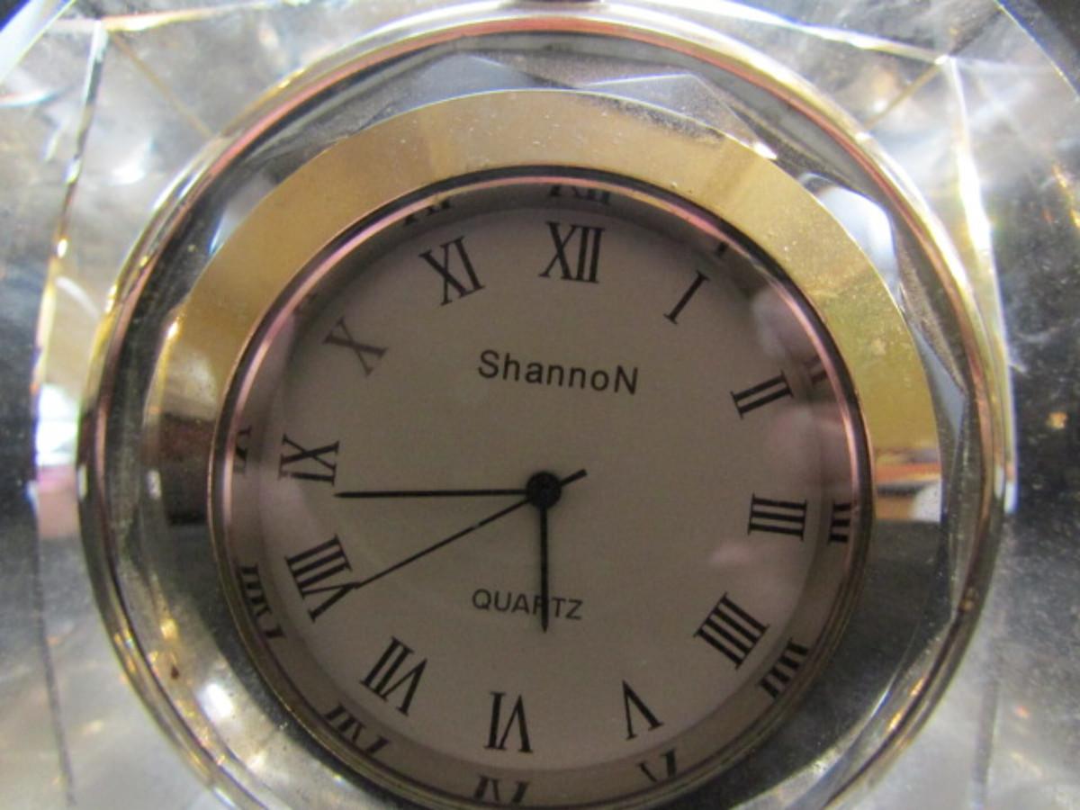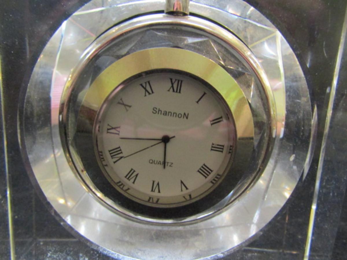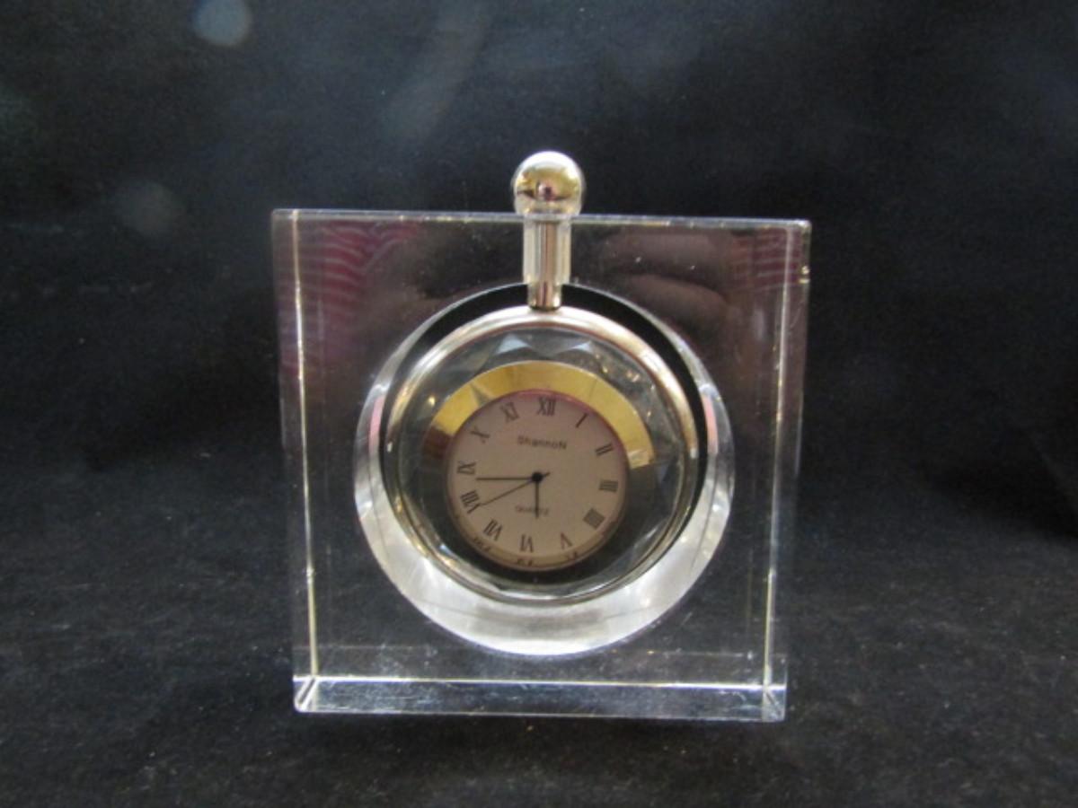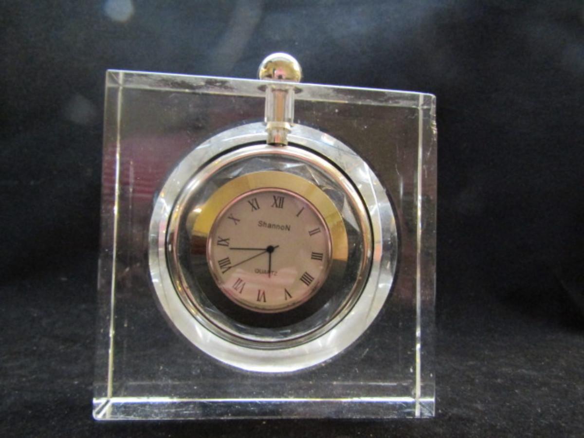 Shannon Crystal Desktop Clock- Hanging Pocket Watch Style (#30). Battery operated. Has small damaged area in one corner- is not currently running.