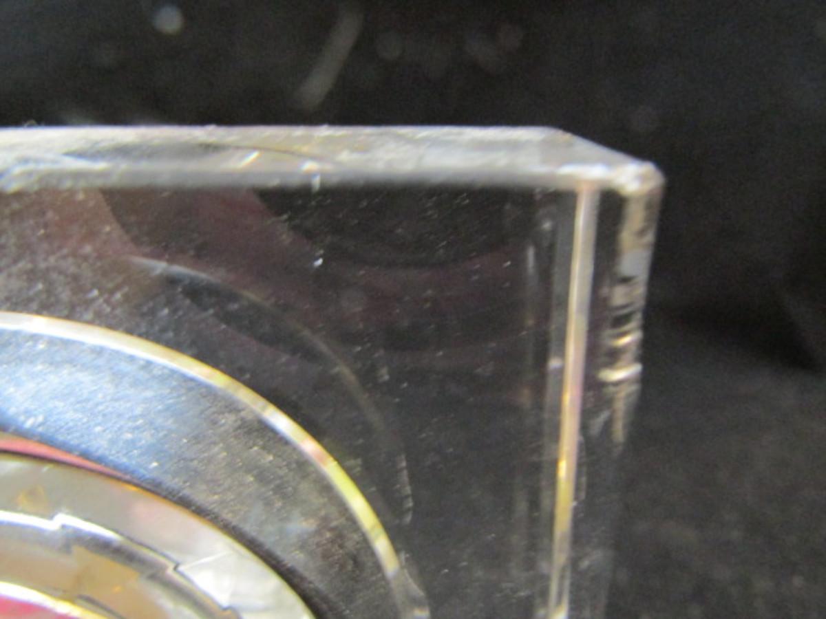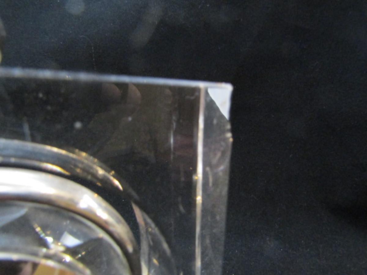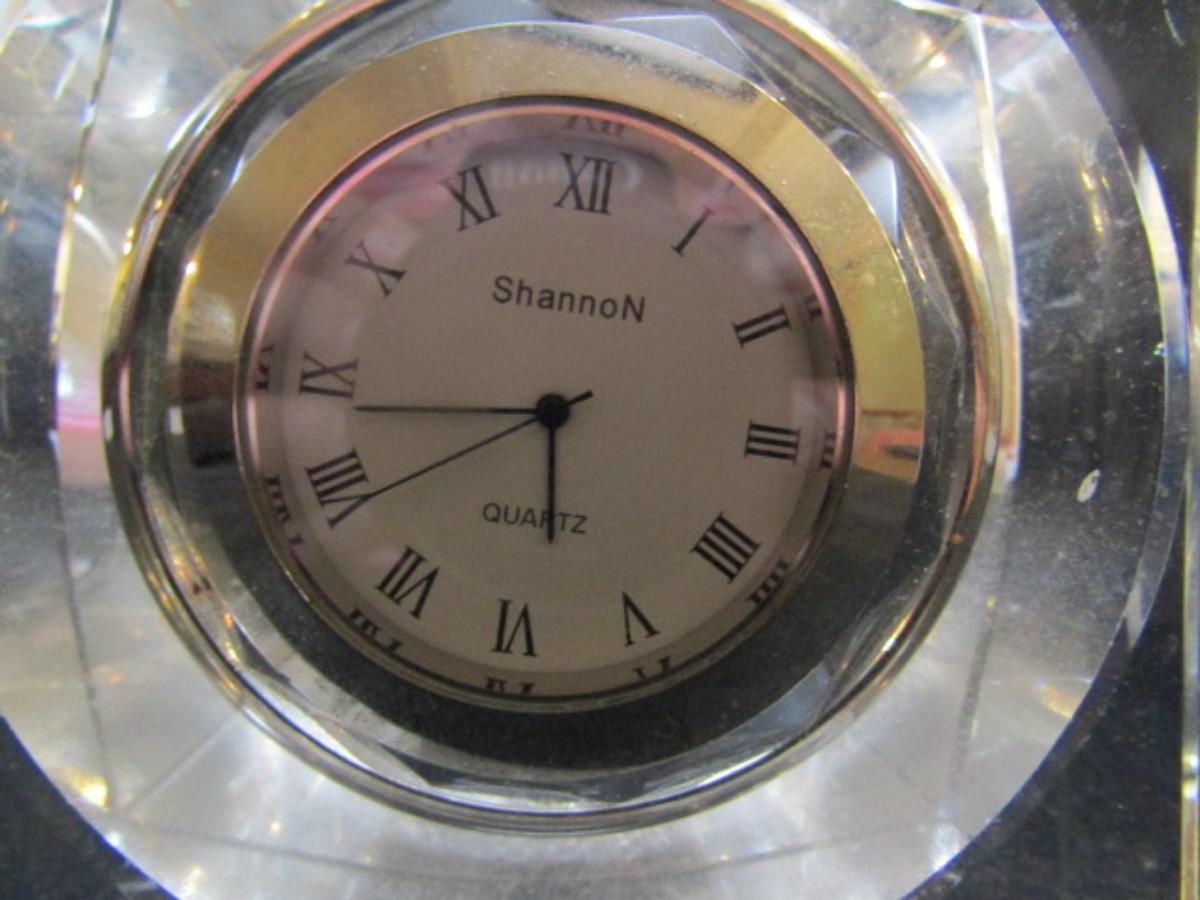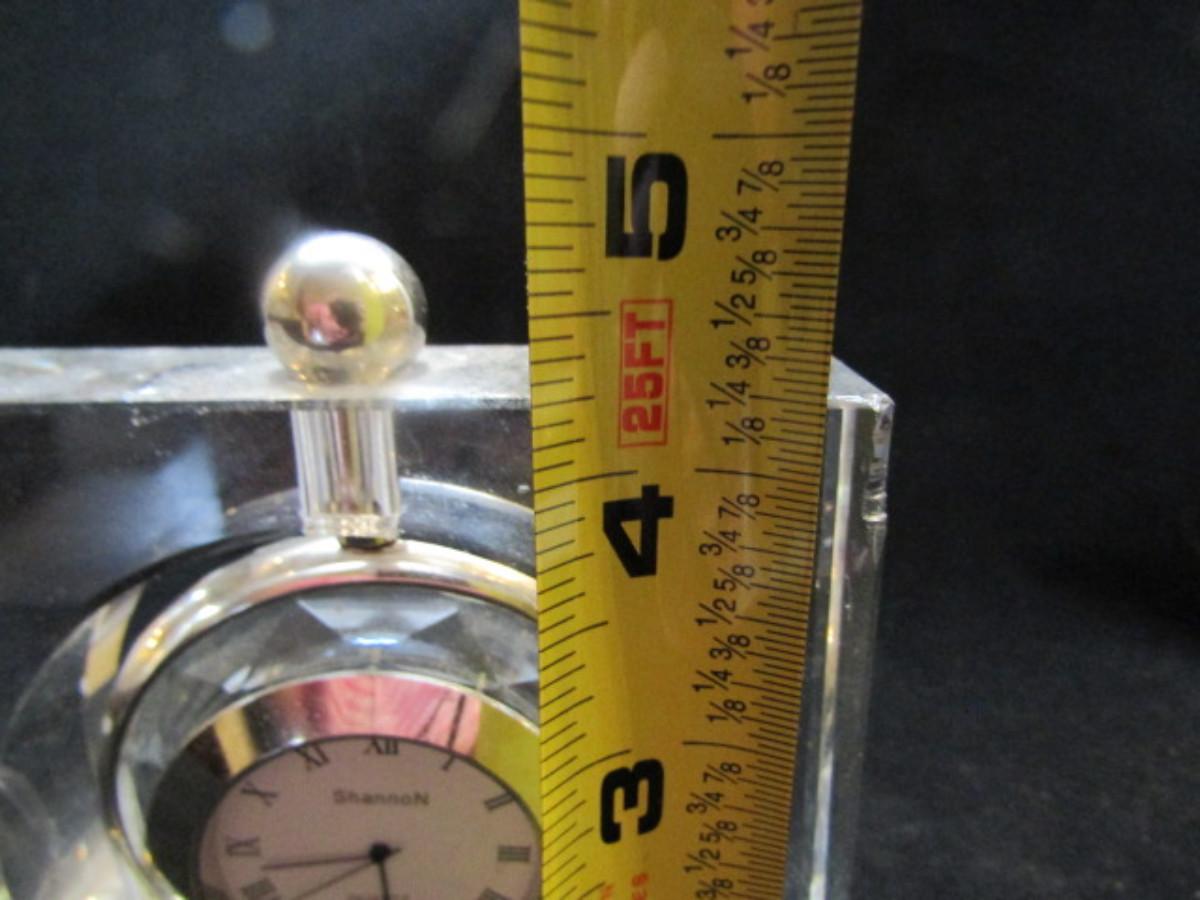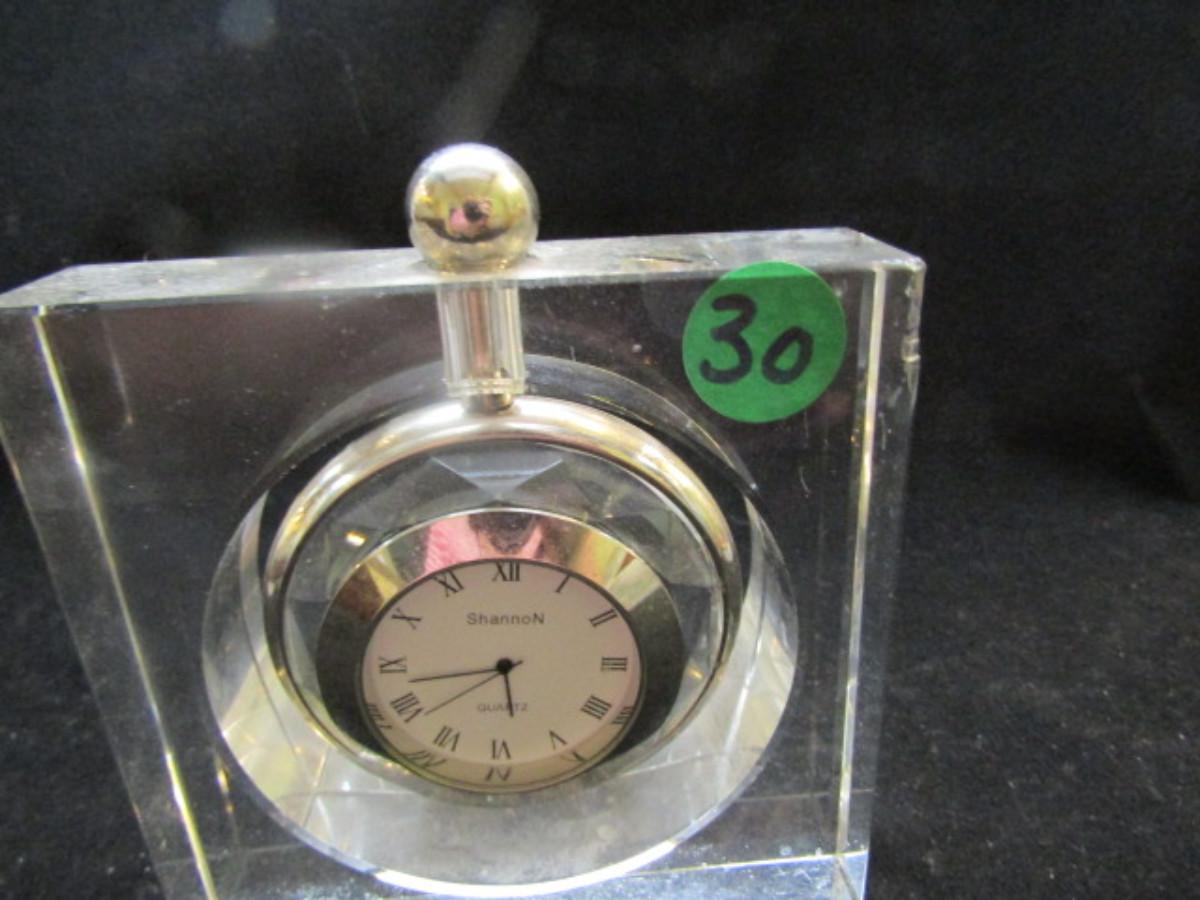 Shannon Crystal Desktop Clock- Hanging Pocket Watch Style (#30). Battery operated. Has small damaged area in one corner- is not currently running.