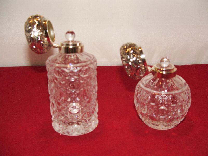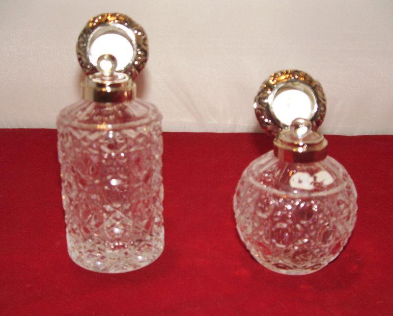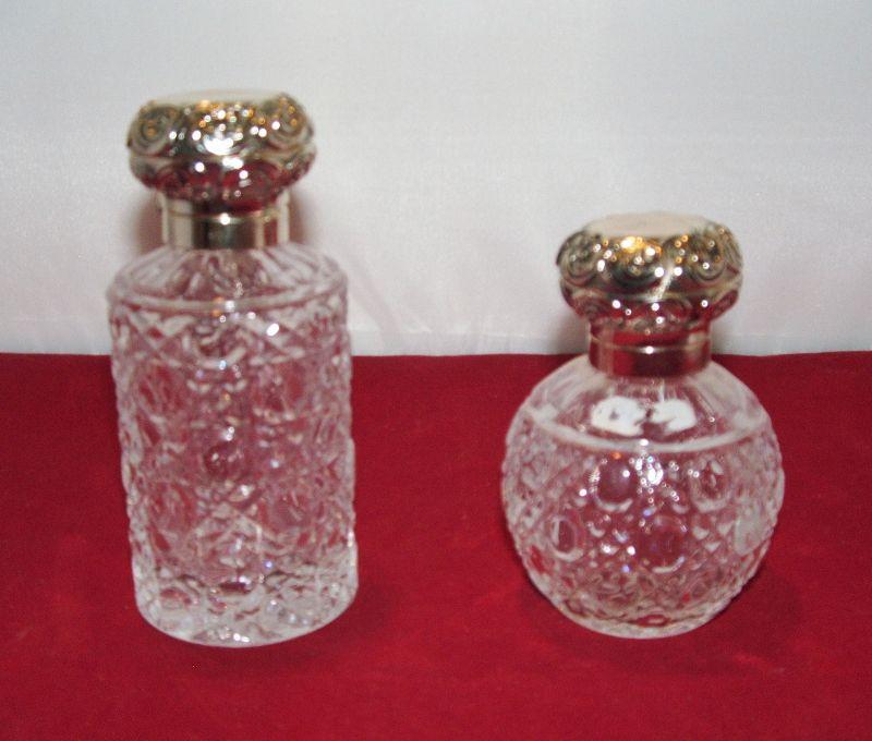 Shannon lead crystal perfume bottle with Godinger silver plated lid and glass stopper. This taller bottle stands 5 1/4" high. In good condition, with a few marks on top. Smaller bottle measures approx. 4 1/2" tall and approx. 9" around. This bottle has scratches on the very top lid which can be seen in last photo. Both of these bottles are made with 24% lead crystal and are quite substantial. Neither of these bottles have been used, only displayed..