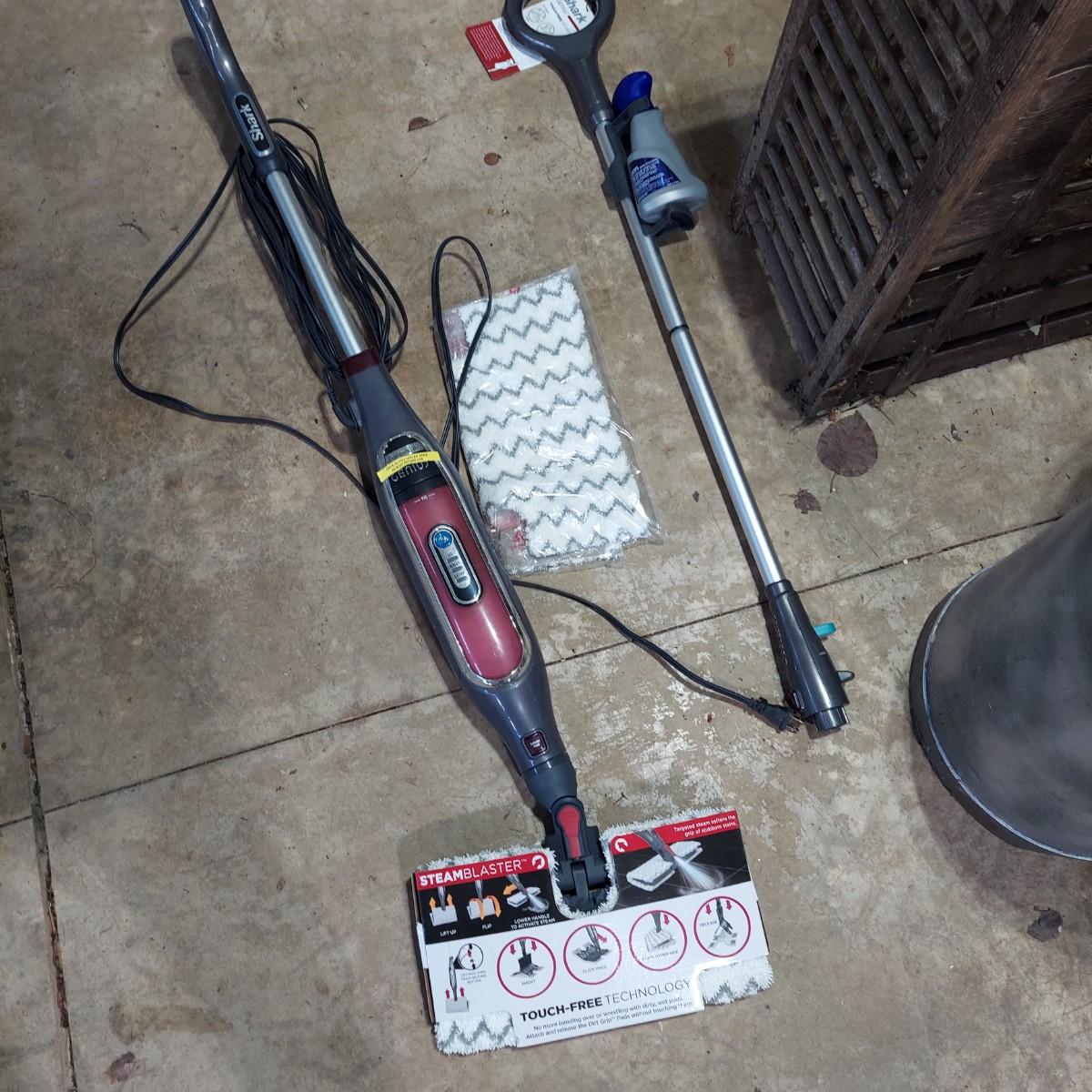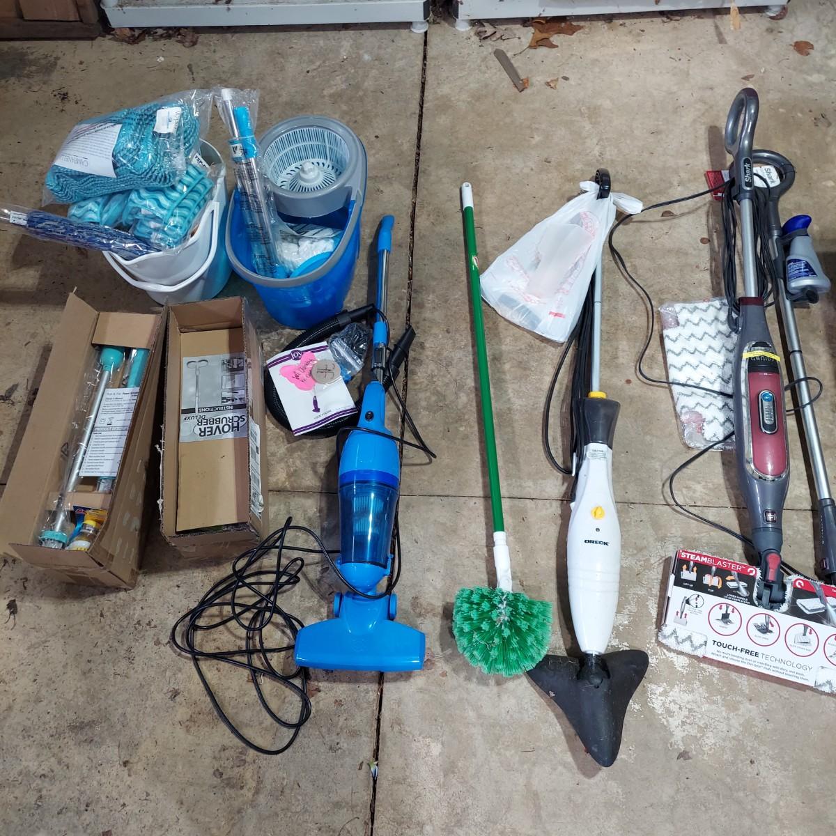 Large lot of cleaning tools and supplies including Shark steam mop with interchangeable handles and new pads and an Orek steam cleaner with new pad. Plus a Joy Mangano stick vacuum, a Hover Scrubber Deluxe and a Tub & Tile Scrubber. Also come with several cleaning supplies, rags, sponges and more. Please see photos for details. Local Pickup Only