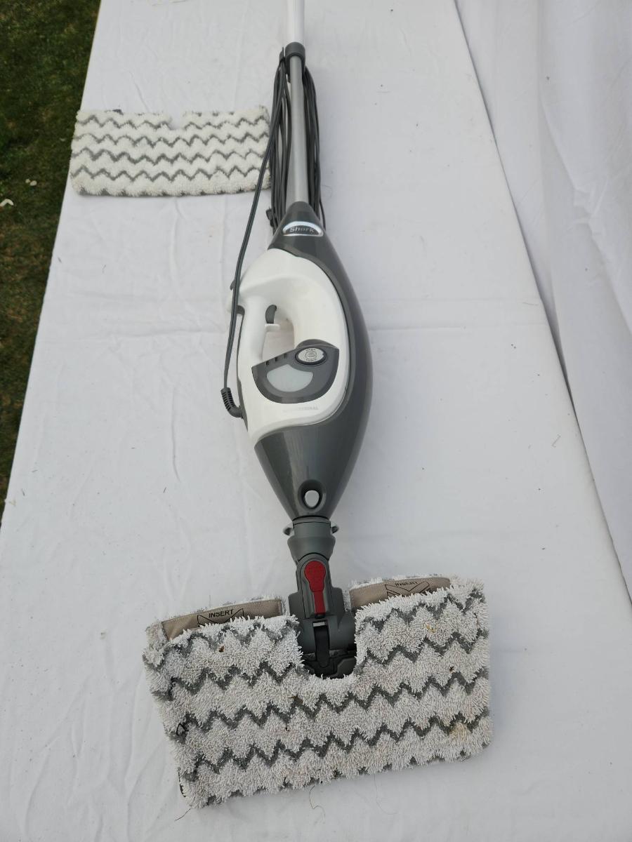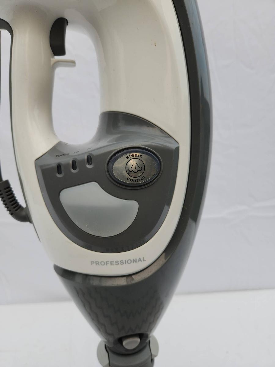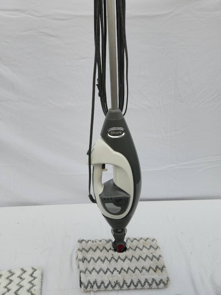 Shark Professional steam mop with a gray and white body, featuring a steam control button for adjustable steam settings. Includes a detachable cleaning pad and cord for power. Designed for sanitizing and deep cleaning hard floors. Comes with an additional replacement cleaning pad, as shown.