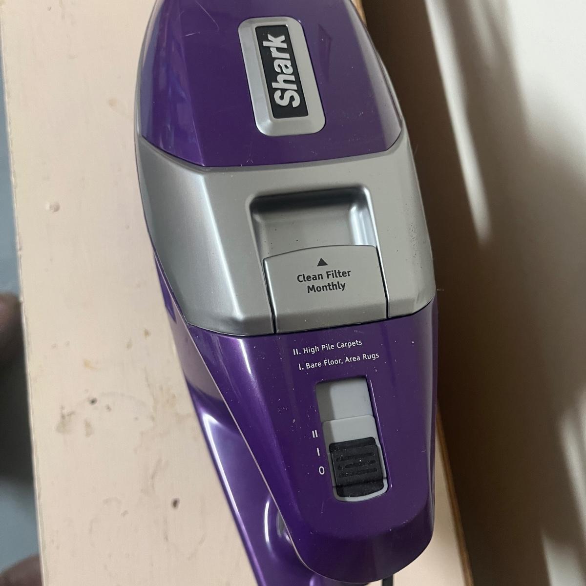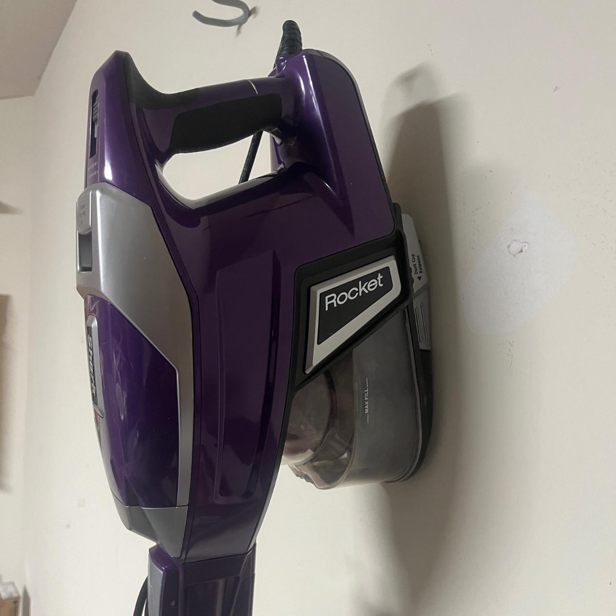 Lot includes a Shark Rocket corded stick vacuum that powered on when plugged in. Vacuum measures 10” x 10.5” x 46”H.
