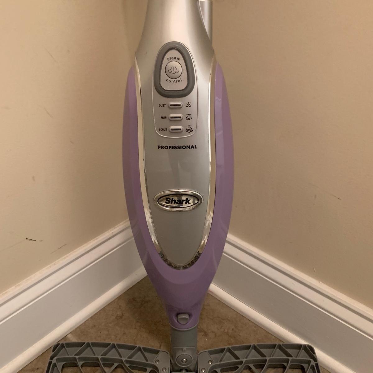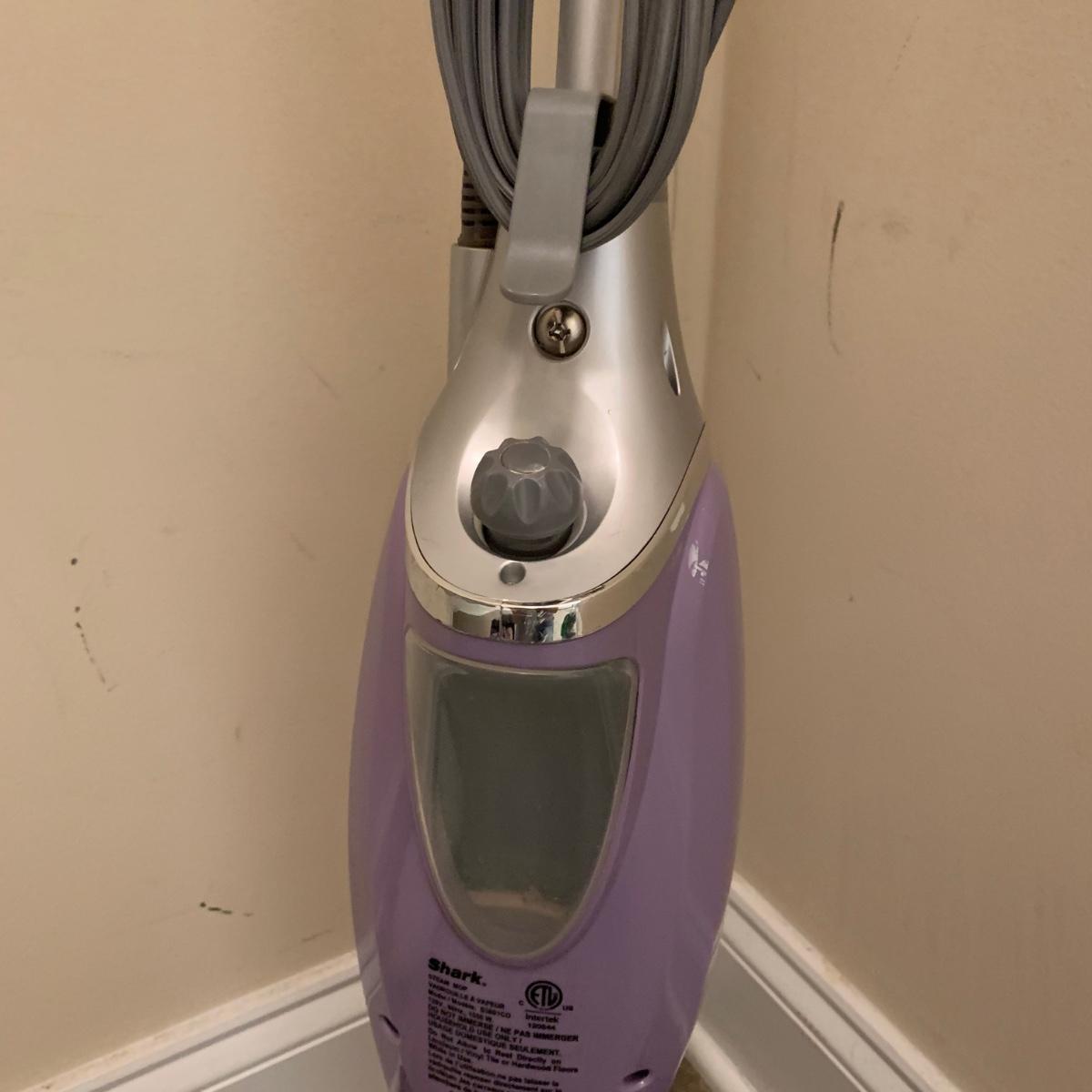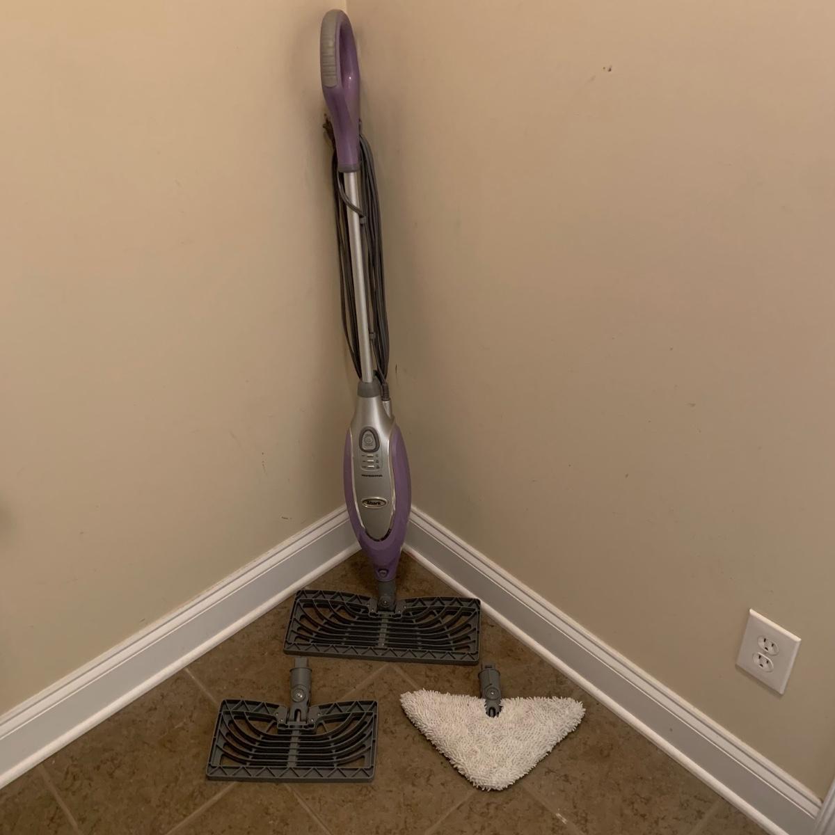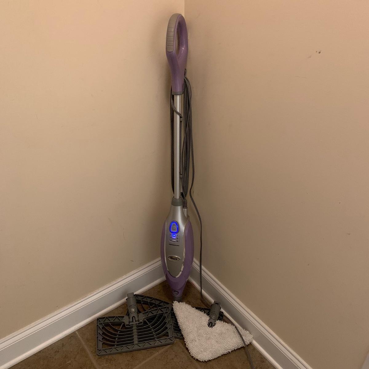 Shark electric steam mop, model S3601CO. Comes with three attachments. Powered on when plugged in.