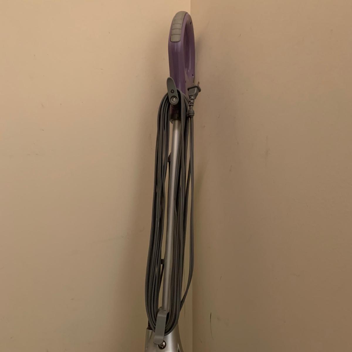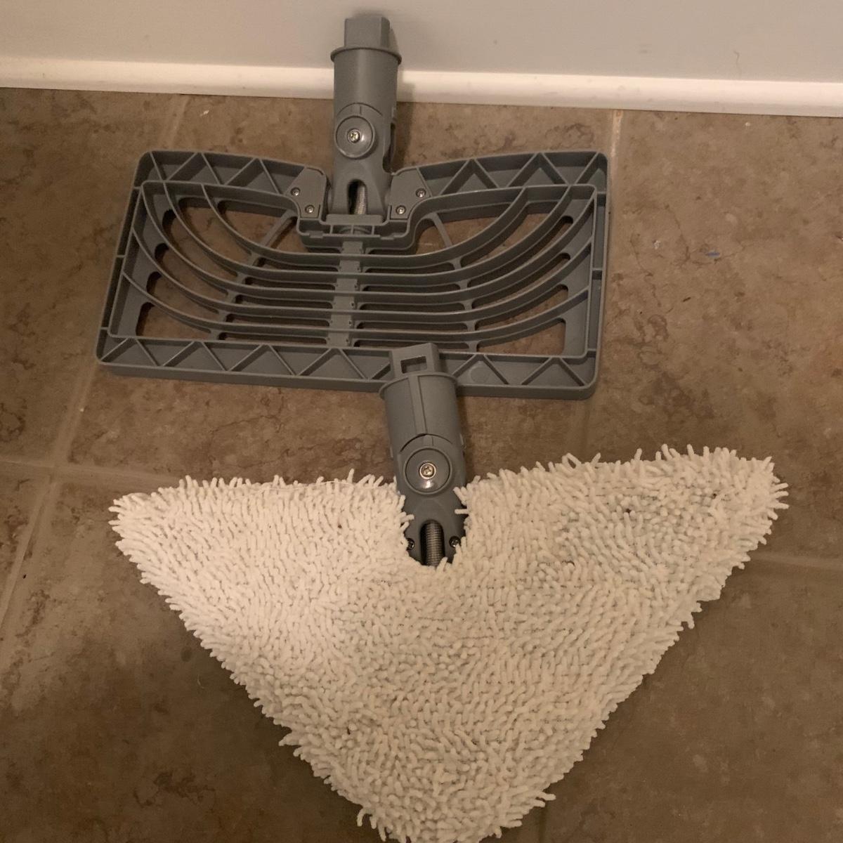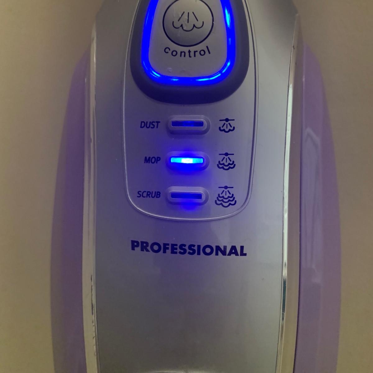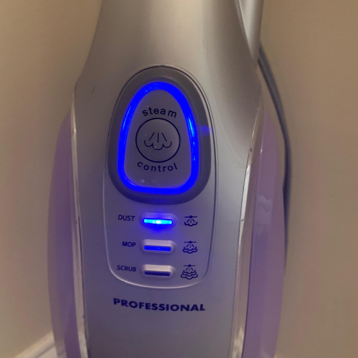 Shark electric steam mop, model S3601CO. Comes with three attachments. Powered on when plugged in.