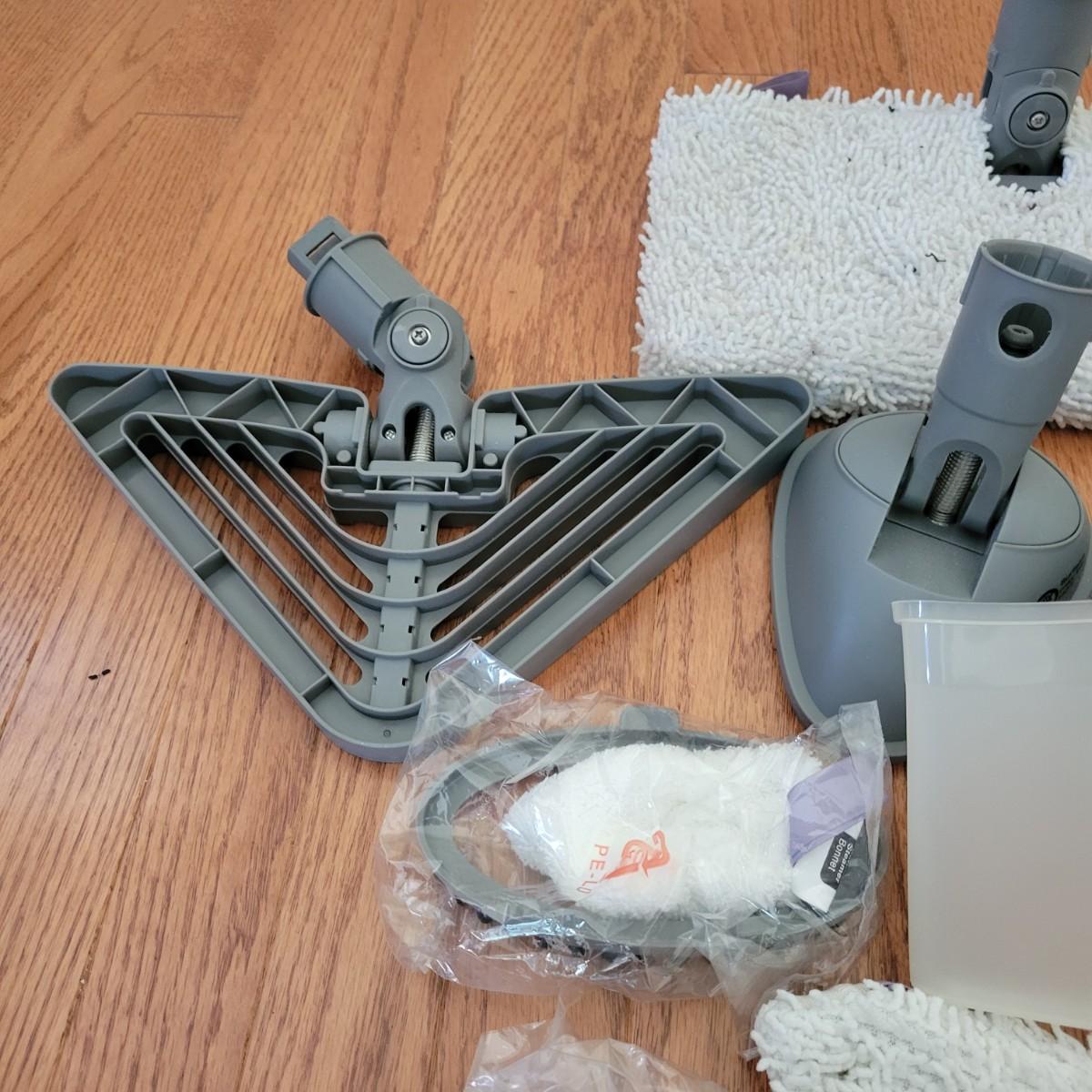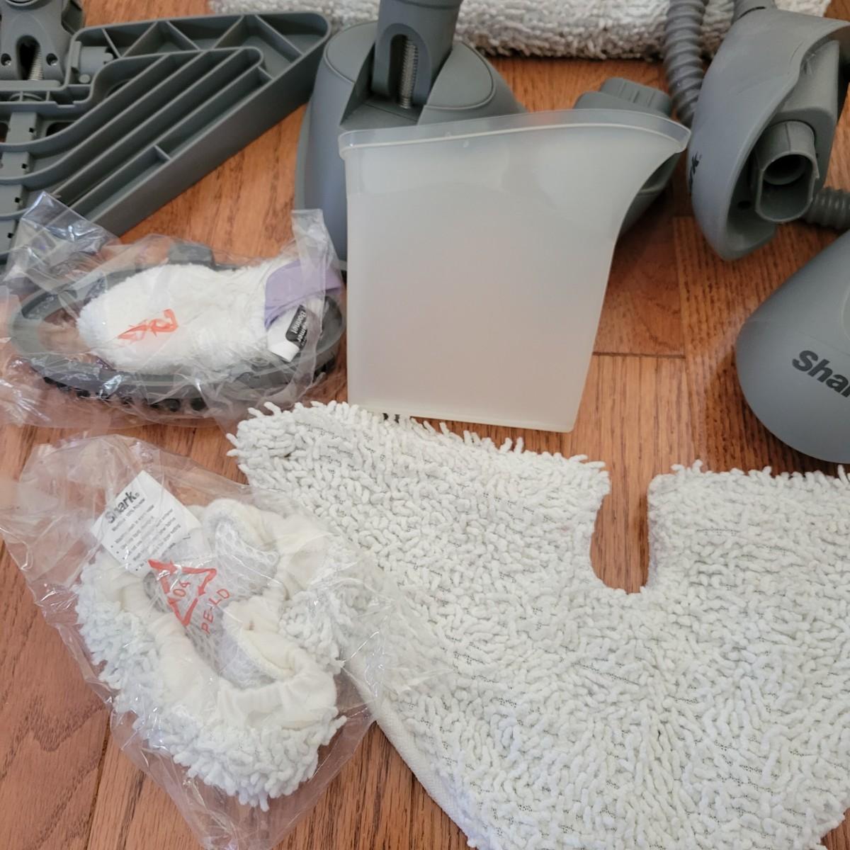 A Shark steam mop that powered on when plugged in. It measures approximately 12" x 7" x 47"H. It includes an assortment of accessories and its original manual. Local pickup only