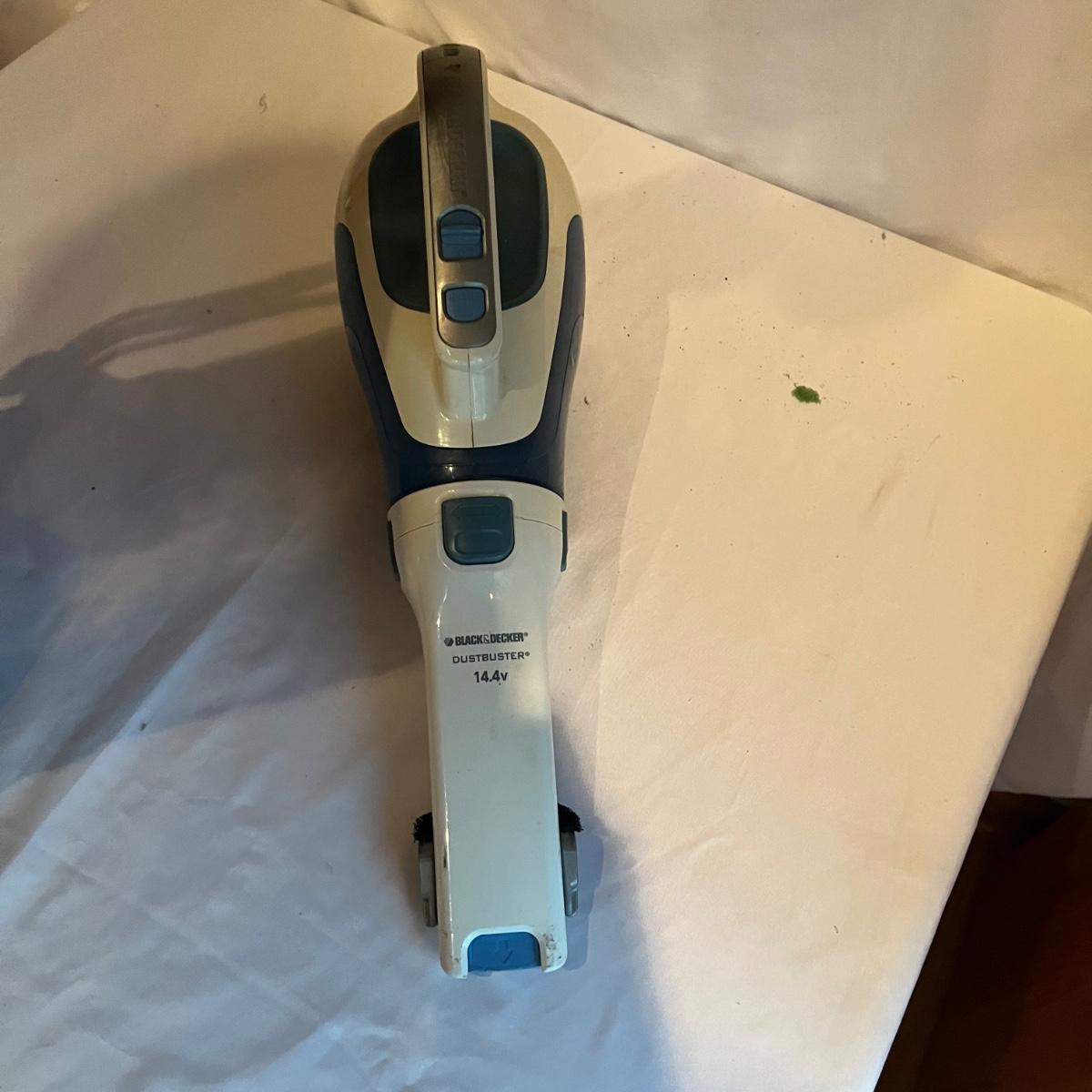 Lot includes a Shark vacuum and a Black & Decker 14.4V Dustbuster. Both vacuums powered on when plugged in.