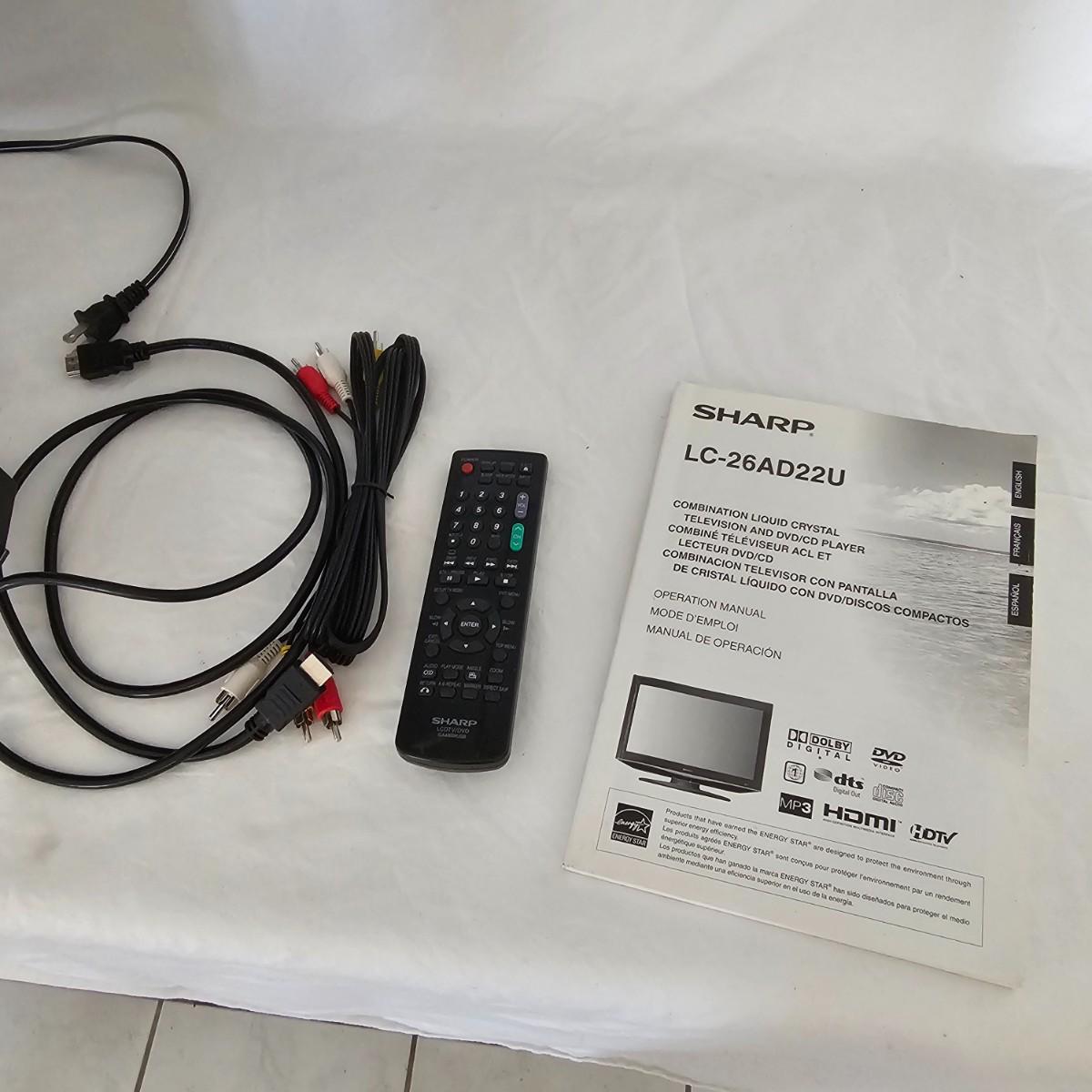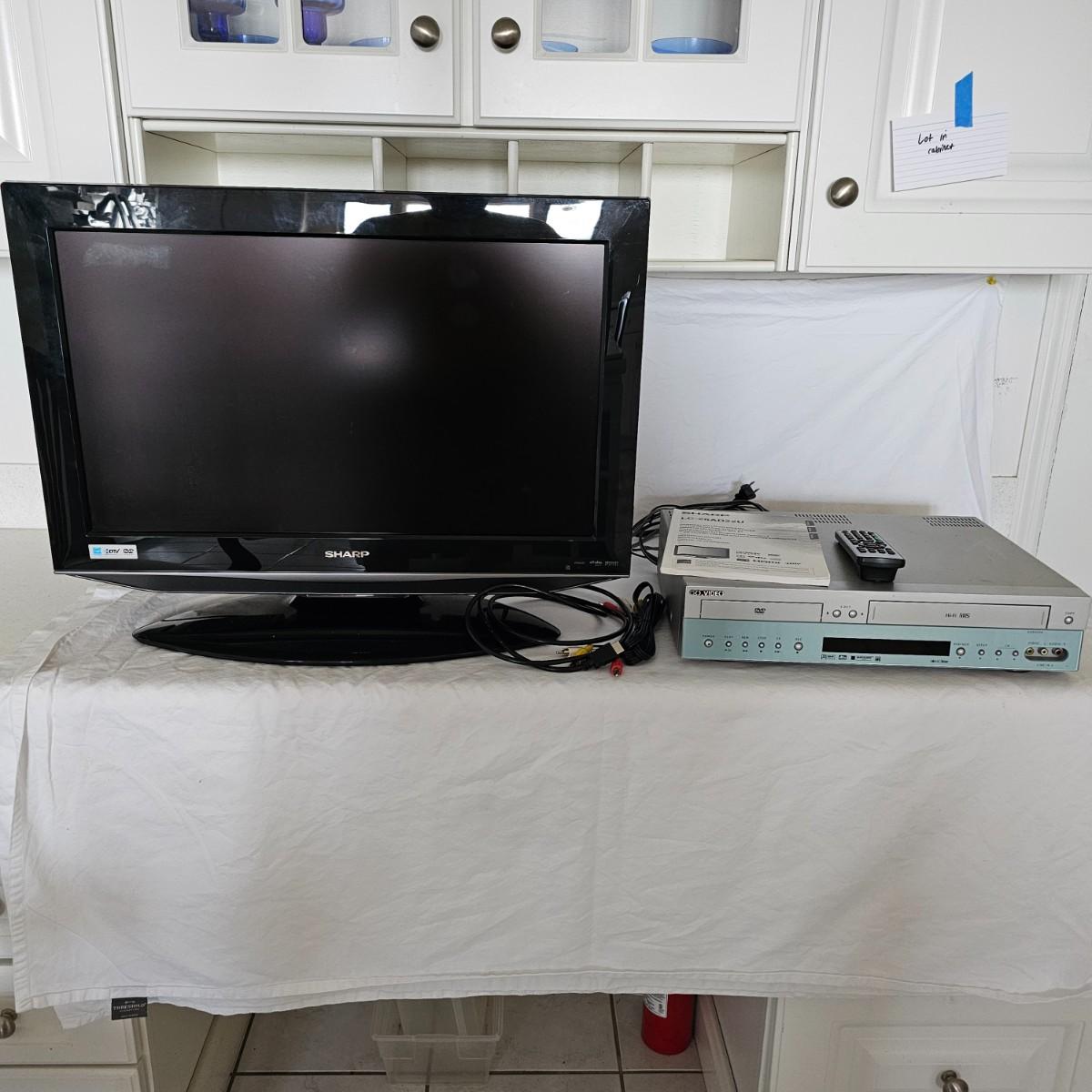 One Sharp HDTV (powered on when plugged in) with a built in DVD player, manual and remote. Comes with power cord and cables. Unit measures 26" x 9" x 19.5"H. Also included is a GoVideo DVD/VCR combo unit, no remote. One set of RCA cables included. Measures 17" x 13" x 4"H. See photos for details. Local pickup only.
