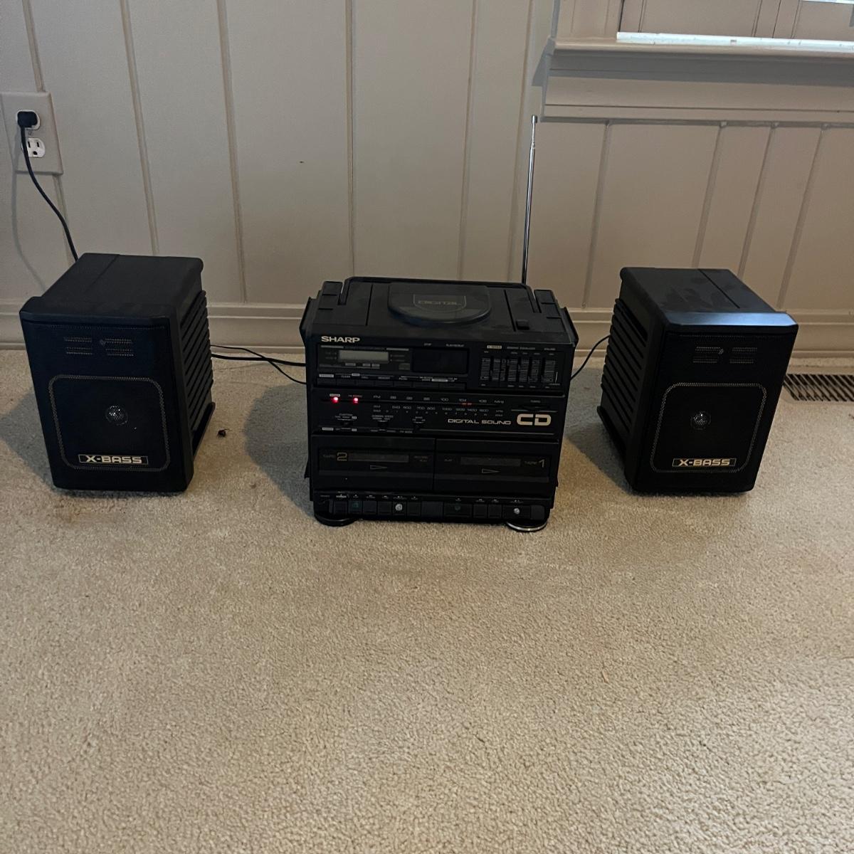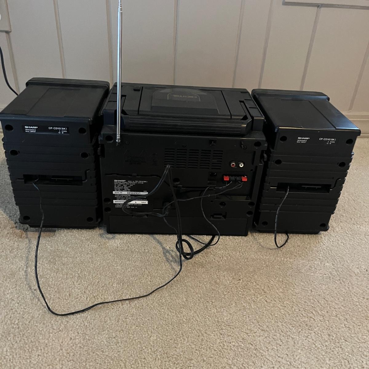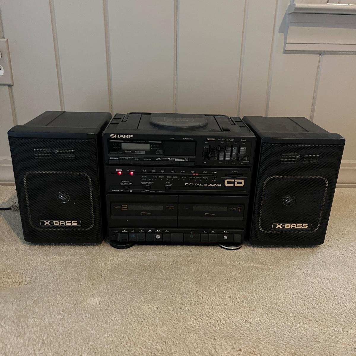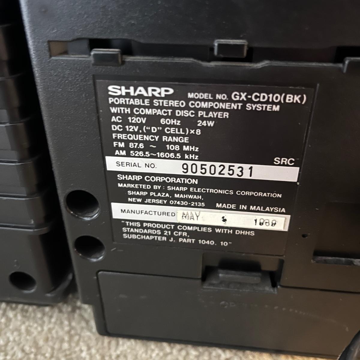 Lot includes a Sharp AM/FM CD & cassette player (Model GX-CD10(BK)) with removable speakers. Boombox powered on when plugged in. Boombox measures 24” x 8.5” x 20”H.