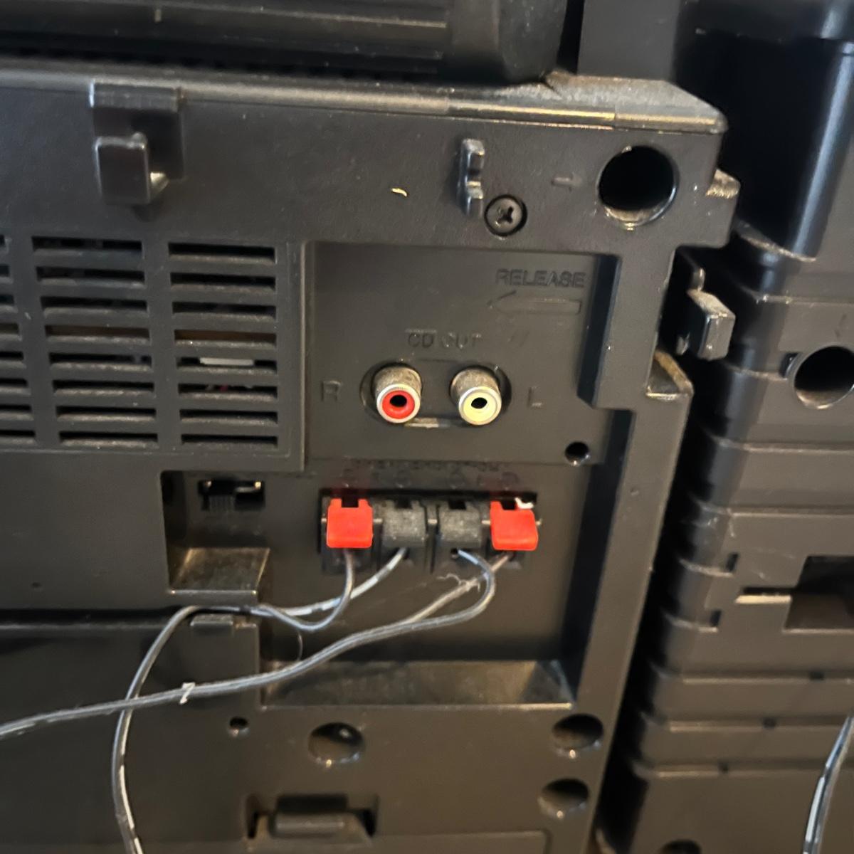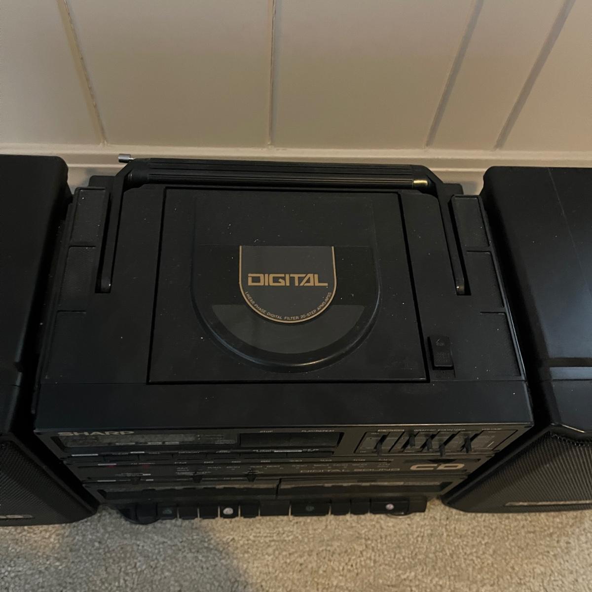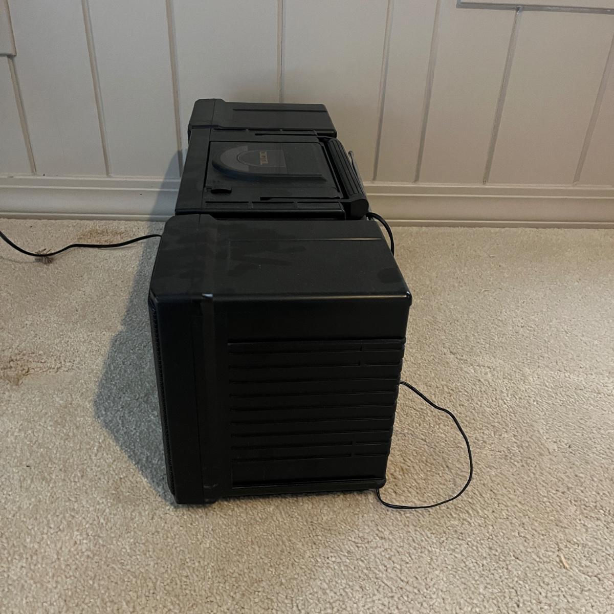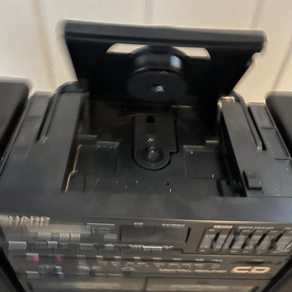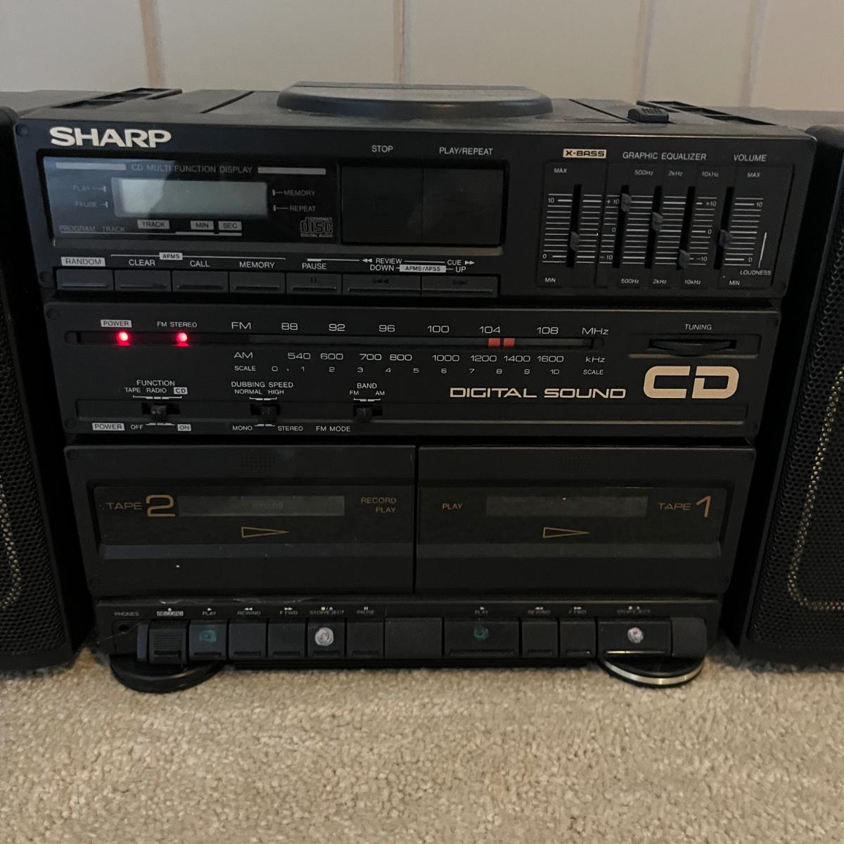 Lot includes a Sharp AM/FM CD & cassette player (Model GX-CD10(BK)) with removable speakers. Boombox powered on when plugged in. Boombox measures 24” x 8.5” x 20”H.