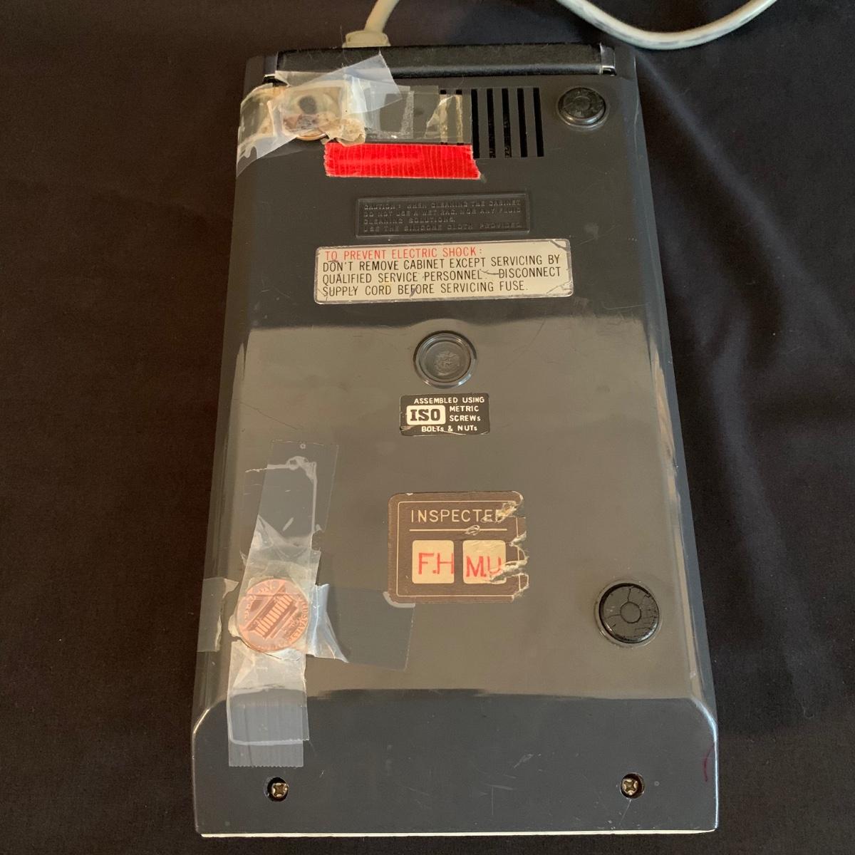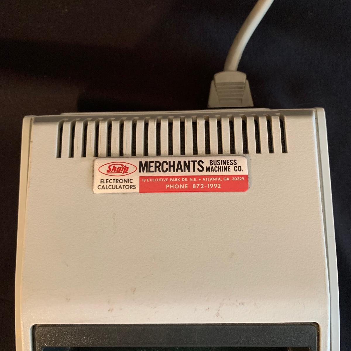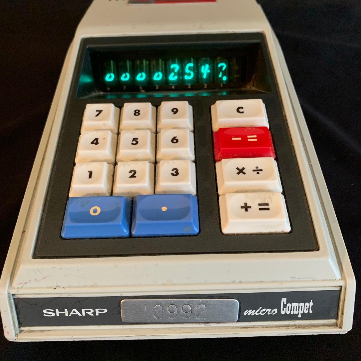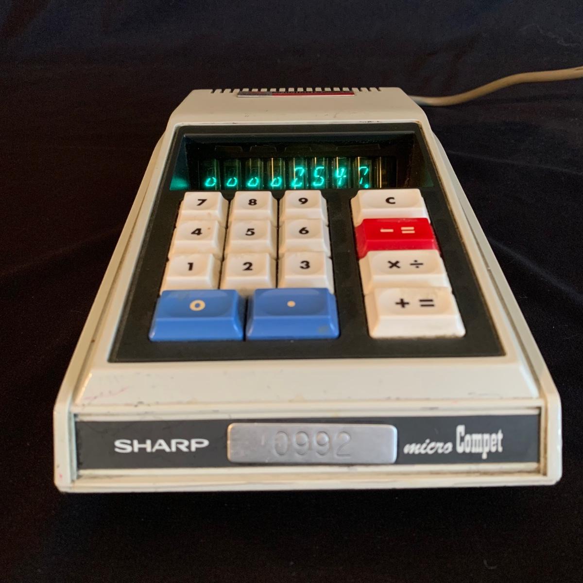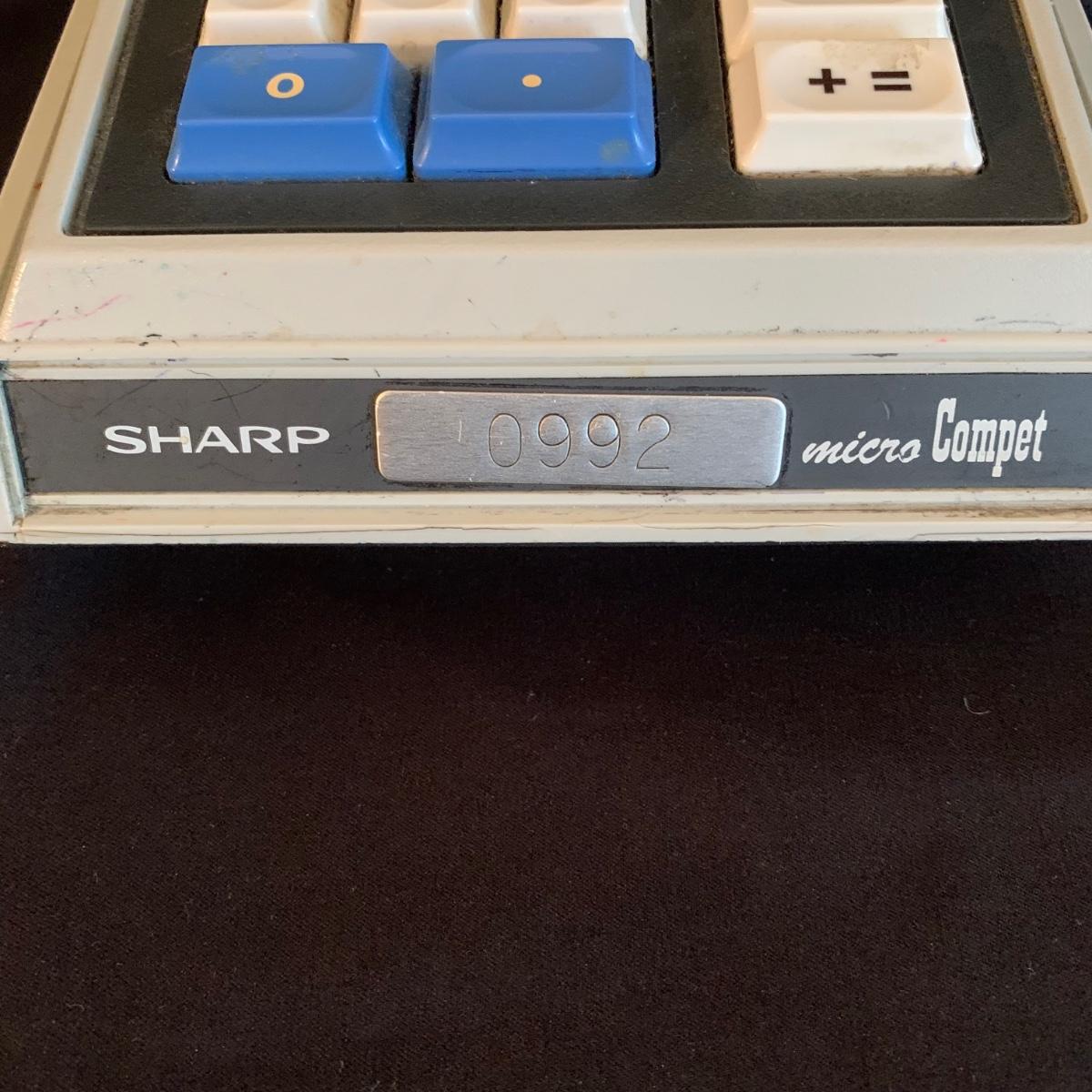 Sharp Micro Compet Electronic Calculator, model QT-8D. Powers on. Two of the rubber pads on the bottom are missing and have been replaced with pennies, see photos. This calculator has a lot of life left! Shipping available.