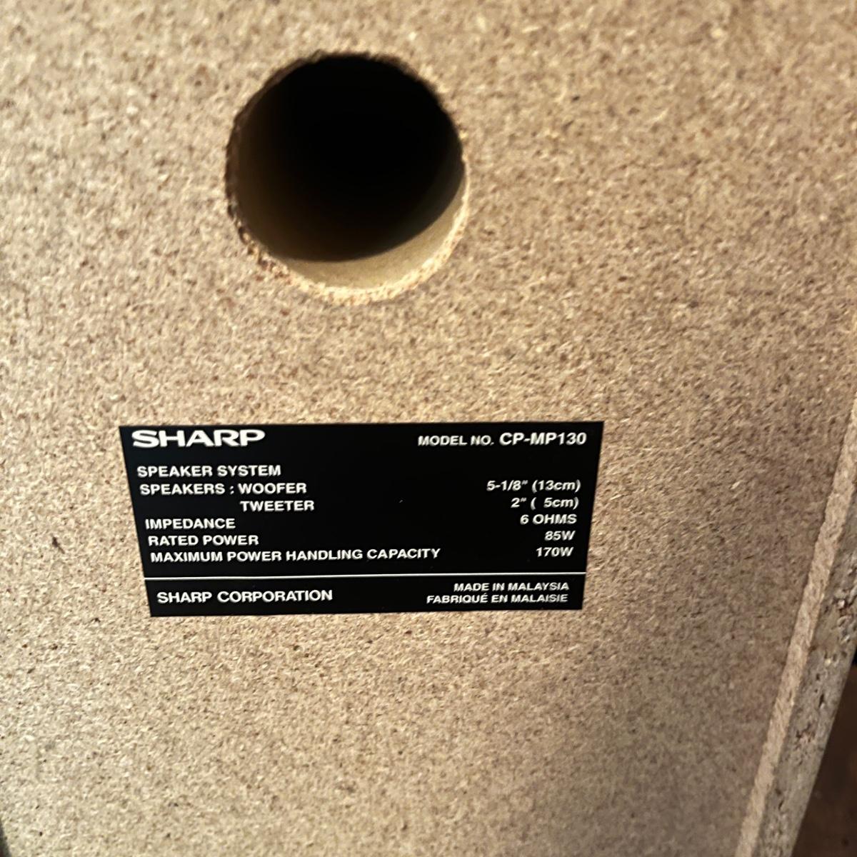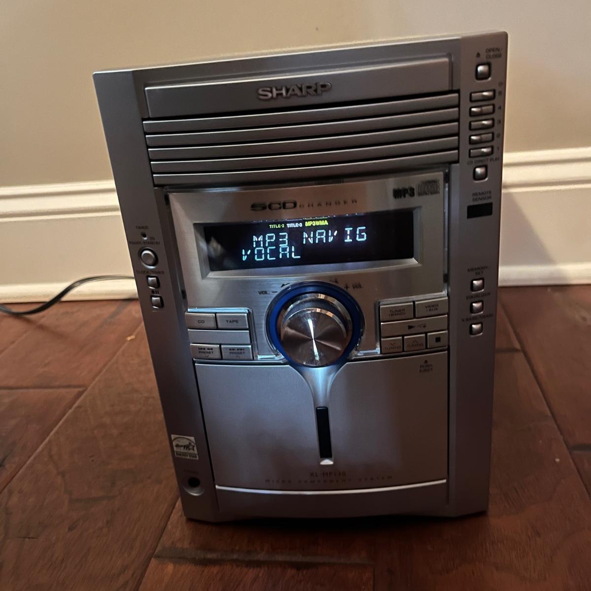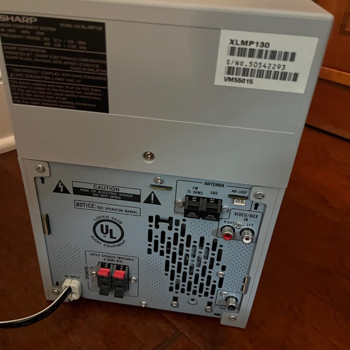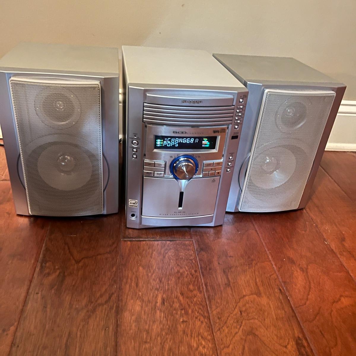Lot includes a Sharp Micro component stereo with five CD player, AM/FM tuner and cassette player. Stereo powered on when plugged in. Stereo measures 7.5” x 12.5” x 10”H and each speaker measures 7.5” x 9” x 10.5”H.
