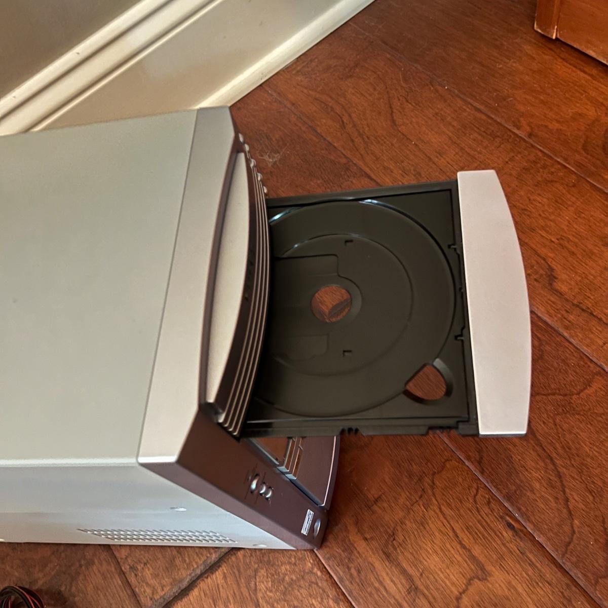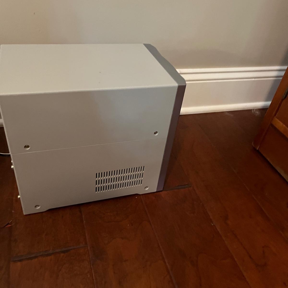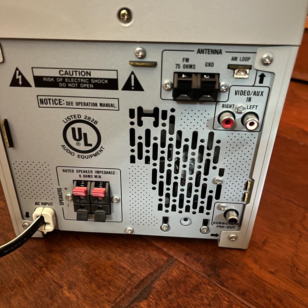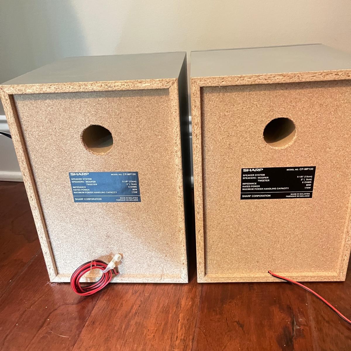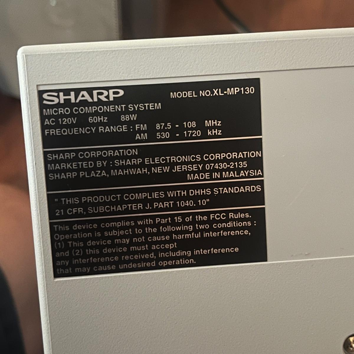 Lot includes a Sharp Micro component stereo with five CD player, AM/FM tuner and cassette player. Stereo powered on when plugged in. Stereo measures 7.5” x 12.5” x 10”H and each speaker measures 7.5” x 9” x 10.5”H.