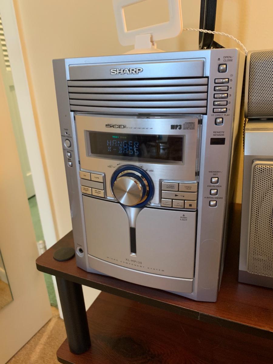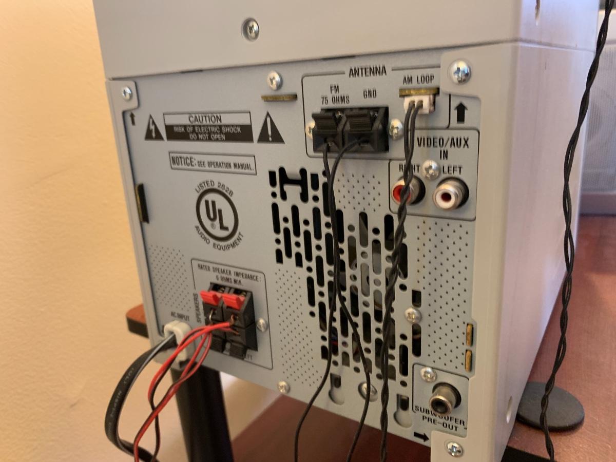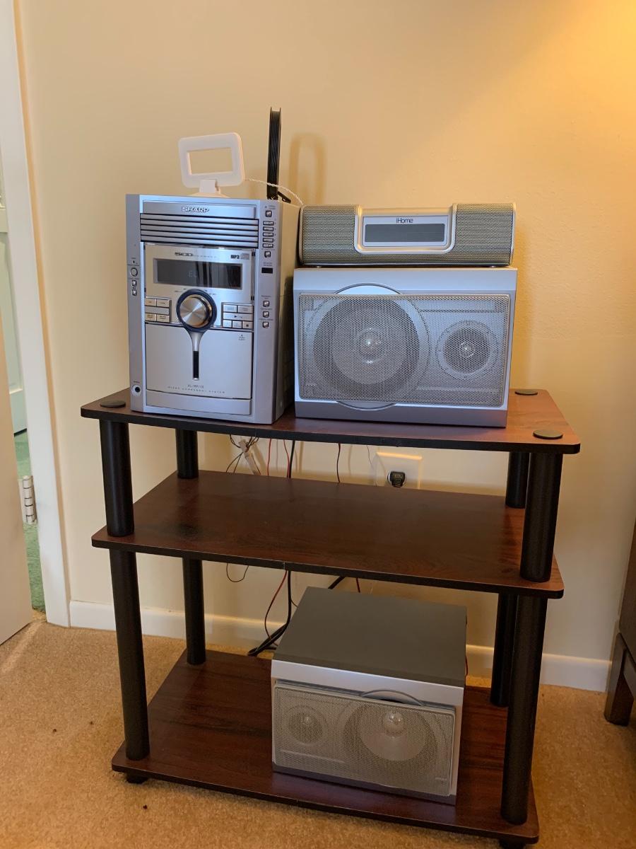 Mini system plays 5 cd's, tape and radio. Has antenna. Good sound. Comes with IHome IPod speaker dock.